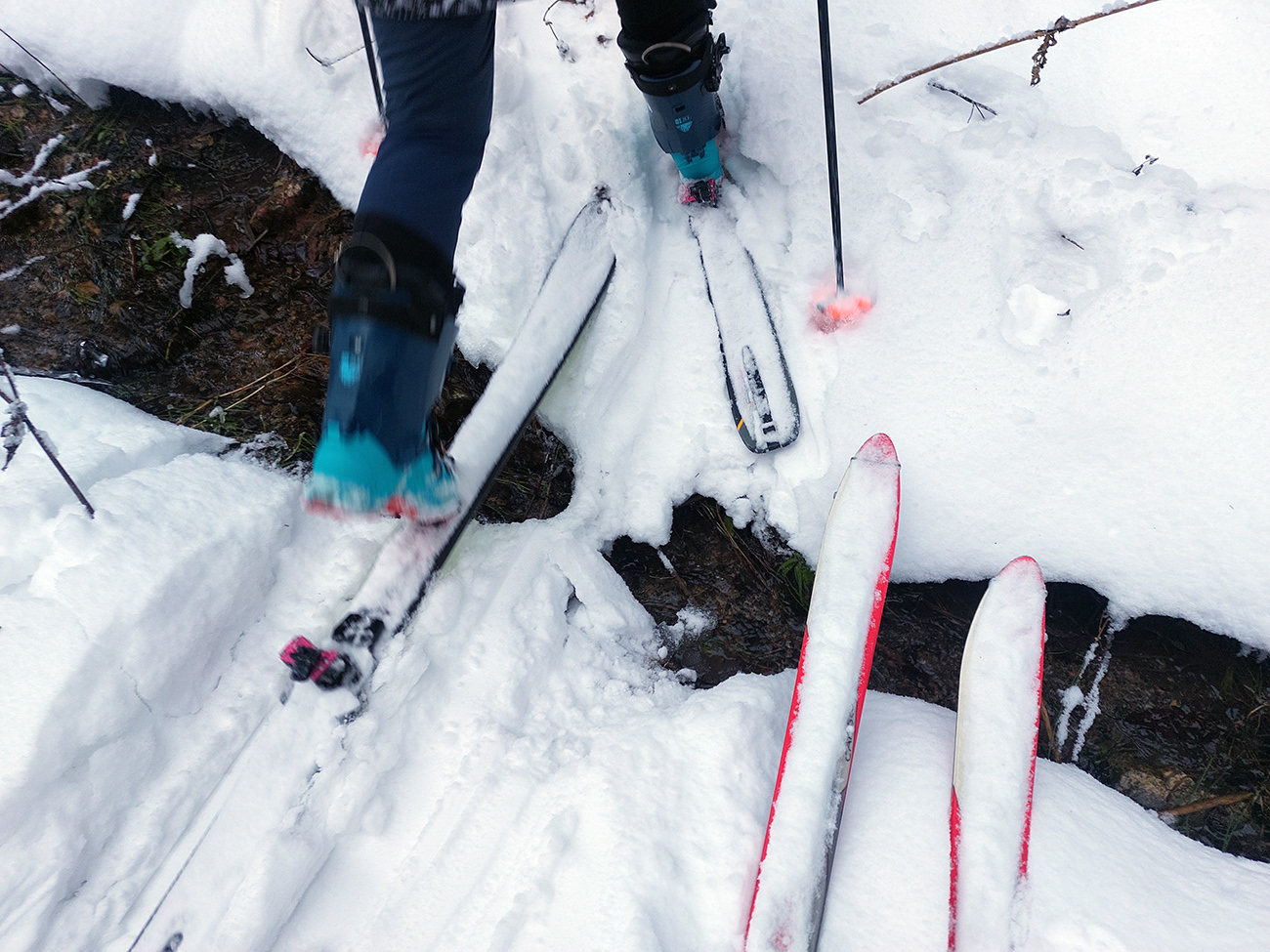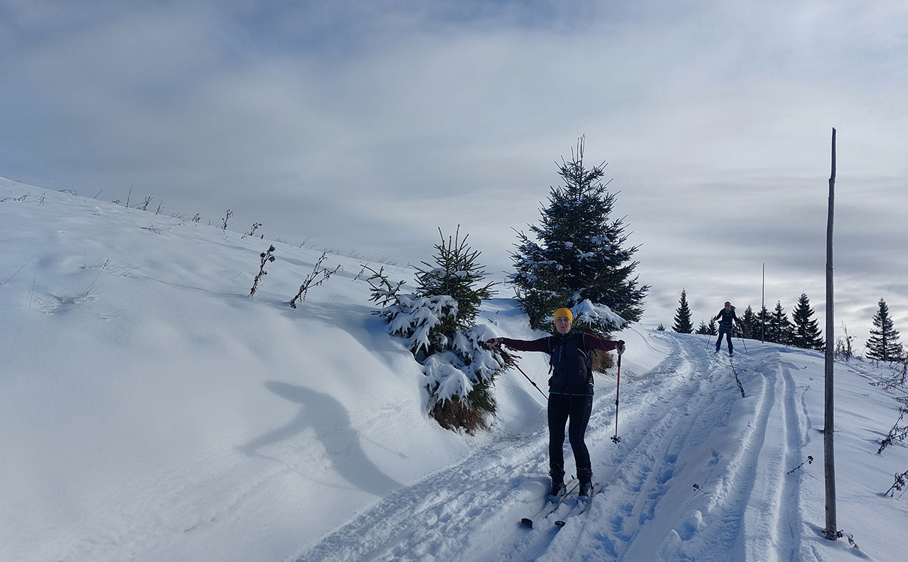 Nad dedinou do lyží! Ale do Sedla pod Sidorovom nie po značke, tá cesta je do štrku odhrnutá. Po vedľajšom chodníku komfortne, popri starom vodovode. Dole už to bude horšie, najmä v strmších miestach, k slnku otočených, vytopené miesta a žiadny podklad.