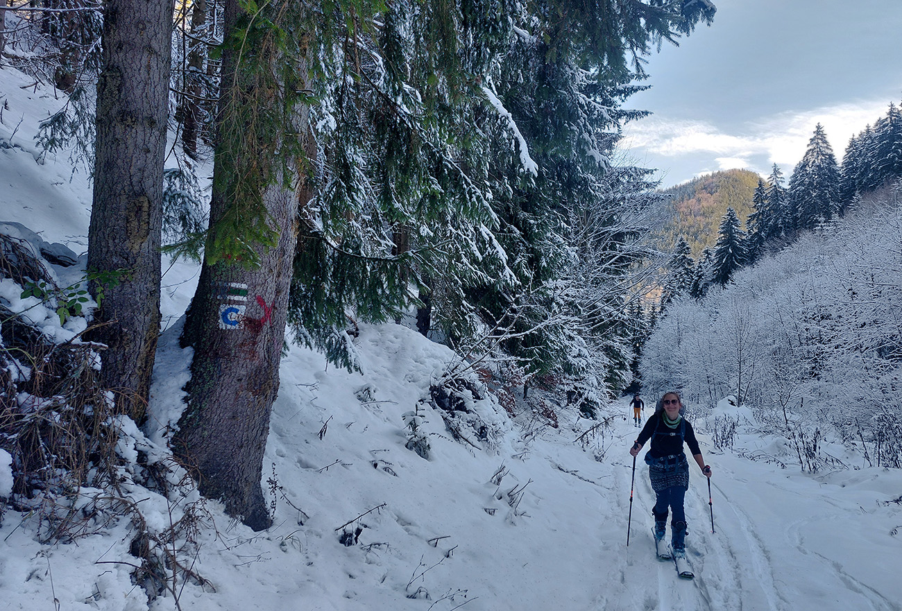 Podarilo sa zahájiť o týždeň skôr ako vlani, aj to je už úspech! A dalo by sa vlastne ešte o týždeň skôr, po prvom poriadnom snežení. Niekde, lebo veľké lokálne rozdiely ten navlnený snehovo-dažďový front priniesol po 20. novembri. Zámer bol ísť na Smrekovicu, lebo v dolinách snehu málo a ešte aj to zlízal lejak, nad lesom zúrila pri prechode frontu víchrica a vydrela všetko do ľadu. Zato Smrekovica a okolie presne v tej ideálnej medzivrstve, dokonca na severných svahoch sme nesmelo dúfali aj v nejaké lyžovateľné prášky na zmrznutom podklade. V Ružomberku snehu nula, ale v hlave ešte zneli správy, ako práve pred týždňom v Bielom Potoku asi ako prví na Slovensku spustili vlek – takže oproti cez dolinu, okolo Vlkolínca, musí byť snehu tiež toľko, že by sa aspoň hore brehom dalo... A aj tak bolo – v smere z mesta na juh snehu okolo cesty rapídne pribúdalo! Čiže zmena plánu, odbočka doprava skôr a reťaze ostali v kufri, lebo na parkovisko pod Vlkolíncom cesta odhrnutá, posypaná, aj keď s ostrovmi ľadu. Ale dalo sa. Takže začalo to romanticky:
