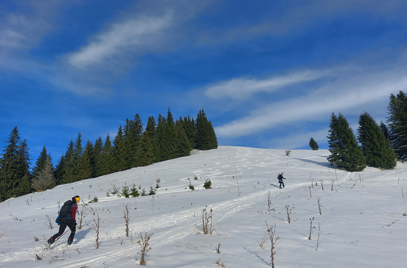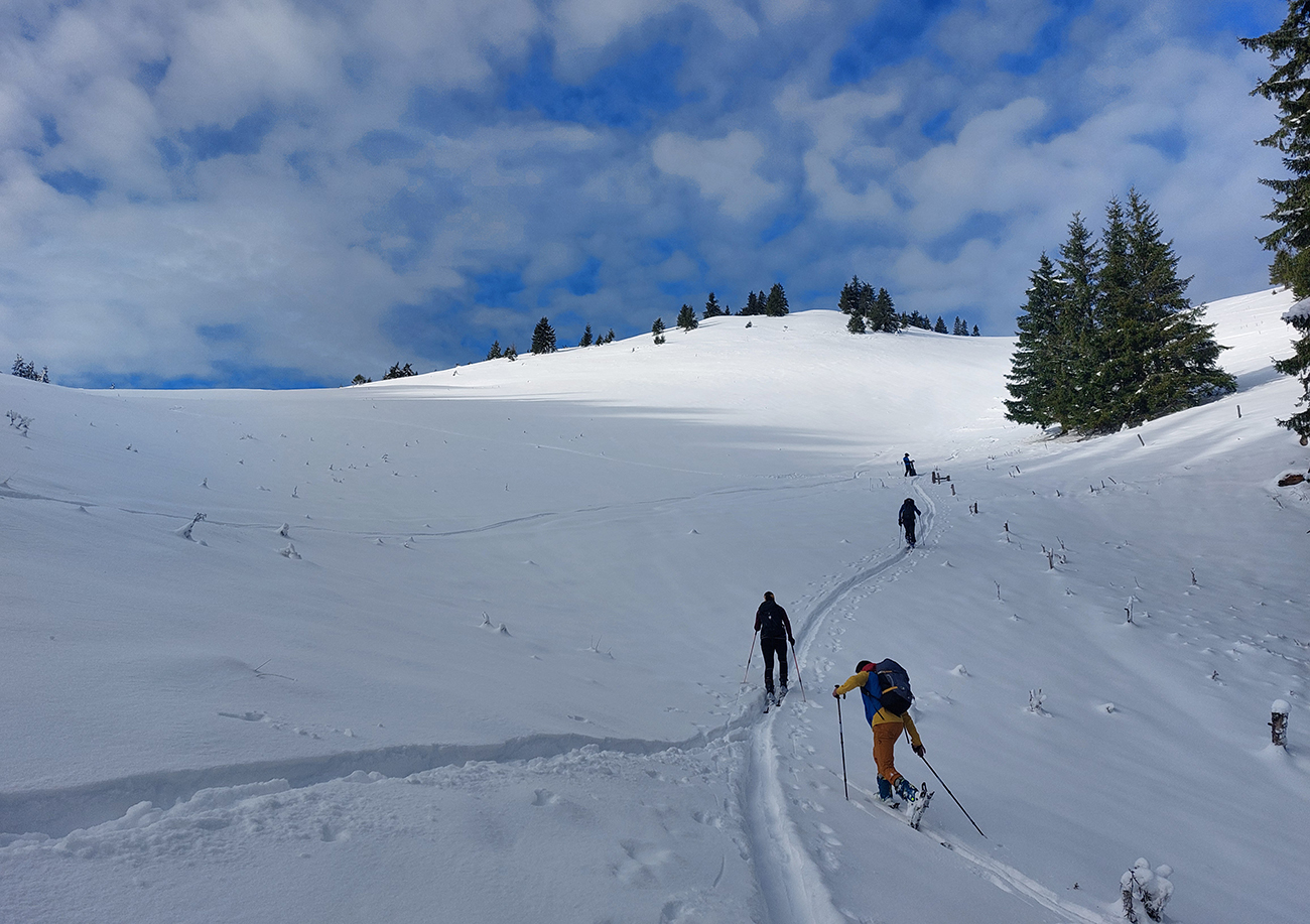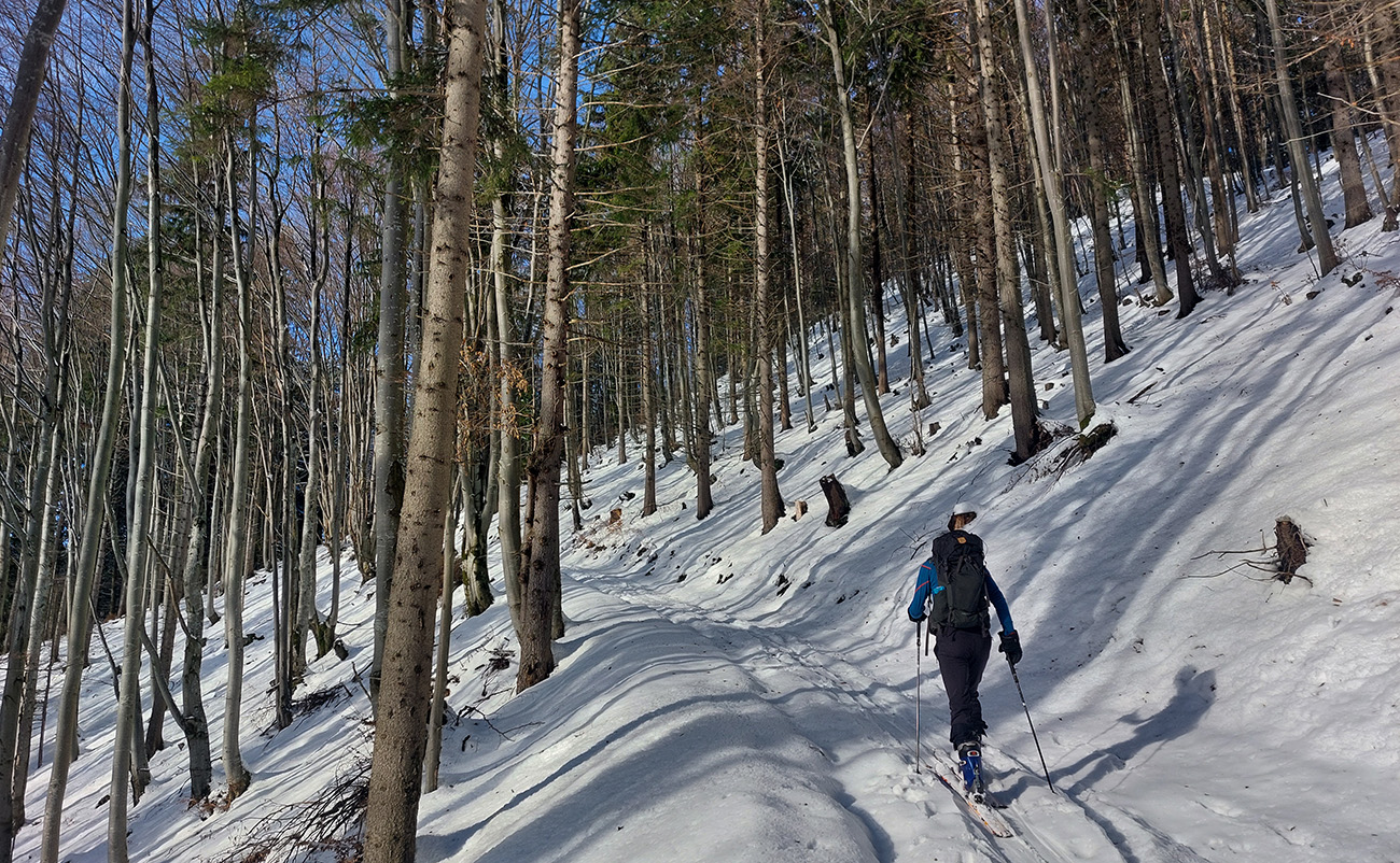 Taaak davaaj po zvážnici do záveru Čutkovskej doliny, že zdola obzrieme možnosti pod Nižným Šiprúnskym sedlom. Zvážnica komfortná, stopa hlboká, vyleštená, prechod cez pramenisko bezproblémový, snehom pekne prikrytý. Len popod padnutý strom sa bolo treba lepšie zohnúť. Alebo obísť.