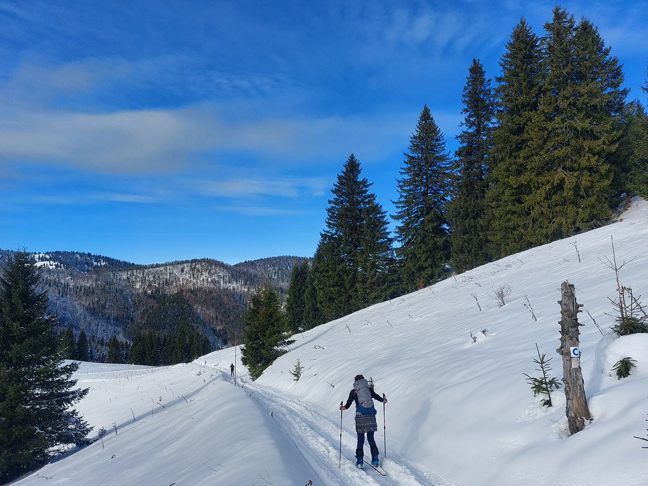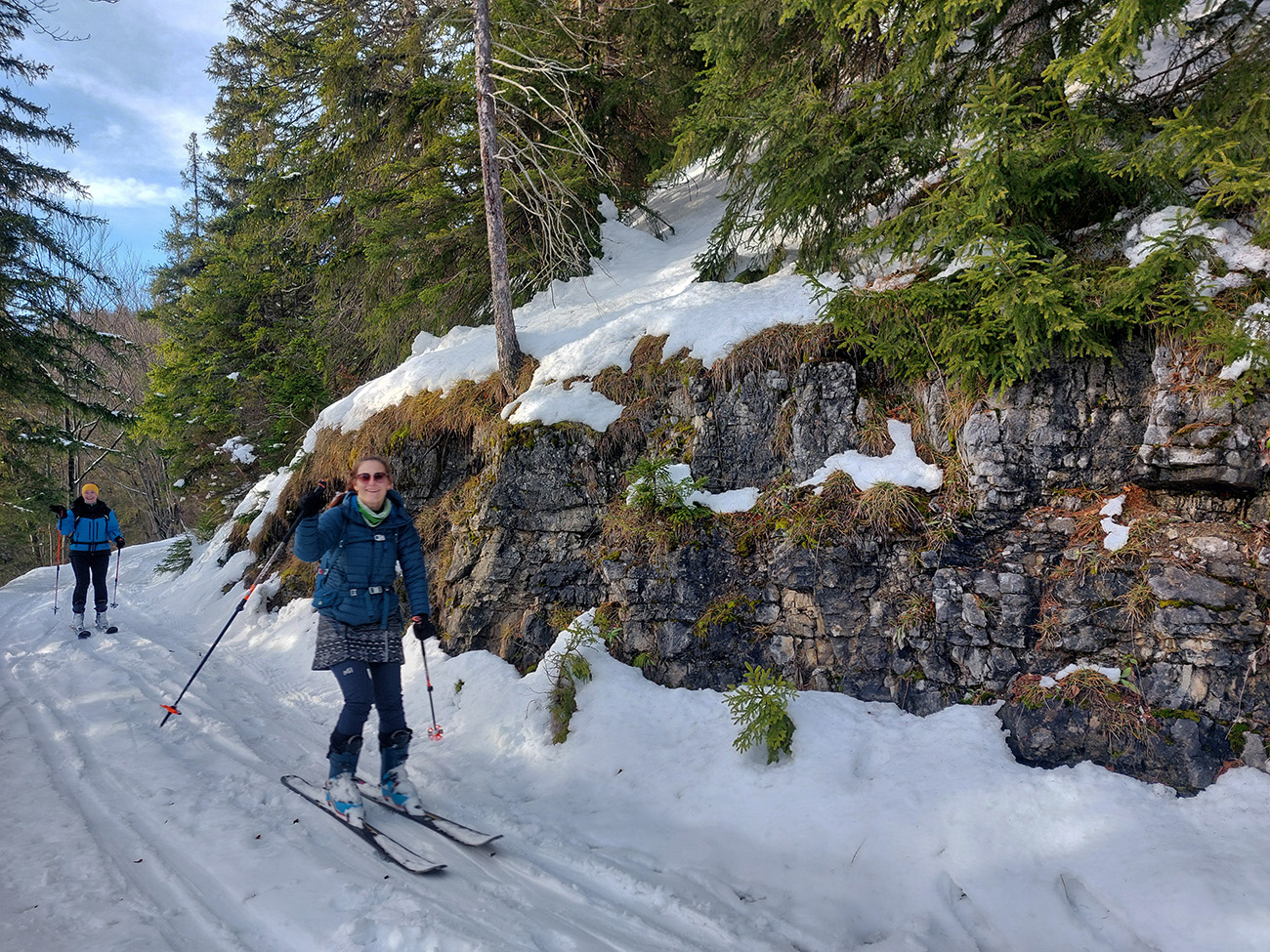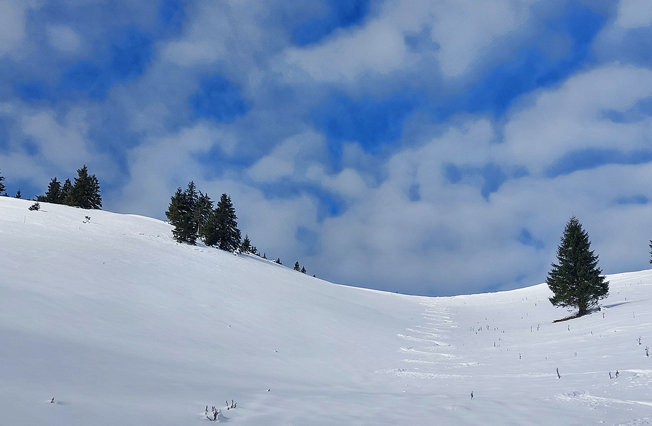 Taaak davaaj po zvážnici do záveru Čutkovskej doliny, že zdola obzrieme možnosti pod Nižným Šiprúnskym sedlom. Zvážnica komfortná, stopa hlboká, vyleštená, prechod cez pramenisko bezproblémový, snehom pekne prikrytý. Len popod padnutý strom sa bolo treba lepšie zohnúť. Alebo obísť.