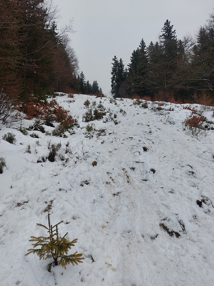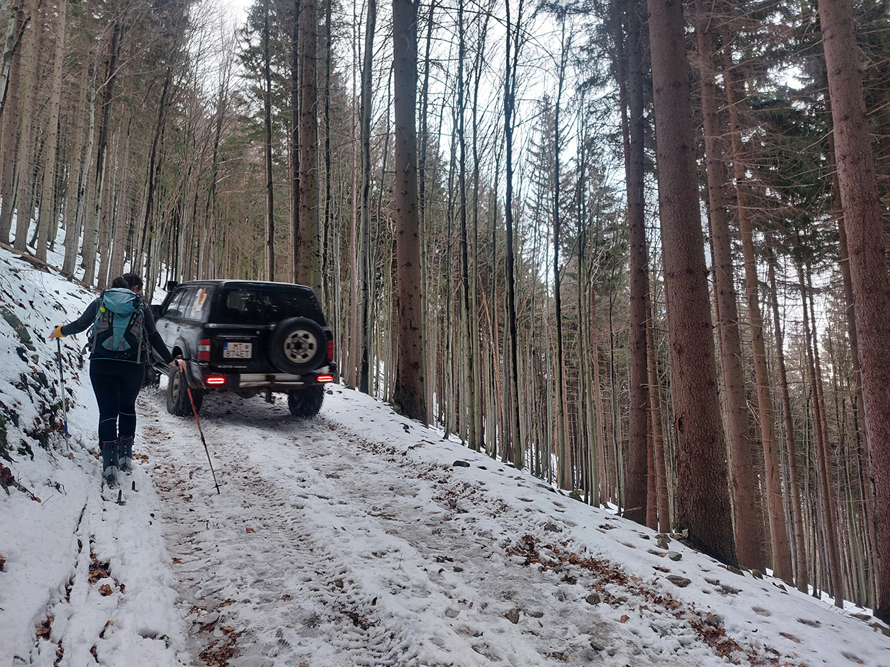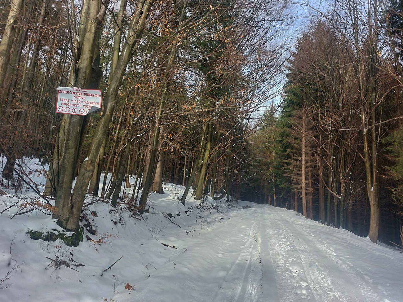 Lenže ako sme stúpali, nieže by bolo menej snehu, ale akosi pribúdalo kameňov. Na lúke nad dedinou ešte pohoda, krtince skryté, ale na ceste z Trusalovej nejaký moc bodkovaný podklad a ešte horšie to bolo medzi Zajacovou a zákrutou. Ale sme sa zaťali, že neprenášame, veď kameňačky znesú a do kopca to predsa nevadí. Nad zákrutou (po drevosklad) ešte väčšie zúfalstvo, ale to lístie vo svahu vedľa cesty bolo našťastie dosť jemné voči pásom.