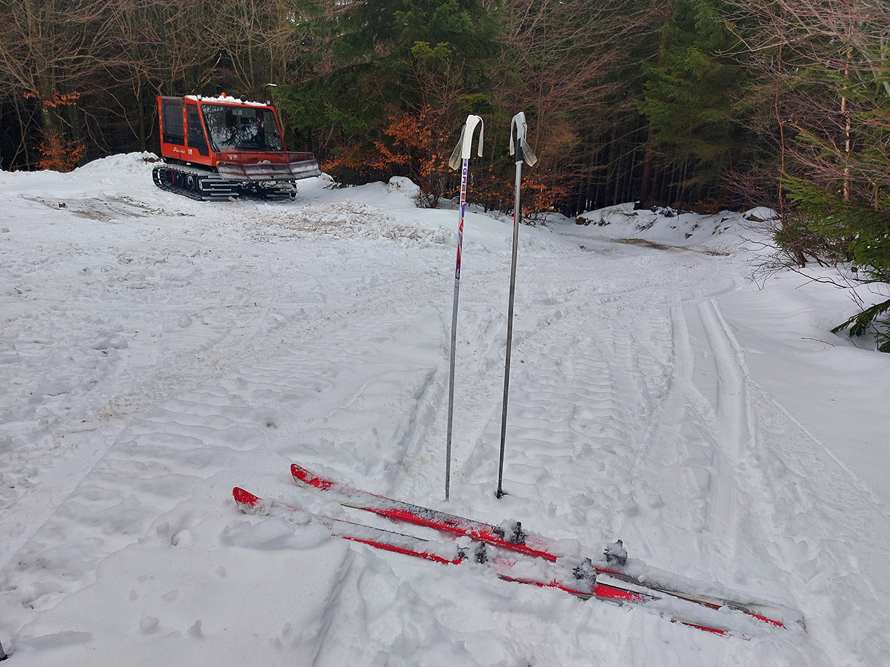 V noci z nedele na Troch kráľov nadzigalo snehu v Turci neúrekom, asi 2,5 cm. Predtým pár dní asi 1,5 cm. Aj by som si povedal, že počkám, kým to množstvo sadne, ale zrazu volá J.J., že jej volal dáky kamoš, že na Chleb SA DÁ OD PARKOVISKA na Zajacovej a že horná polka Generála sa dá aj zlyžovať! Pretože zmysel pre nezmysel mám dobre vyvinutý, neváhal som a čuduj sa svet, o hodinu už sme sa obúvali do lyží pri posledných domoch v Šútove!!! V podstate som sa obetoval, aby nebola len sama za divnú. Ale fakt, aj viac tam bolo (možno až 4,2 cm), čerstvého, už síce mokrého, ale hore ulicou od áut ujazdeného. Žiadny základ? Žiadny problém! Budeme hviezdy internetov a keď to dáme „kártukár“, to bude sláva! Akurát ktovie prečo mi chodili po rozume spomienky, ako som sa kedysi smial maďarskému lyžiarskemu zájazdu, ktorý sa na Malinom Brde učil oblúčiky na námraze.