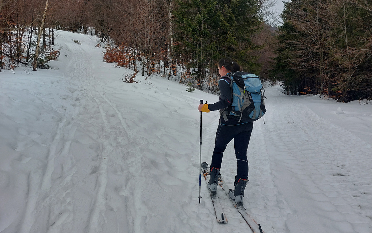 Jeden exemplár pred nami išiel z drevoskladu doľava, strmo po skialpovom chodníku, a potom hore hovoril, že na tom lístí to ani moc nepodklzovalo. My lenivší sme sa vybrali rovno po ceste, kde koľaje od áut, zásobujúcich chatu, vyzerali použiteľne. Väčšinou aj boli, no...