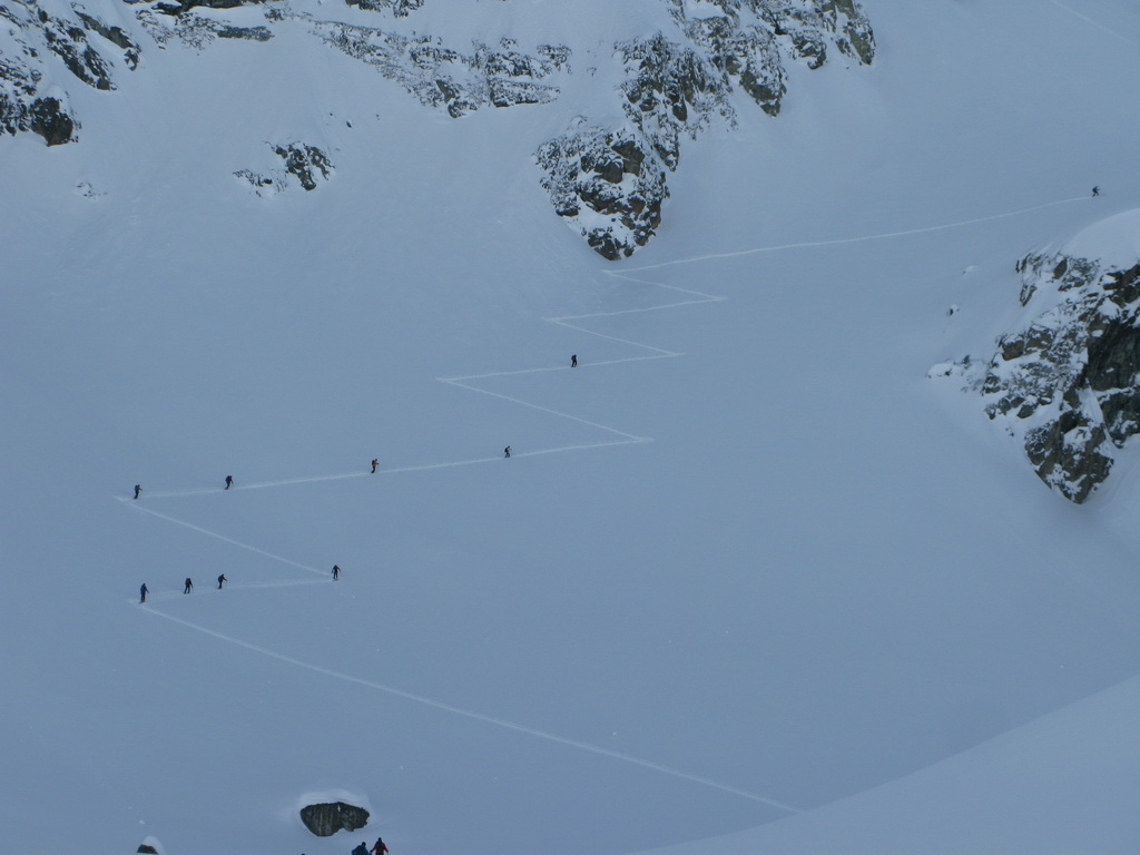 Hneď od parkoviska na mieste zvanom Alp Guglia sa začína terén dvíhať a stopa vedie popri veľkých balvanoch svahom hore. Nasleduje traverz vľavo, až prídete na úpätie Piz Polaschin a tu sa serpentínami stopa tlačí doprava hore. Pokračuje sa miernym chrbtom hore, až sa ocitnete v prostriedku kotlovitej doliny. Niečo tu chýba... Áno, z ľadovca už veľa neostalo, ale aj tak ten zvyšok tvorí prírodne chladenú zjazdovku, po ktorej sa dostanete až do sedla k malej meteorologickej stanici. Tu pre mnohých túra končí. Za dobrých podmienok sa dá pod sedielkom ísť viac vpravo na hrebeň a po ňom na vrchol. Aj podľa sprievodcu tu lyžiarska túra zvykne končiť. Po hrebeni sa však dá pokračovať ďalej. Pozor ale, všade sú nebezpečné preveje. Západná stena je vysoká a kolmá!