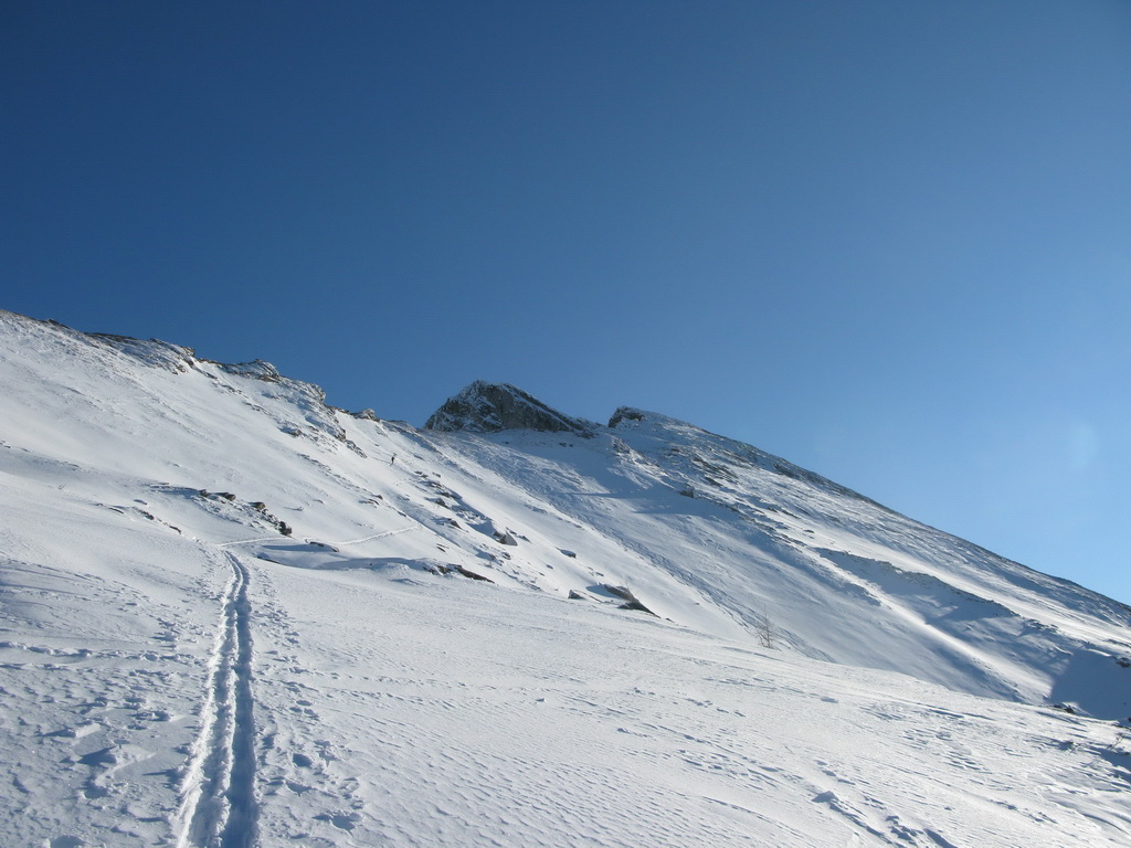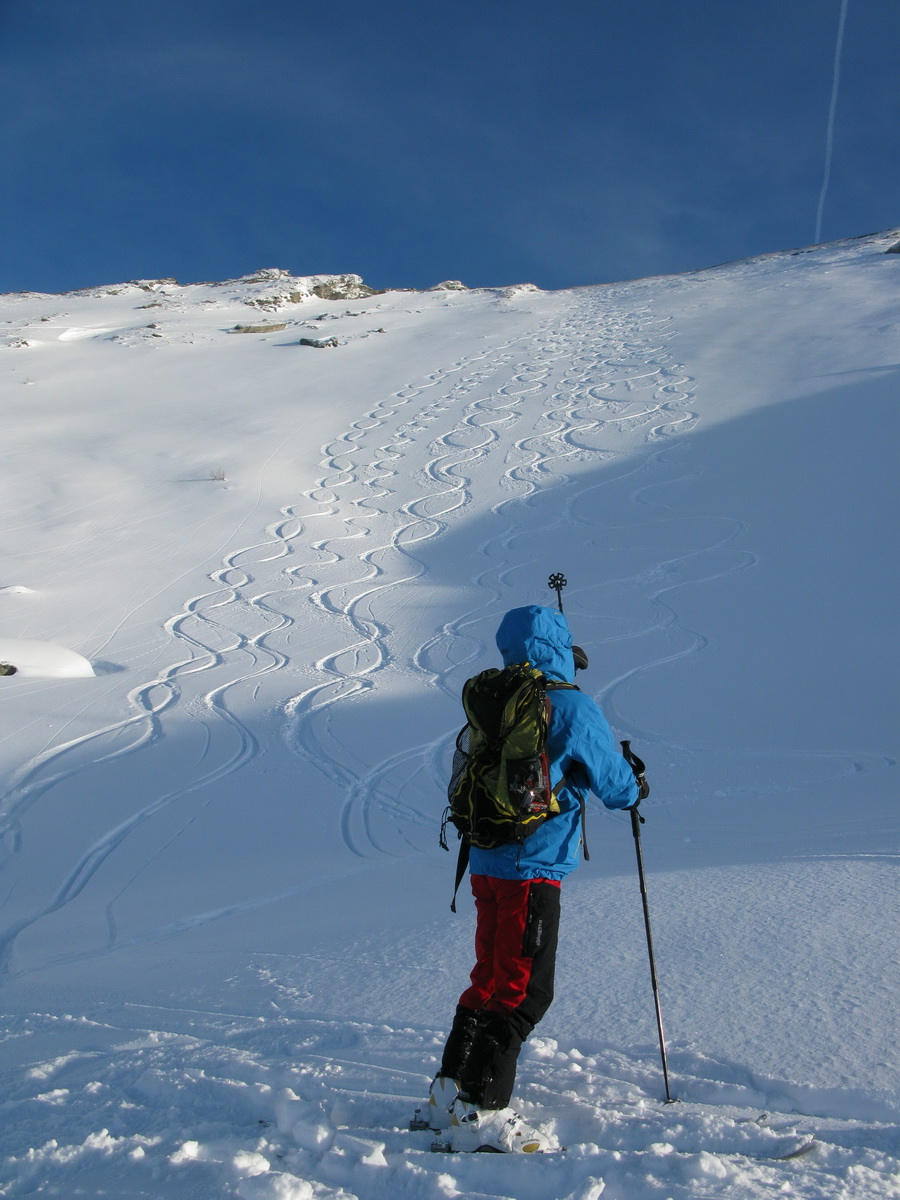 Hore šliapeme po červenej zjazdovke, strmú čiernu si necháme na zjazd. Na konci 1000 v.m. šliapania sa necháme prehovoriť pekne natiahnutou stopou vedúcou pod vrchol Graukogelu. Stopa končí na vyfúkanom hrebeni, ešte kus od vrcholu. Prašanom nabitý žľab sľubuje predsa len iný zážitok ako zjazdovka, pod ním ešte pekný kúsok prašanu pomedzi stromčeky, kým sa pripojíme na čiernu zjazdovku.