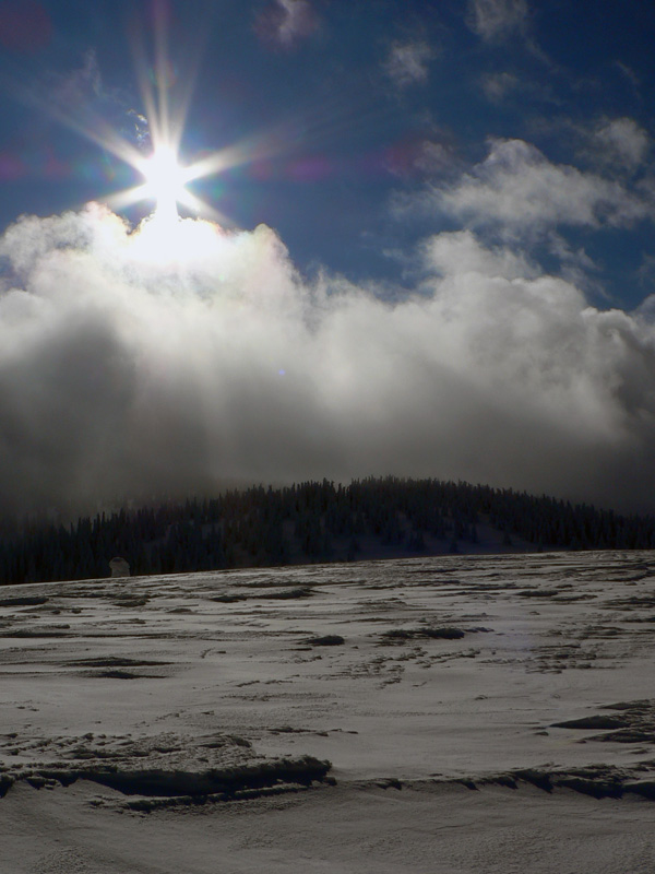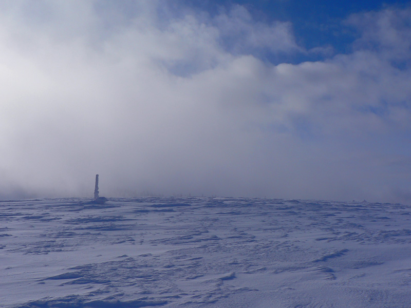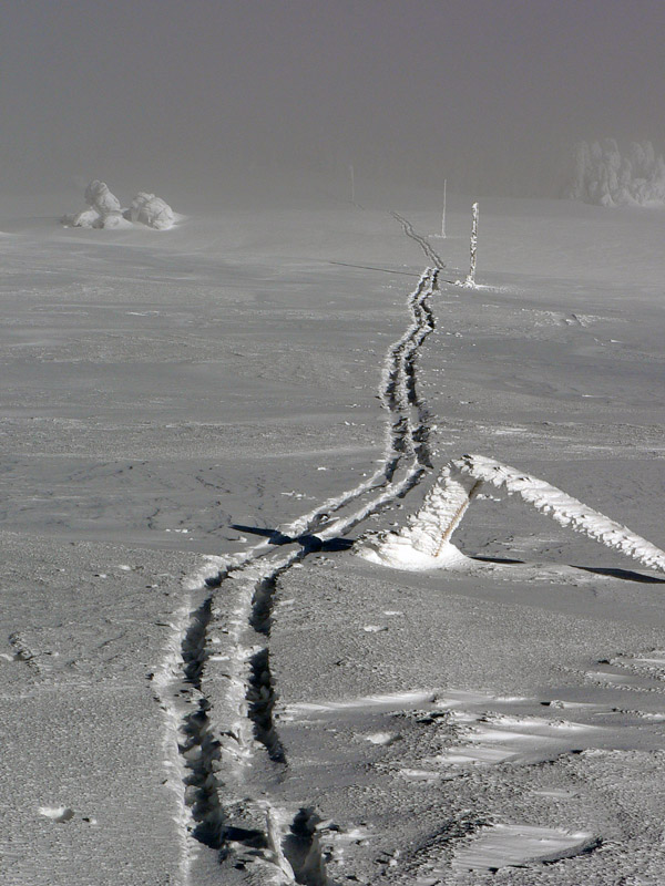 Na hrebeni biela tma, ale aspoň nefúka. Tyčové značenie v lese ledva trčí, záveje majú aj zo tri metre, stopa žiadna priamka, kľučkovať treba riadne pomedzi tie hory snehu. Na holých Šíravách naopak vyfúkané do ľadu, ale tu jediný raz vychádza slnko, tak chytro vyťahujem foťák.