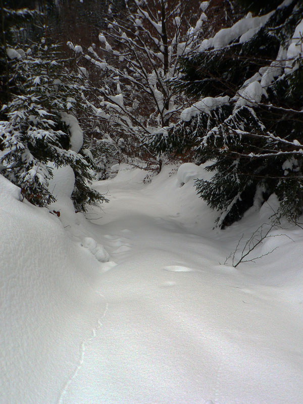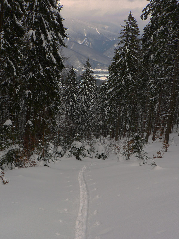 V polovici januára konečne poriadne napadlo aj v doline: z domu rovno v lyžiarkach, 10 minút popri Turci, prebehnem večne zapchatú a teraz aj nasolenú „I/18“ a obúvam sa do lyží. Chodník popri potoku, ktorý pripomínal prales, prebehli na jeseň buldozérom, takže až na pár (snehom ohnutých) kríkov v ceste nič nestojí. Čaká ma rovných 1000 výškových až na Krížavu k vysielaču. A výživných - véééľa nového snehu a je sobota ráno, kto by už len šiel predo mnou?