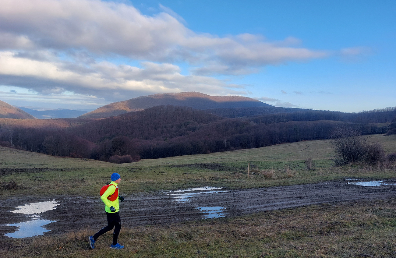 Takže z Ilavy plynulé stúpanie až pod Sokol po veľmi príjemnej lesnej ceste až chodníku (odkedy sme sa oslobodili od asfaltu) – len nie po žltej značke, ale vyššie nad ňou po takej paralelnej lesnačke. Na Sokol potom strmo po vlhkej hline a lístí. Odmenou bol výhľad na slnko vyliezajúce spoza Vápča rovno do mrakov.