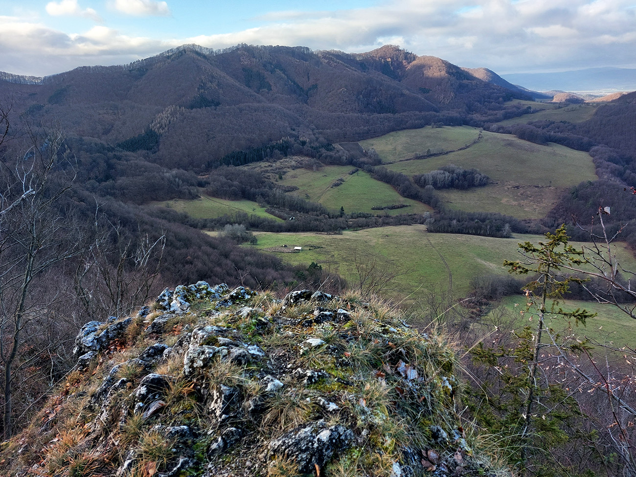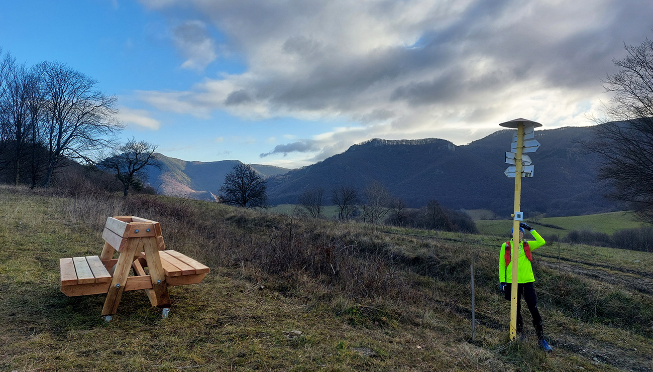 Ešte posledná krátka zachádzka na vyhliadku bola v pláne – na Jeleniu skalu. No tá ledva trčí nad stromy, čiže skoro žiadne výhľady. Akurát masív Butkova oproti trčal, a ten sme teda poctivo obchádzali a obzerali skoro už od začiatku. Ale na ceste ďalej sme našli nejaké trochu zanedbané miestne značky a tie nás celkom logicky vyviedli na lúky nad Belušou, skoro podľa plánu.