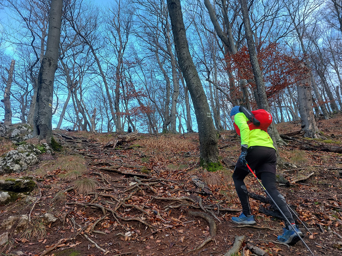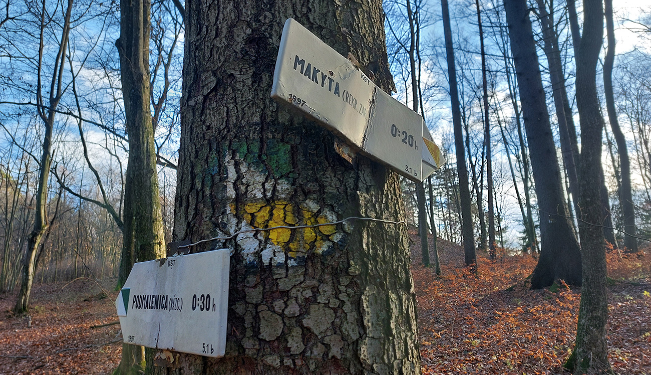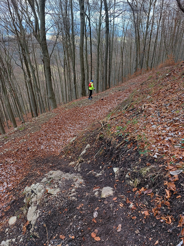 Zostup dole prudký – najprv ešte po hrbatom hrebienku celkom príjemný, aj pre oči, len potom čím strmšie, tým šmykľavejšie a zákernejšie – pod klzkým lístím klzké blatko, a ešte aj tie poskrývané slizké konáre, no mňam! Nižšie na zvážniciach zas tie kilové závažia na botách. Nad Slopnou sme nadobro opustili značky, a že dole do Beluše prerazíme po lesných cestách. Len je ich tam toľko, že navigácie pracovali naplno.