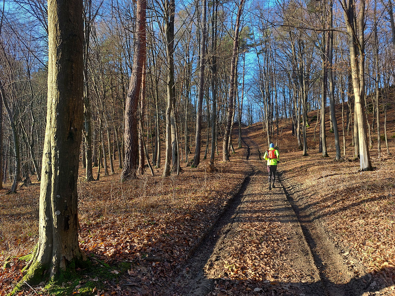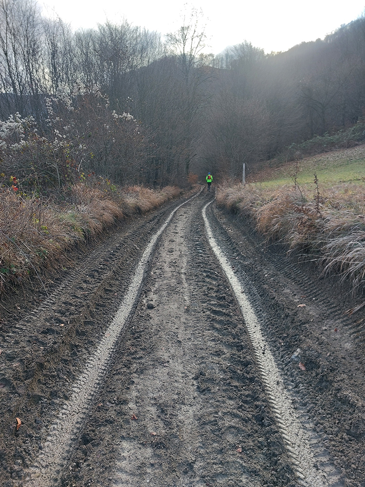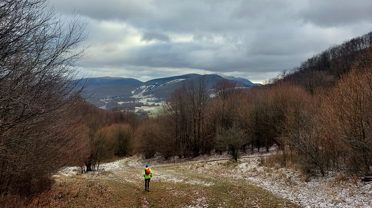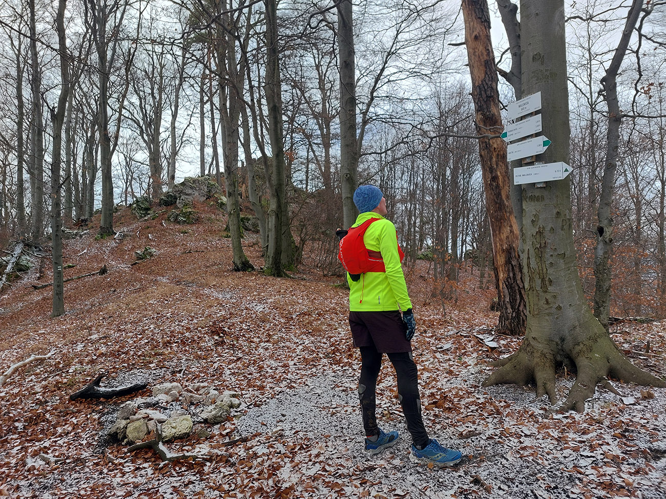 Zostup dole prudký – najprv ešte po hrbatom hrebienku celkom príjemný, aj pre oči, len potom čím strmšie, tým šmykľavejšie a zákernejšie – pod klzkým lístím klzké blatko, a ešte aj tie poskrývané slizké konáre, no mňam! Nižšie na zvážniciach zas tie kilové závažia na botách. Nad Slopnou sme nadobro opustili značky, a že dole do Beluše prerazíme po lesných cestách. Len je ich tam toľko, že navigácie pracovali naplno.