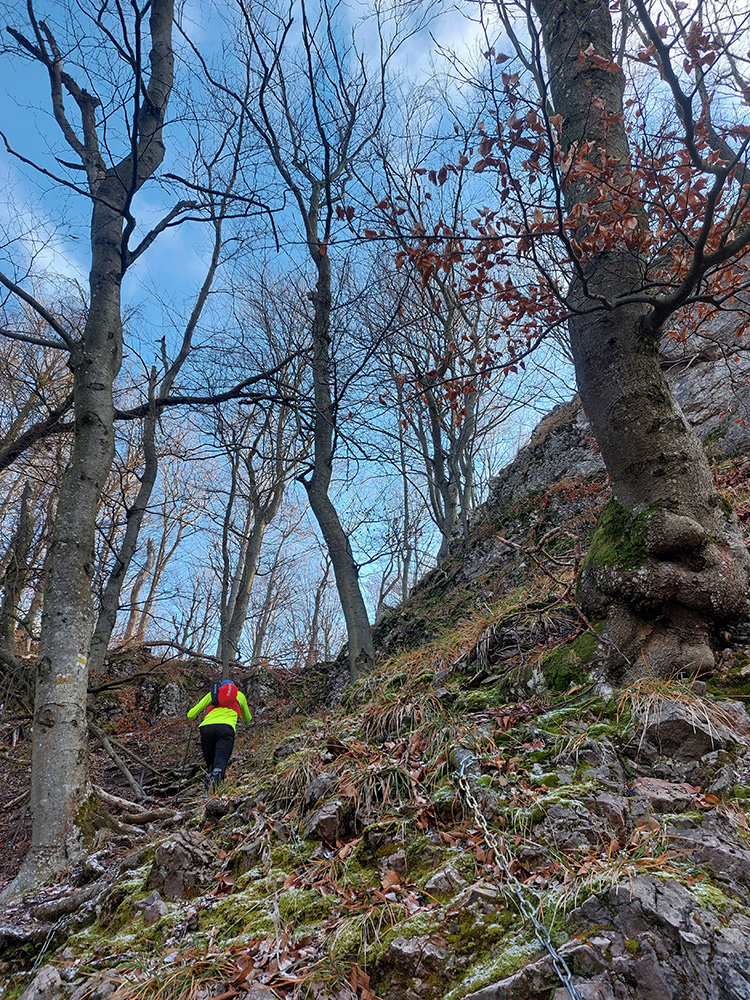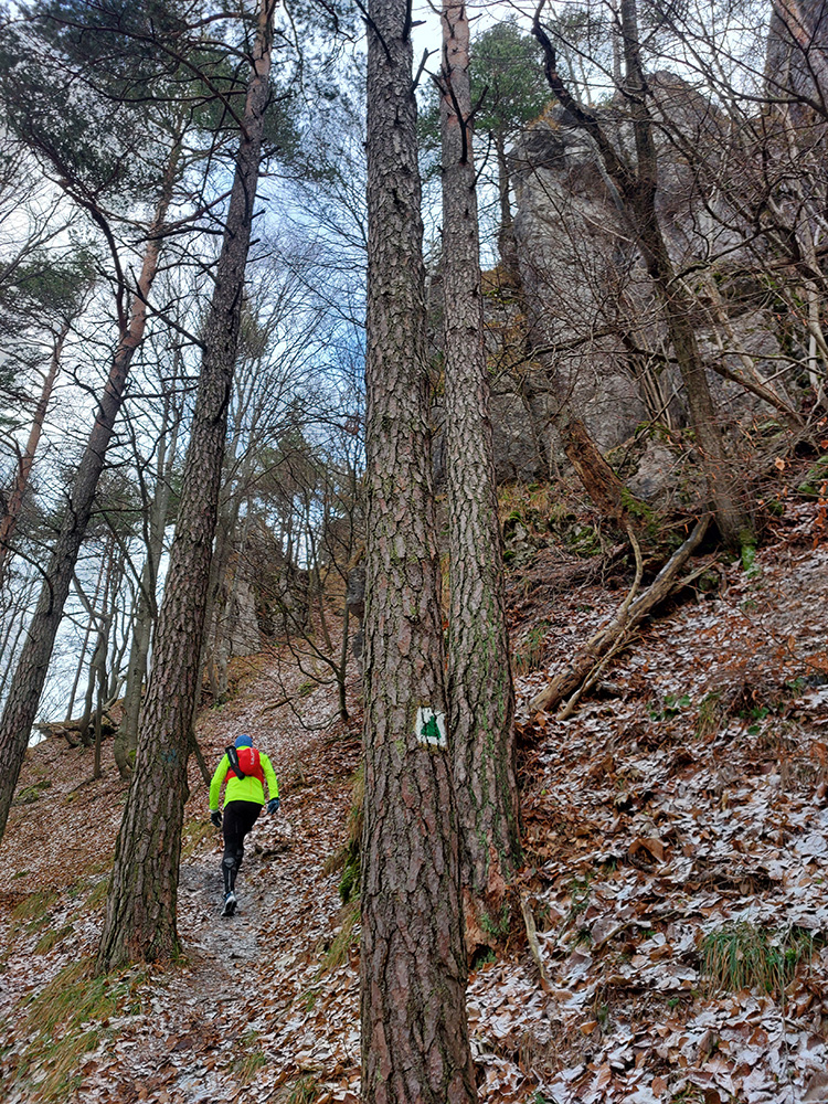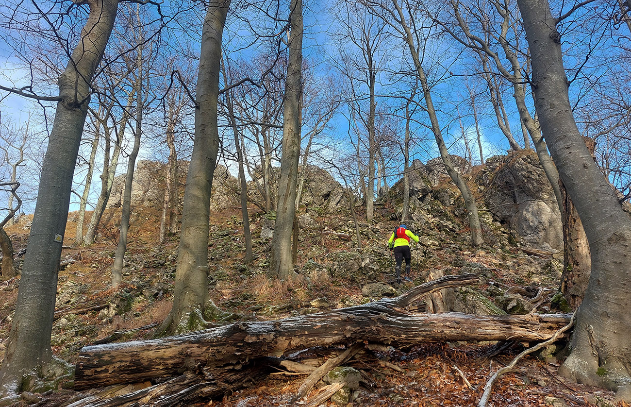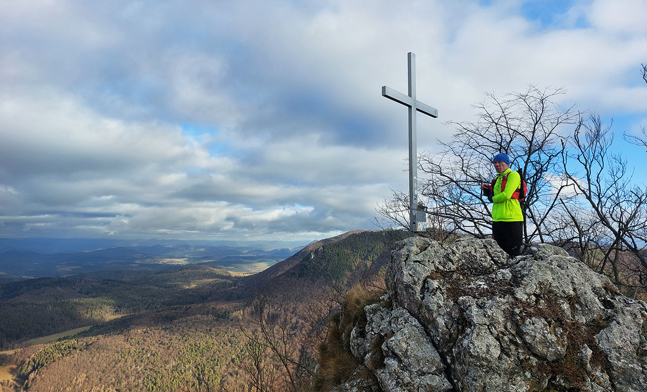 Zo spomínanej lesnej asfaltky pod Rohatou skalou zrazu žltá zavelila vpravo vbok a už sme sa plazili hore strminou, navyše v závejoch lístia alebo po klzkom blate, no rozkoš. Potom výhľadová skalka na predýchanie, ešte na záver „rohatá ferata“ (alebo teda pomocné reťaze na vrcholových bralách) a odmenou boli znovu rovnaké výhľady na Považie ako z tej skalky, akurát že „z vyššieho poschodia“.