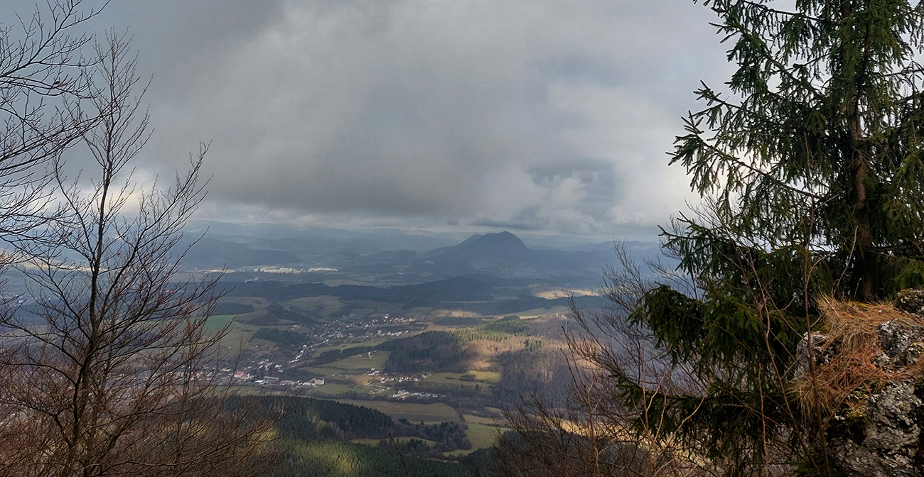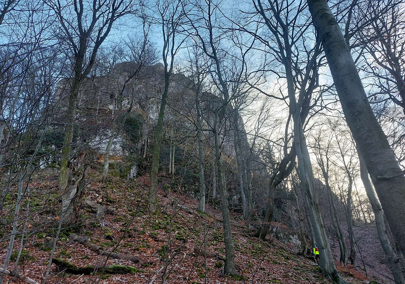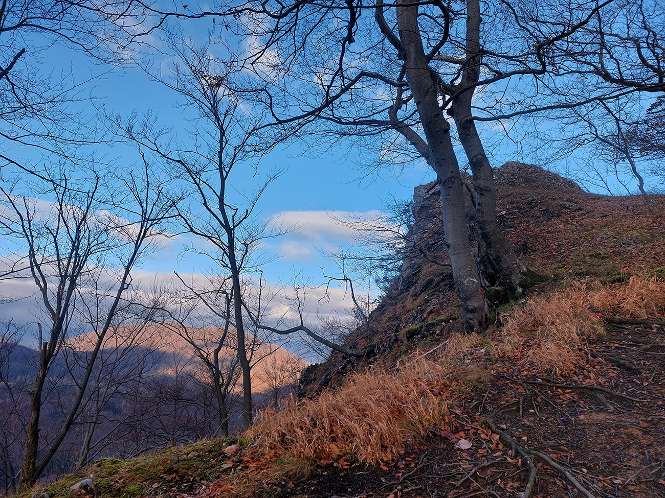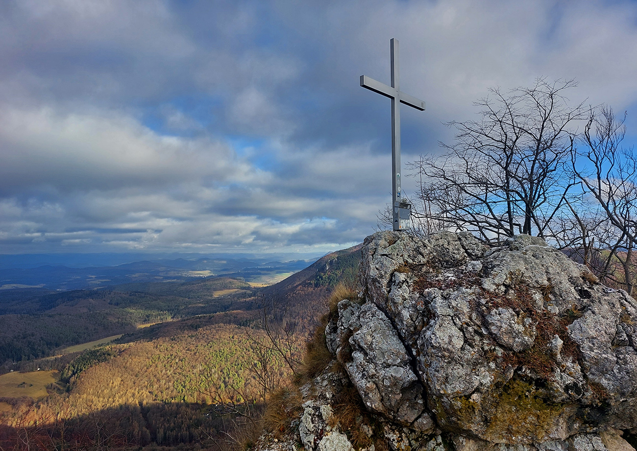 Zo spomínanej lesnej asfaltky pod Rohatou skalou zrazu žltá zavelila vpravo vbok a už sme sa plazili hore strminou, navyše v závejoch lístia alebo po klzkom blate, no rozkoš. Potom výhľadová skalka na predýchanie, ešte na záver „rohatá ferata“ (alebo teda pomocné reťaze na vrcholových bralách) a odmenou boli znovu rovnaké výhľady na Považie ako z tej skalky, akurát že „z vyššieho poschodia“.