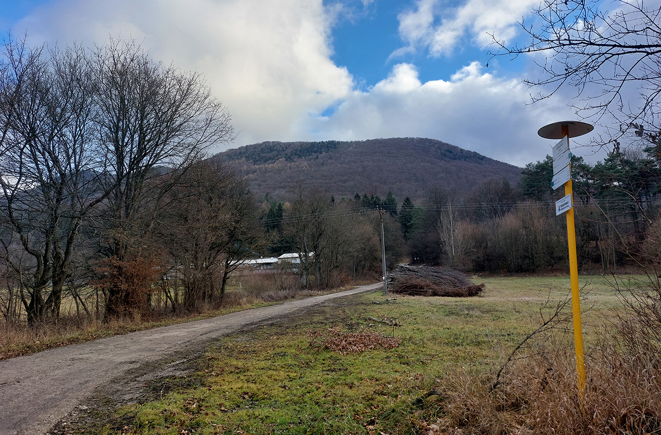 Cestou ďalej po žltej značke do Mojtína sme si ešte odskočili na vedľajšie bralo, potom už šotolinové zvážnice a pred dedinou na ježka vypasená tráva. Medzi domami sme opustili žltú značku hneď pri ihrisku, aby sme rýchlejšie utiekli z asfaltu a netrepali sa hore celou dedinou. O chvíľu už sme stúpali po príjemnej lúčnej ceste paralelne so zelenou značkou, aby sme sa na ňu plynulo napojili pod vstupom do lesa. Za nami miestne zjazdovky, stále nepatrične zelené: