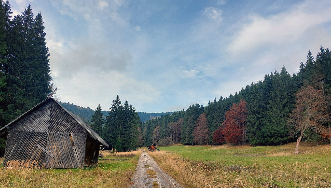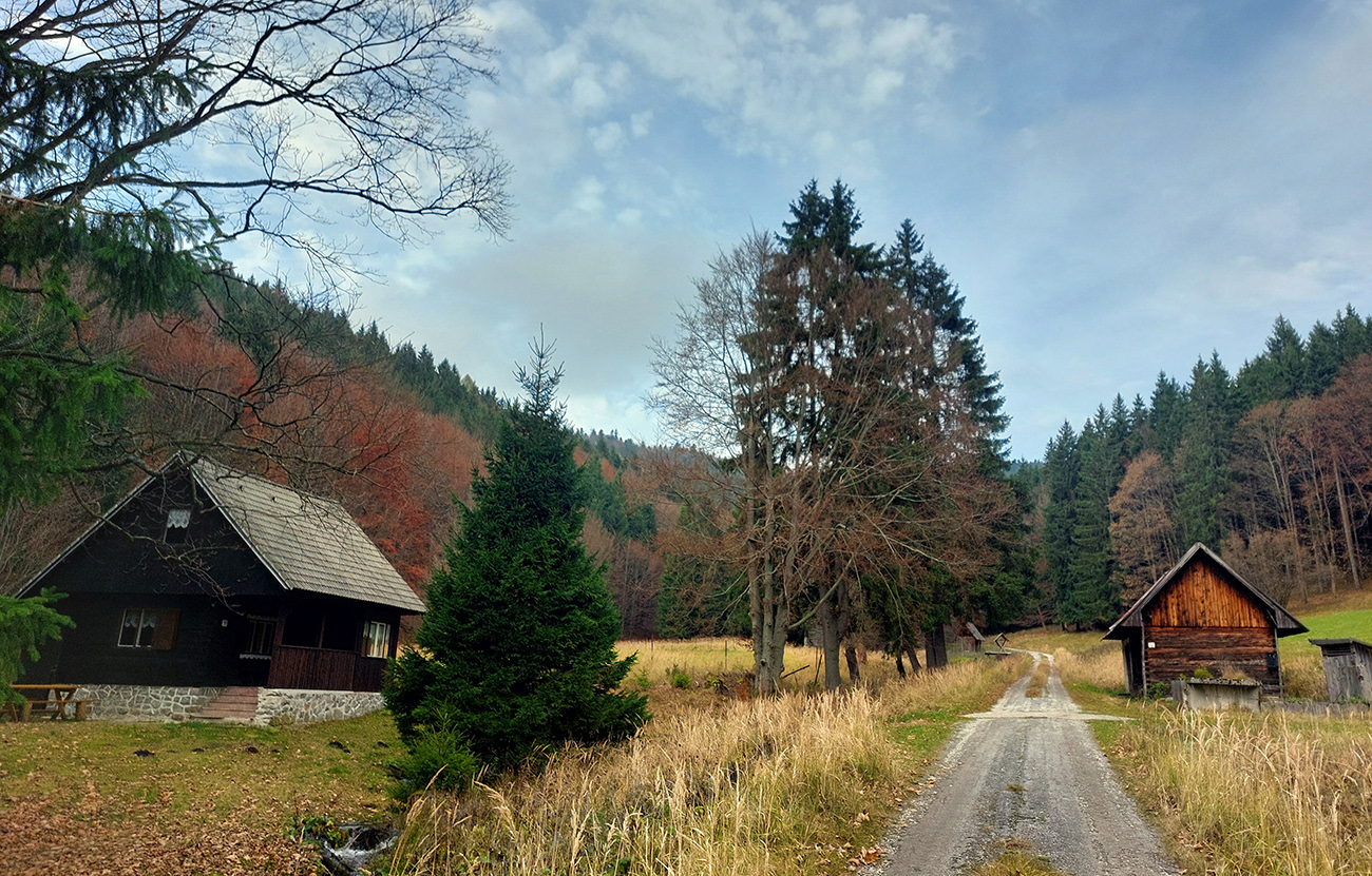 Taaak, Široký peň po tretí raz a naposledy, odbočil som odtiaľ doprava dole, do doliny Ružovej. Po bielom podklade, ako inak. Dole som si tiež dal krátku zachádzku - doľava, hore dolinou potoka Javorovec. Cez pekné lúky s lesníckymi chatami, až kým cesta zo šotoliny neprejde na trávu, pristrmí sa a skončí pri potoku.