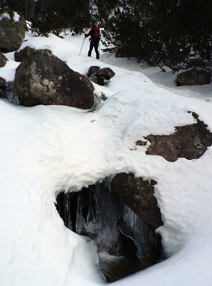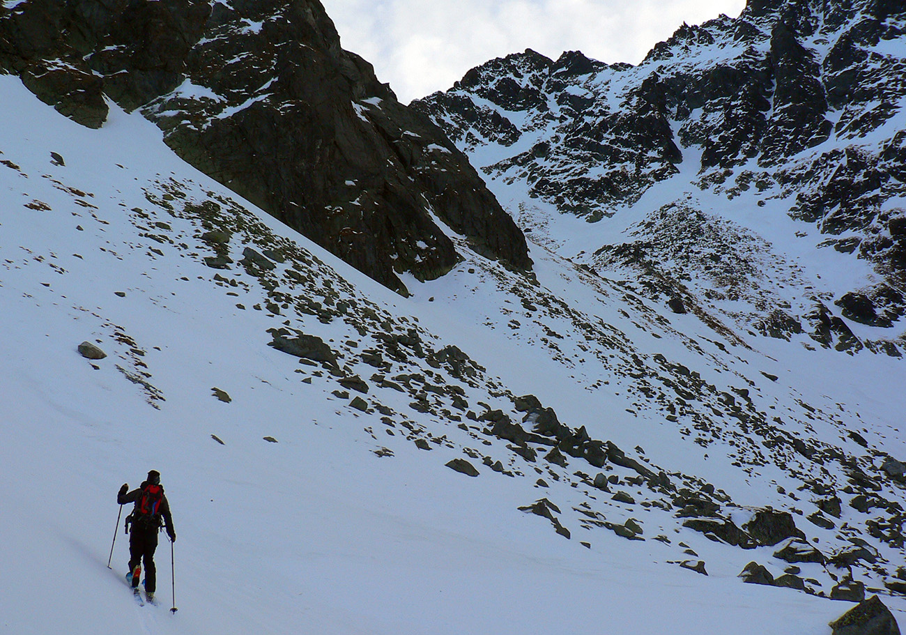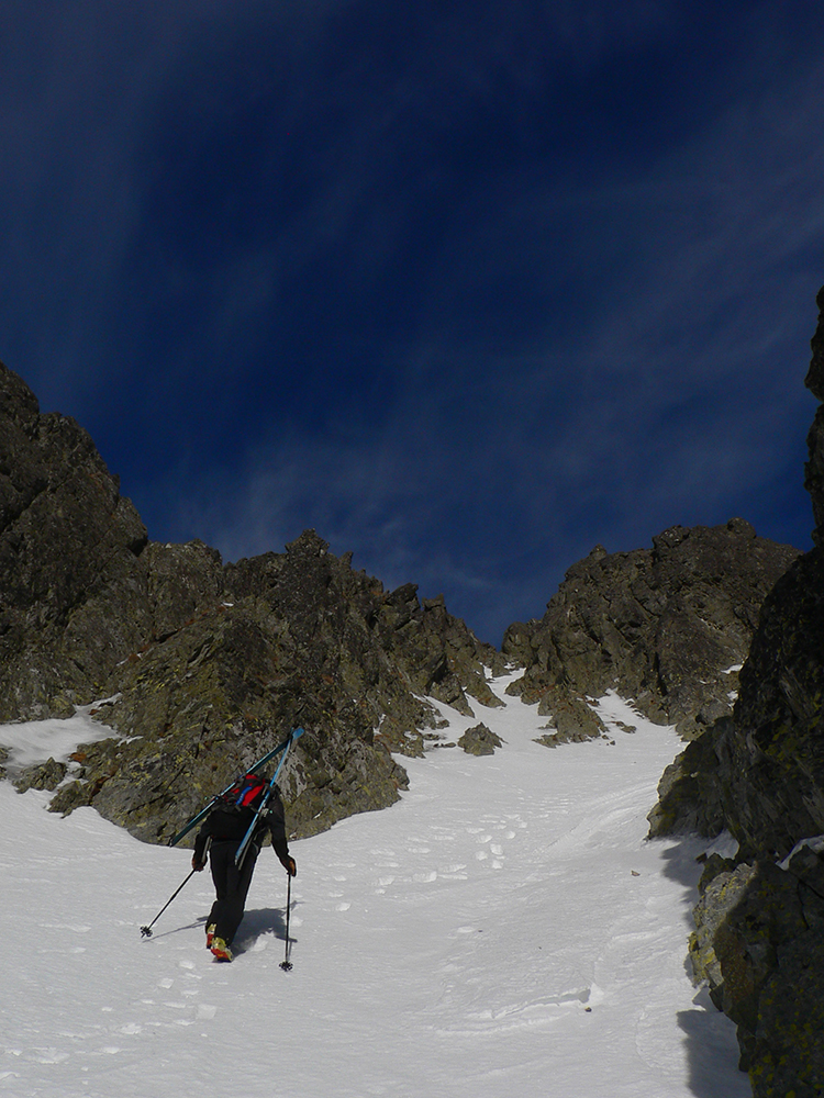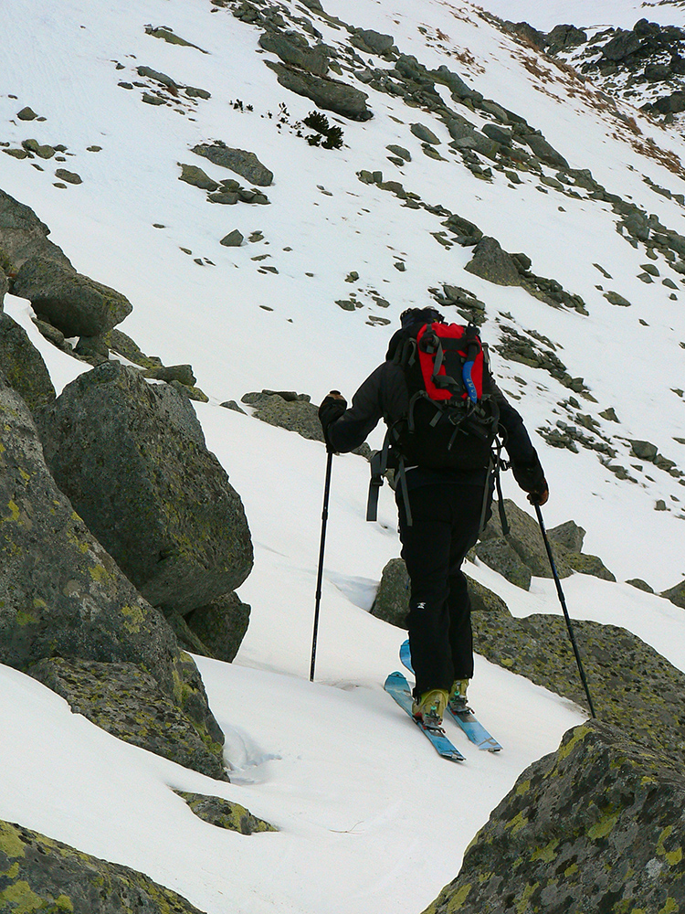 Smerujeme z Rovne pod Železnú bránu, už na pásoch. Podklad nie je klzký ľad, ale betónový šmirgeľ, ktorý suprovo drží lyže. Dá sa preto vyliezť kolmo hore aj strmý sklon na konci Rovne. Popod steny nad Ľadovým plesom už ale ideme aj na haršajzniach, lebo v strmých traverzoch za nami stopa neostáva, lyžu nezasekneme. Zato štrikovania pomedzi šutre si užívame do sýtosti. Záver do Železnej brány je samozrejme tiež tvrdý, lyže na hrb! Ale mačky netreba, nie je to šmykľavé, aj schodíky sú. A keď nie sú, vykopeme si, teplota len málo pod nulou.
