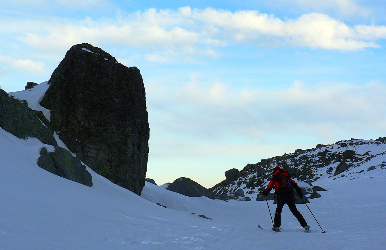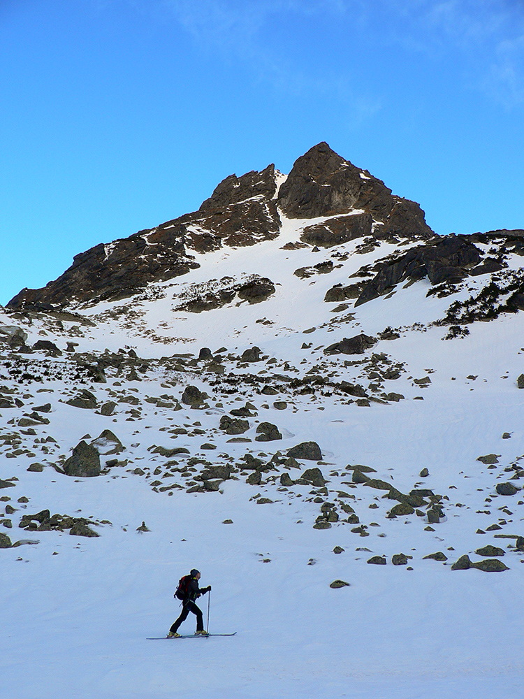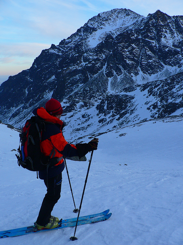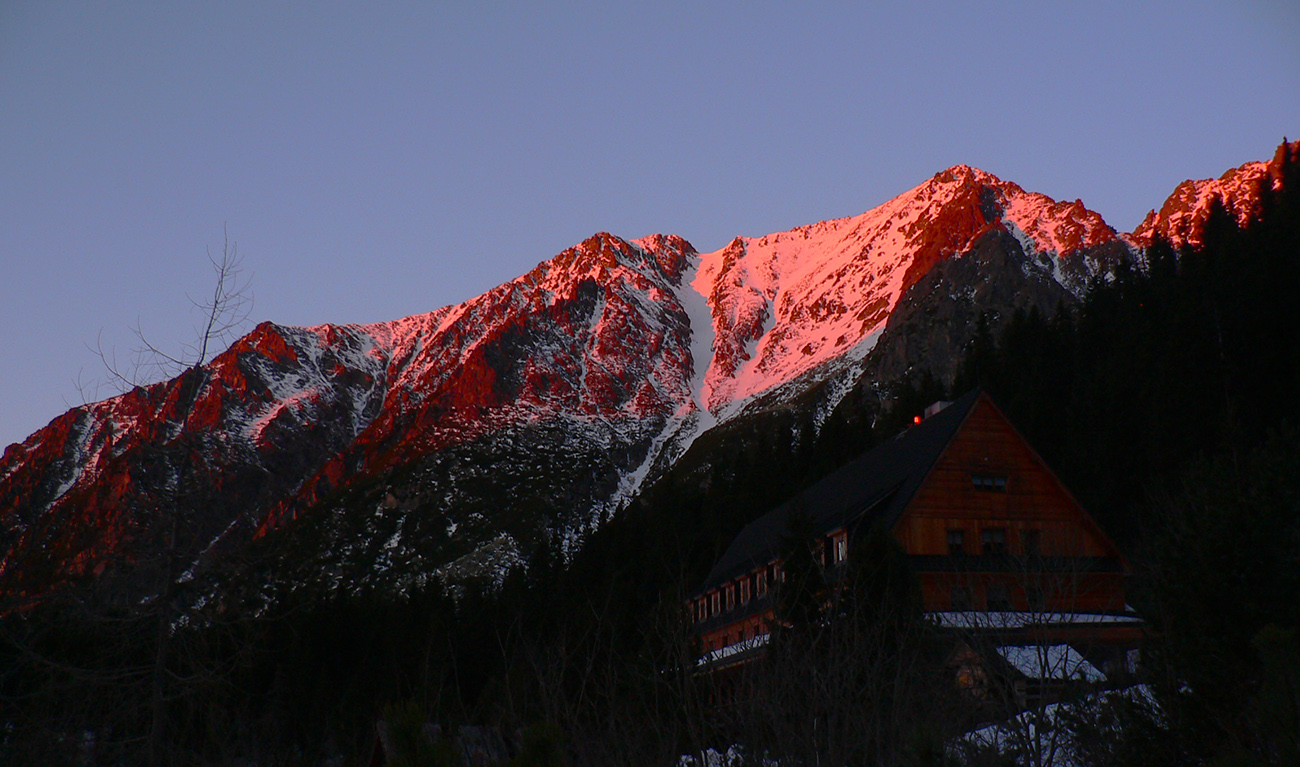 Takže ráno, už poučení (s lyžami na chrbte a nie na nohách) štrikujeme kosovkou, popri potoku, cez blokovisko, až na Roveň. Našťastie je poriadne tvrdo, tak sa neprepadávame medzi haluze, aj keď početné diery po predchodcoch sú všade. Pred nami v diaľke trojica pešiakov na mačkách, ale uhýbajú doľava, niekam smerom do Dračieho sedla. Cestou časté obzeranie, vychádzajúce slnko farbí Satana a spol. do pekelnej červene.