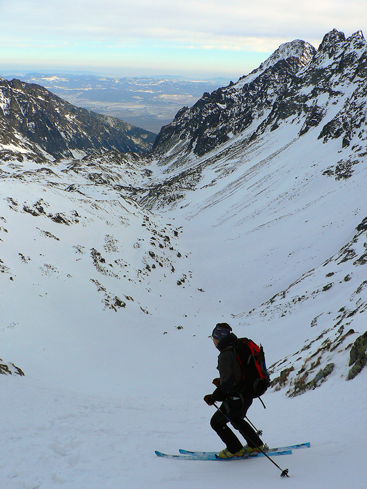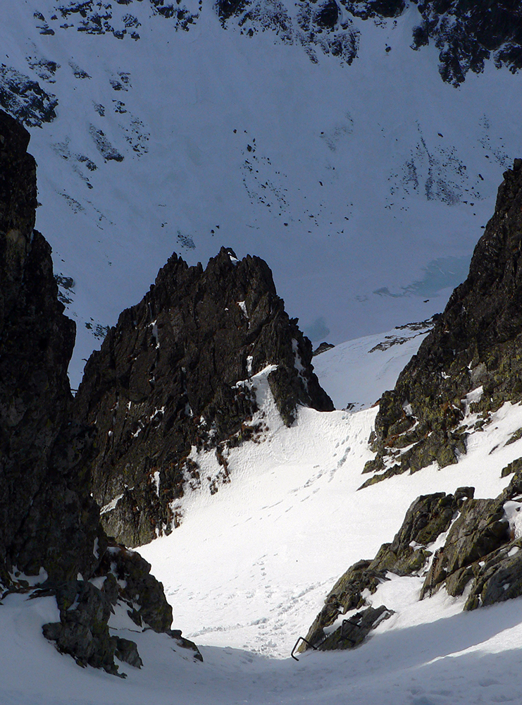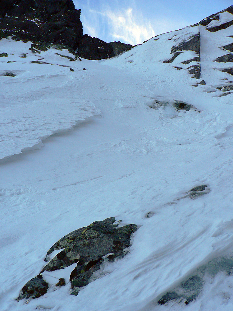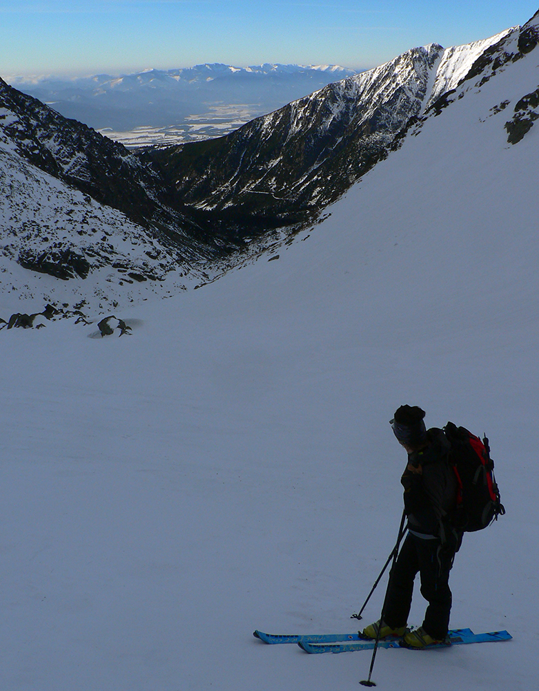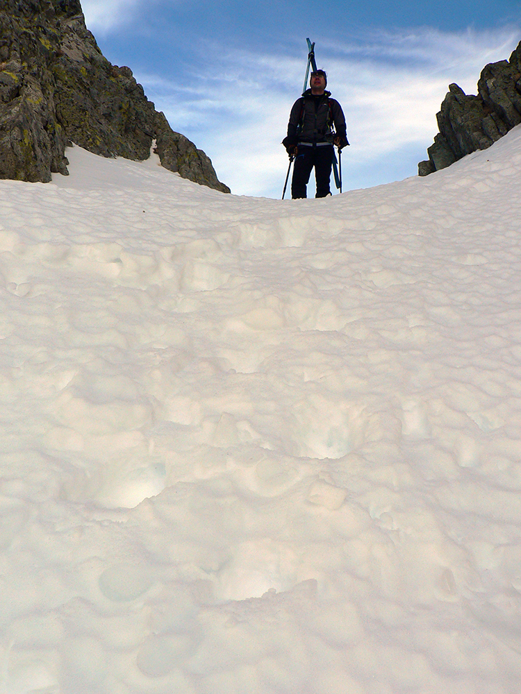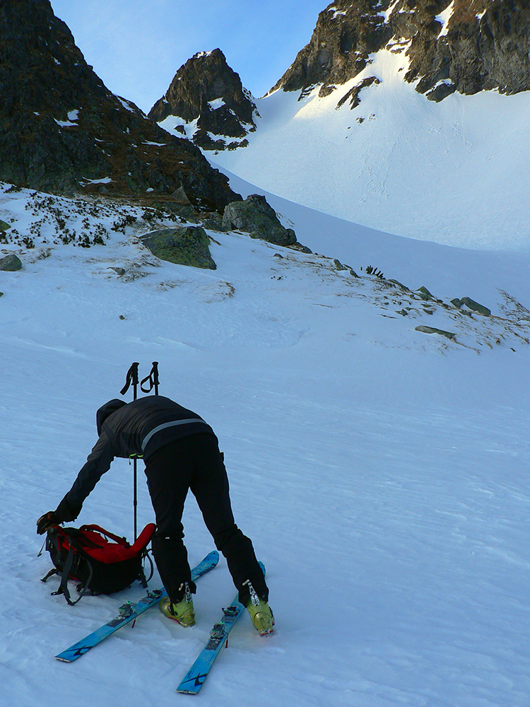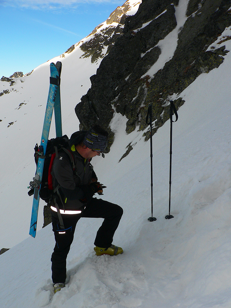 Neteší ale veľmi ten pohľad na druhú stranu: prvých pár metrov sa to nepríjemne leskne, aj keď sme v tieni. Našťastie je to ale dosť hrboľaté, dá sa do toho oprieť lyža. Potom už komfortný náfuk vetrom ubitého snehu a lyžovačka až po Gerlachovské spády čím nižšie, tým lepšia. Nie ľad, ale sneh, len miestami sú v ňom vyfúkané poriadne výmole.