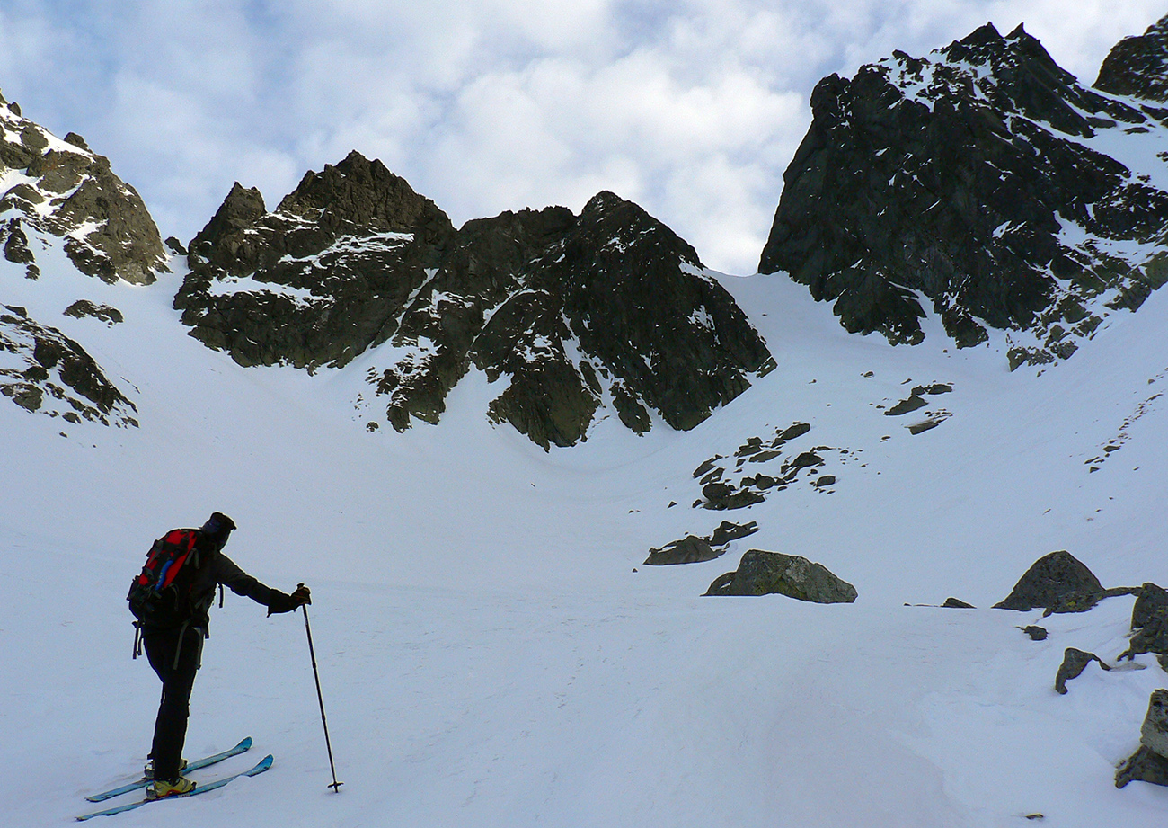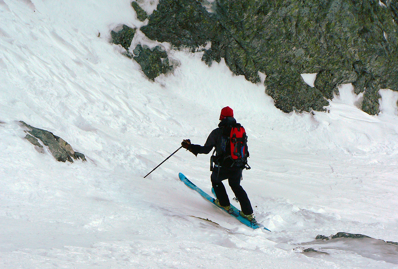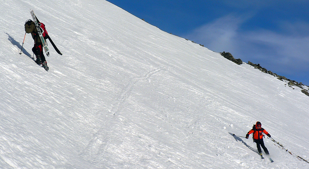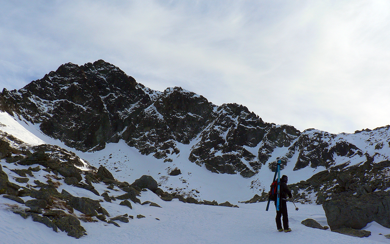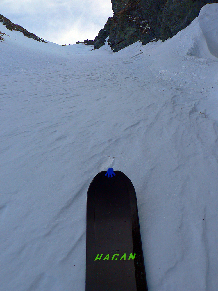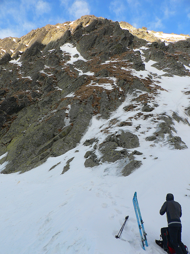 Neteší ale veľmi ten pohľad na druhú stranu: prvých pár metrov sa to nepríjemne leskne, aj keď sme v tieni. Našťastie je to ale dosť hrboľaté, dá sa do toho oprieť lyža. Potom už komfortný náfuk vetrom ubitého snehu a lyžovačka až po Gerlachovské spády čím nižšie, tým lepšia. Nie ľad, ale sneh, len miestami sú v ňom vyfúkané poriadne výmole.