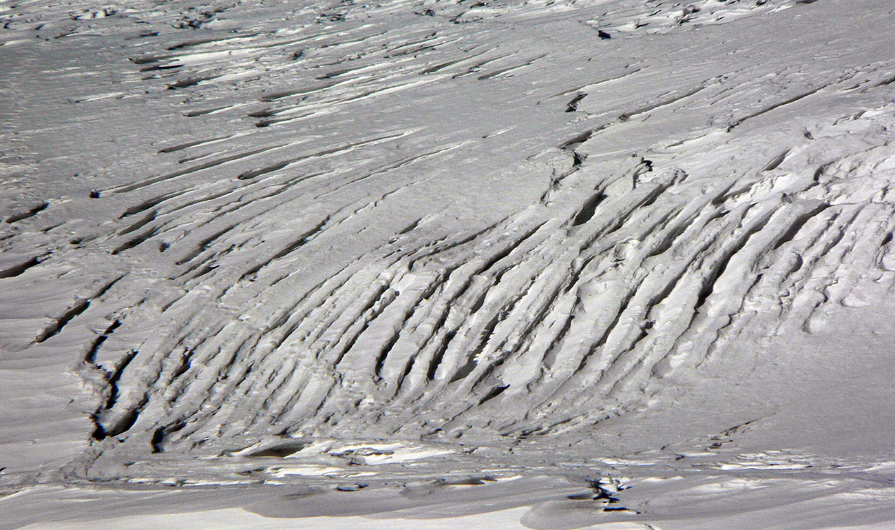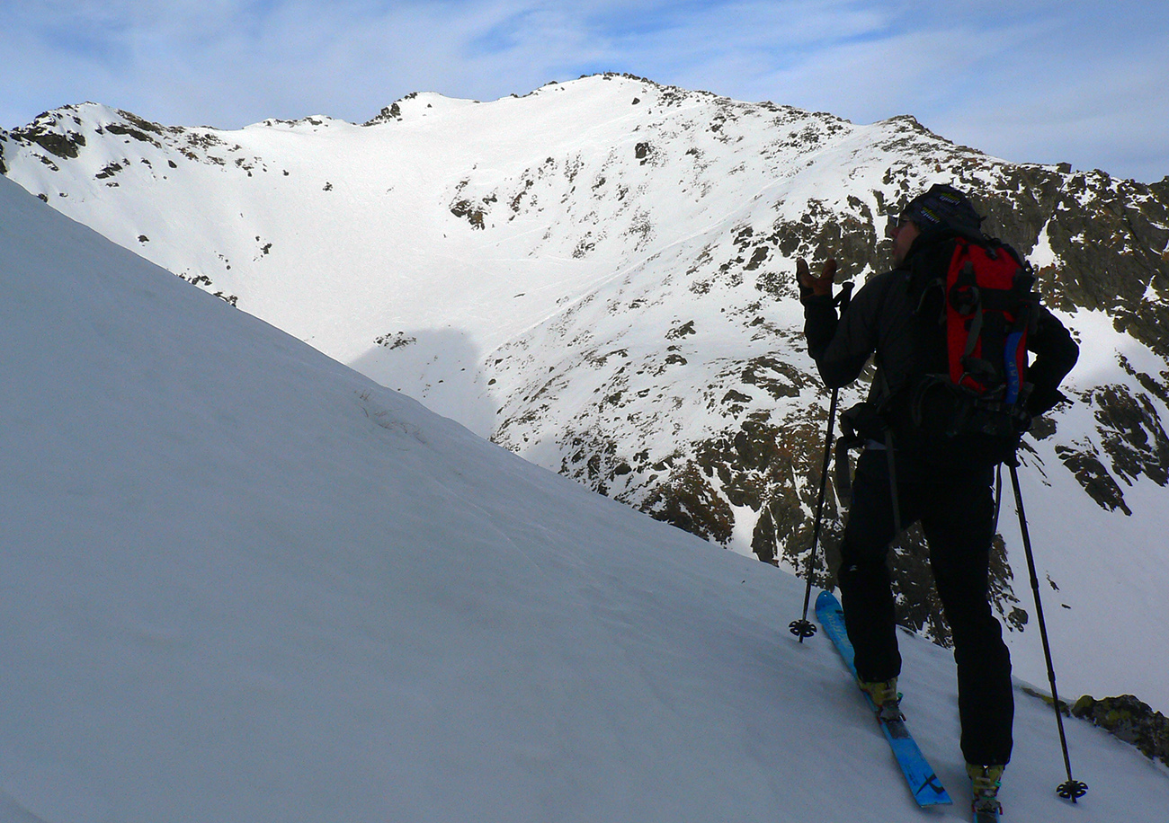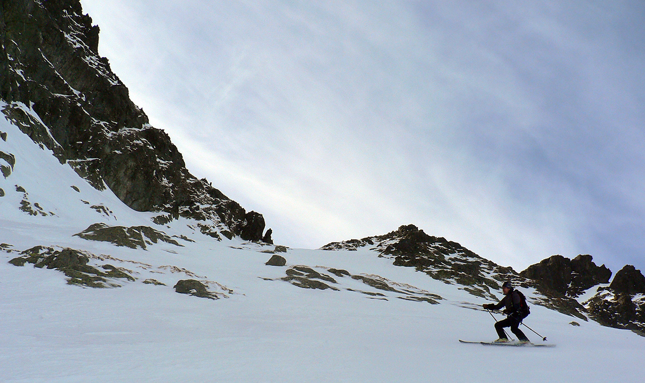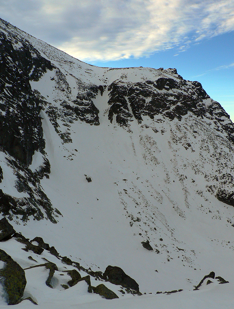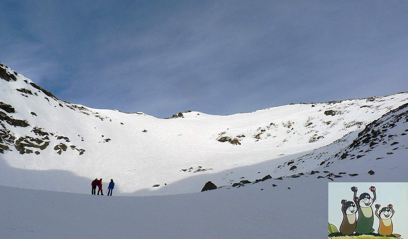Neteší ale veľmi ten pohľad na druhú stranu: prvých pár metrov sa to nepríjemne leskne, aj keď sme v tieni. Našťastie je to ale dosť hrboľaté, dá sa do toho oprieť lyža. Potom už komfortný náfuk vetrom ubitého snehu a lyžovačka až po Gerlachovské spády čím nižšie, tým lepšia. Nie ľad, ale sneh, len miestami sú v ňom vyfúkané poriadne výmole.