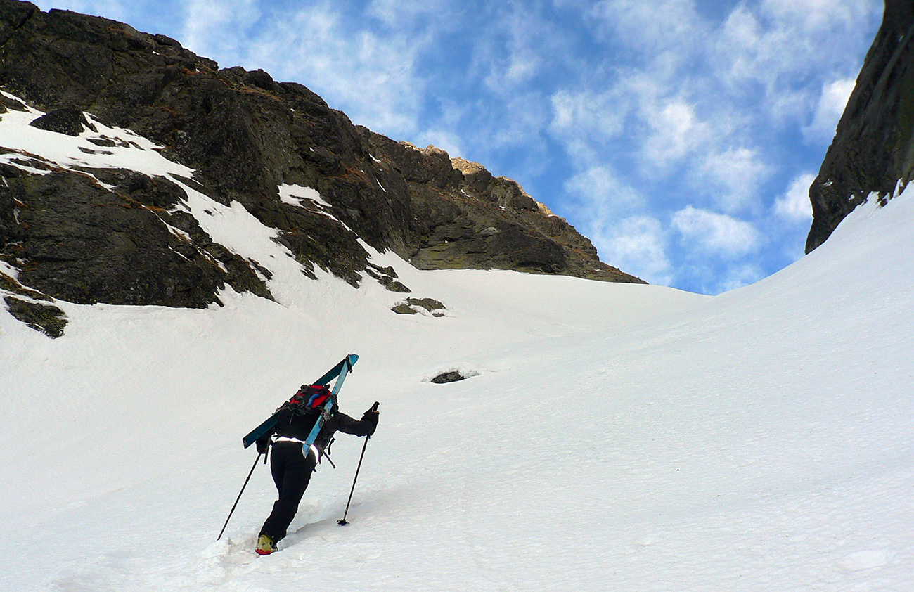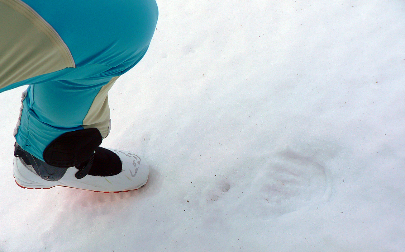 Ešte pár oblúkov relatívne dobrej lyžby a vysoko nad Zeleným Kačacím plesom lepíme pásy. Pred nami najdlhší výstup, do Prielomu. V traverze do Litvorovej doliny dosť hľadáme cestu - nielen pomedzi šutre, ale aj pomedzi zvyšky tráv, aj litvory trčia zo snehu. Potom čím vyššie, tým lepšie. Od tuhého snehu, cez šmirgľový firn, po občasné neškodné ľadové platničky. A zas: až vysoko pod Prielom to aj bez haršajzní výborne drží. Aj vo vylízaných traverzoch nad severným brehom Zamrznutého plesa.