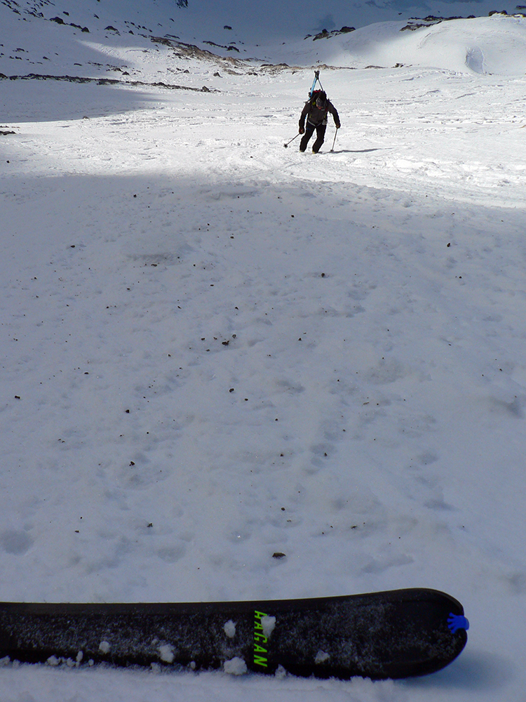 Onedlho teda už cikcakujeme hore k vrcholovej hrdzavej veži, ale nie je to natopené ako sme si mysleli. Pod vrchom treba opatrne, aj lyžu miestami poriadne zaseknúť, tu už je ľadovo. Aj keď slnko bije do svahu, teplota je už pod nulou, nie ako v piatok. Napriek tomu za odmenu celkom dobrá lyžovačka, len už trochu hrkotavejšia ako z Prielomu. Všetky malé a nepríjemné hrbolčeky sú dávno zbrúsené masami, tak to veľmi netrasie nohami.