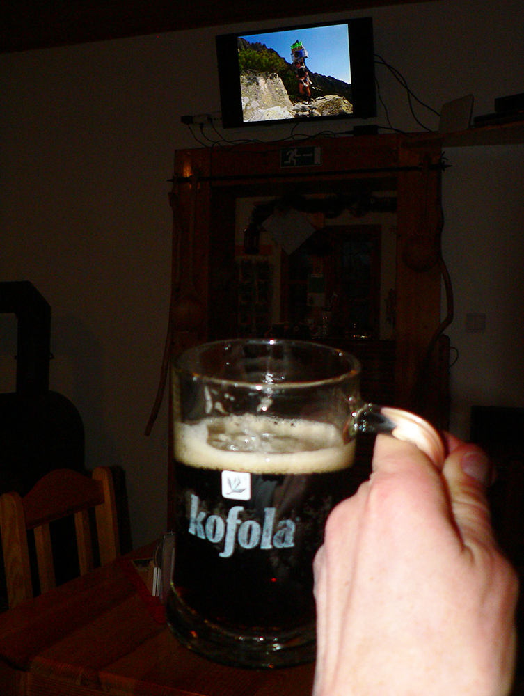 Len pod Hrebienkom nás esbeeskár zaháňa z cesty preč, lebo vraj do ôsmej večera zákaz na lyžiach. Hore – dole totiž prúdia davy, obzerať výrobu ľadových sôch. Po celom dni v prírode dosť kultúrny šok toto... Tak ešte posledný „traverz“ – cez koľaje lanovky na starú zjazdovku, kde je ľudí menej a sneh čistejší. Dá sa až do Smokovca, komfort. A bodka pri kofole a medovníkoch u Pištu v Sherpa café, to musí byť! Super to bolo, v tejto biede z minima maximum sme vyžmýkali, si myslím. Správy o stave snehov sú podrobnejšie v galérii.