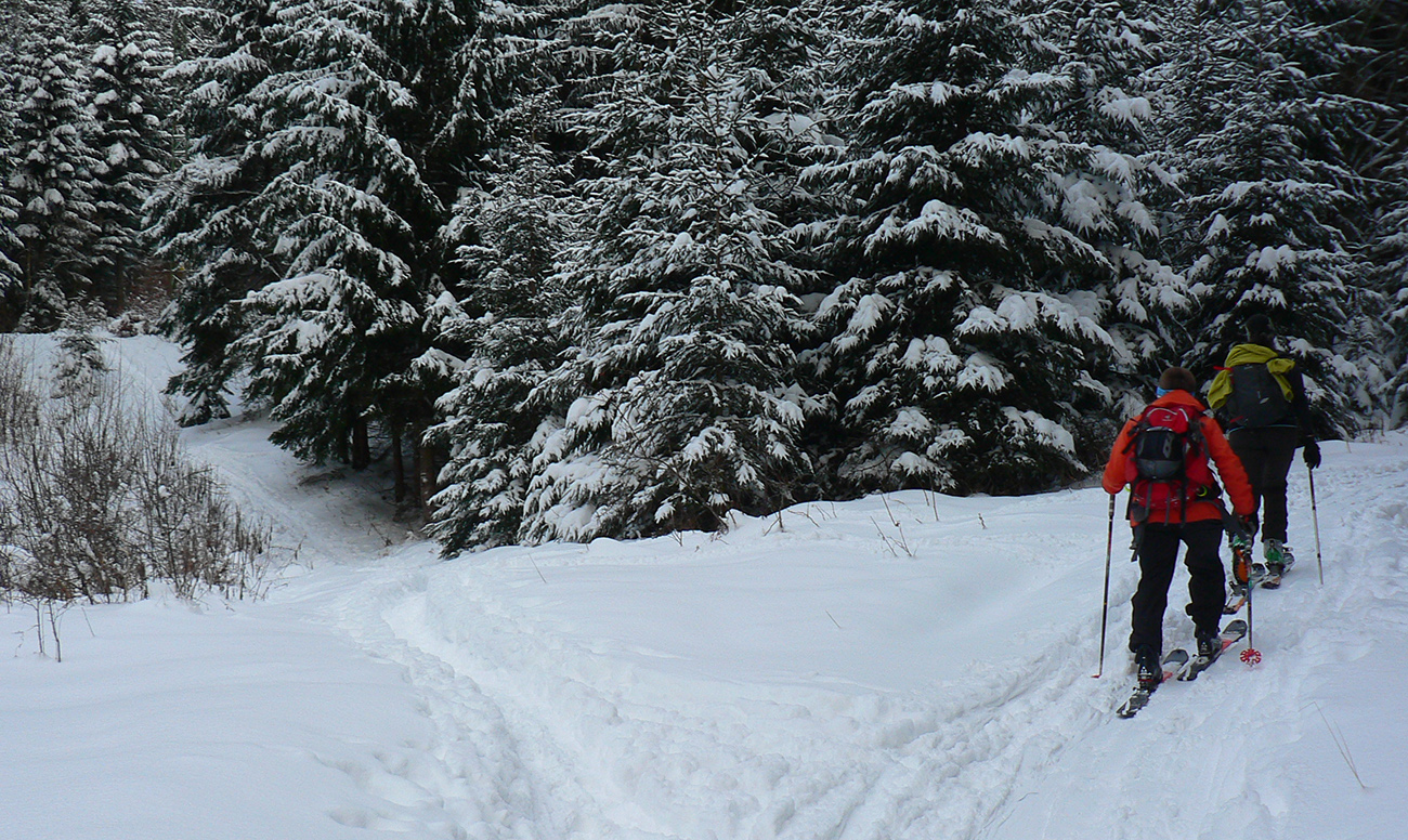 Sme hore, medzi Kubínskou hoľou a Minčolom – viditeľnosť ďaleká, aj keď pod mrakom. Nefúka, je to dnes paráda! Stopa do Príslopu viditeľná, ale dnes ešte nepreleštená. My ideme opačne. Pekne po modrej na Vasiľovskú hoľu a polyžovať dole k polievke. Hrebeňová lúka pod Minčolom (tráva ešte trčí) a prvý zošup lesom - je krátky, tak na rozcvičenie. Snehu dosť aj na brzdenie pluhom.