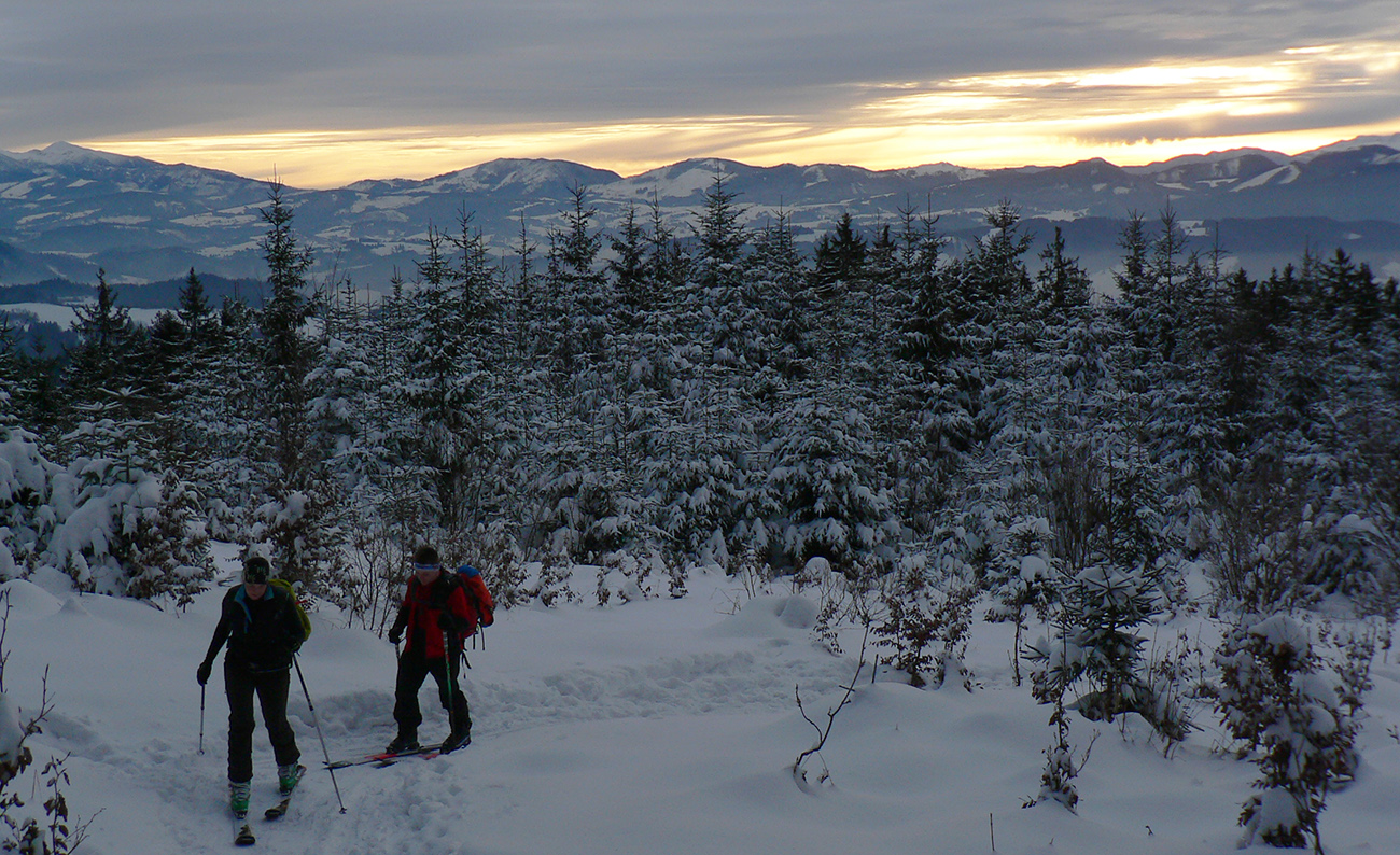 Šiesty január, pondelok trojkráľový, koniec sviatkov, treba ešte využiť. Zvlášť, keď predošlé dva dni nadzigalo prašanu – a dokonca aj v dolinách, aspoň teda na severe. Jedno auto a traja ľudia – konečne nie som odkázaný na spoje! Obratným a nenápadným manipulovaním utvrdzujem zvyšných dvoch, že Kubínka je ich nápad a najlepšia voľba :-) Parkujeme na najvyššom parkovisku, ešte je miesta dosť, vleky začnú ťahať o hodinu. Ku krvavočervenej zore nad Chočom sa otáčame chrbtom a len pár metrov od auta sa noríme do lesa po parádnej stope. No, parádnej – je vidieť, že sneh napadal na „nič“. Okolo rozprávka ako z Mrázika, no pod nohami presvitá premrznuté blato. Ale na výstup komfort.
