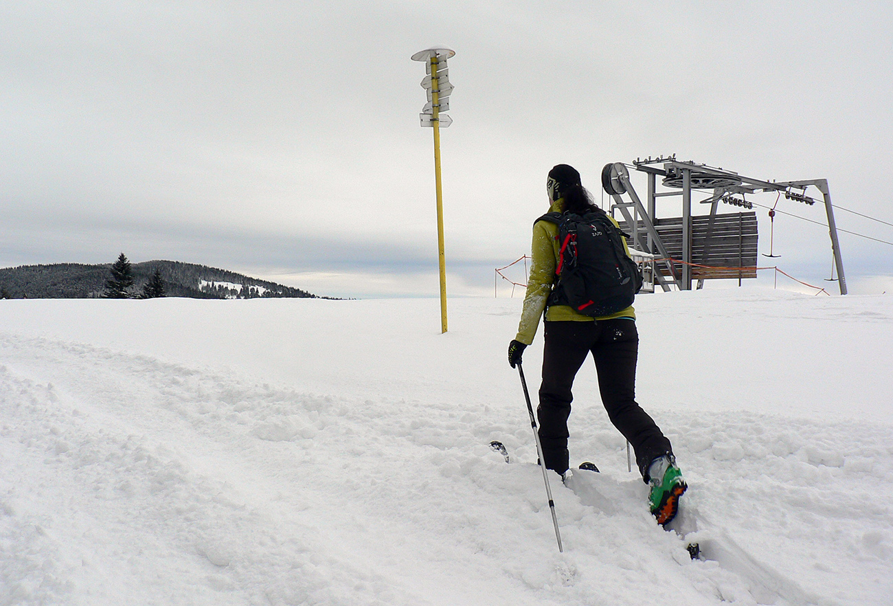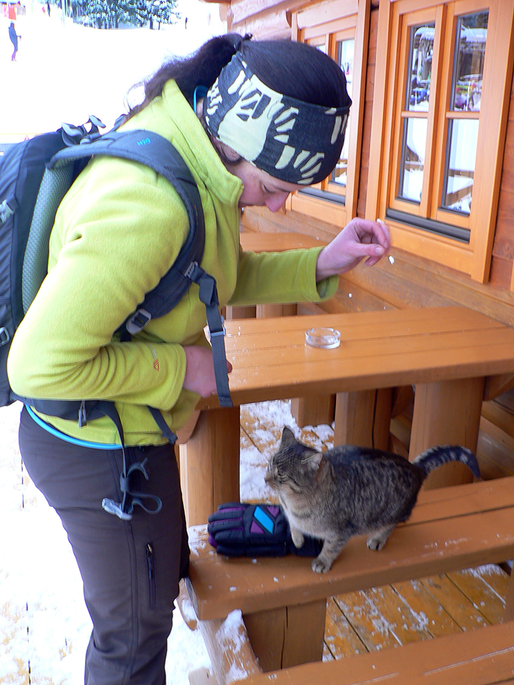 Lúky na Vasiľovskej holi sú po motorovom dementovi poorané tiež poriadne, ale naša stopa zachovaná, pred nami aj za nami ju dosť ľudí leští. A výhľady aj tu super, najmä na sever, kde Babia hora schováva hlavu v mrakoch. O chvíľu sme pri vleku a o ďalšiu chvíľu už štrikujeme dole po zjazdovke. Na otočke drevená koliba, tučný kocúr, desiatové polievky a ide sa nazad. Pekne slušne po okraji pisty, popod les.