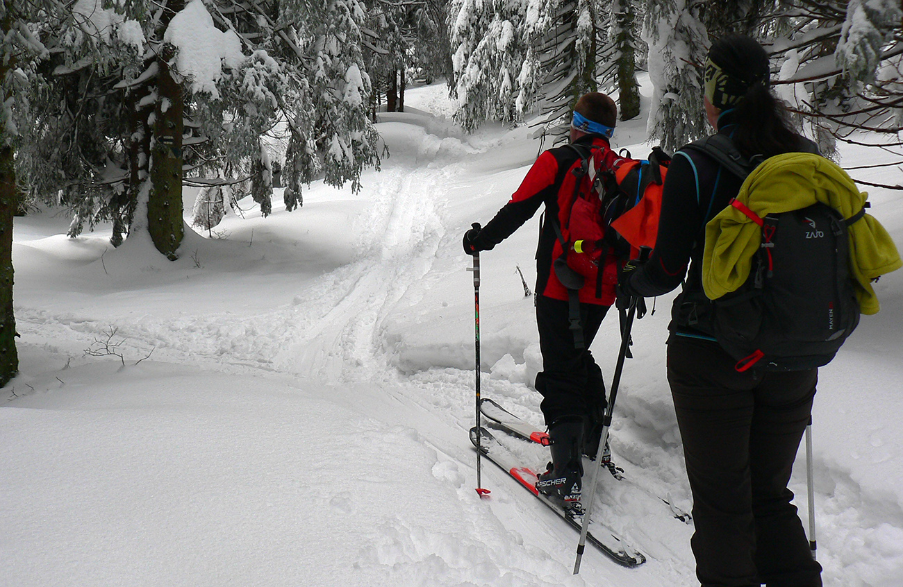 Čím vyššie, tým hlbšie koľajničky, tu na Orave ozaj nasnežilo pekne! Skratky lesom komfortne vycikcakované, diaľnica k chate komfortne poratrakovaná, cikcaky frírajdovým lesom pod hrebeňom (väčšinou) komfortne naklonené. Prví púdroví jazdci už sa spúšťajú okolo nás, po kolená v prašane, pochvaľujú si. Aj keď niekde za nimi presvitajú jafury.