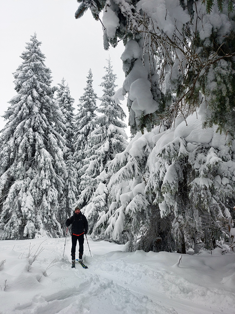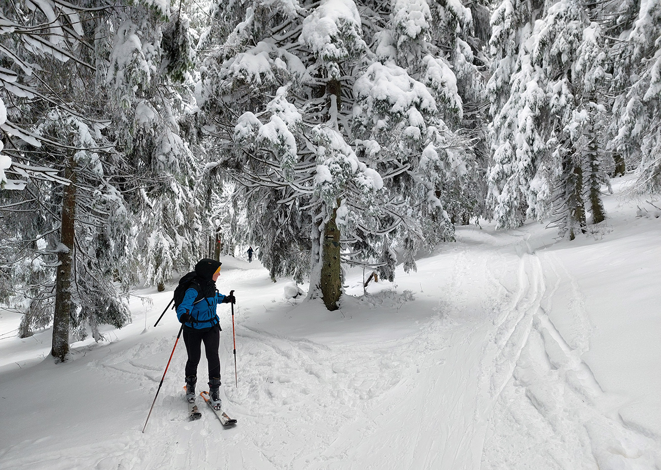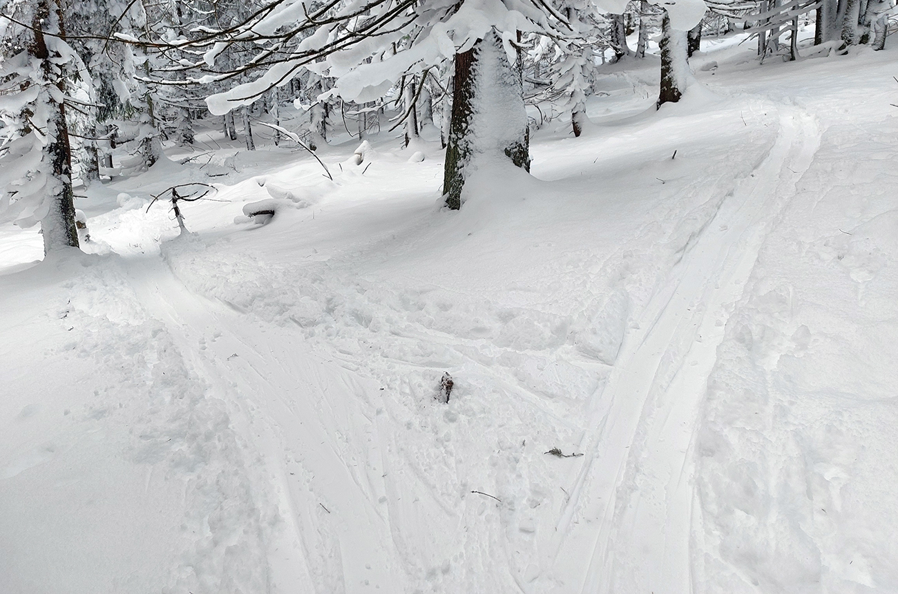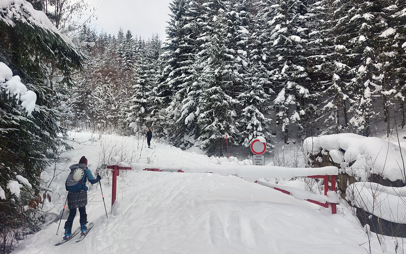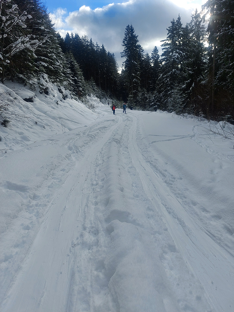 Na Orave padlo bieleho akosi viac ako vo Fatrách, sa zdalo. Tak sme vyrazili do istoty päťeurového parkovného a mali sme šťastie ešte na tom najspodnejšom parkplaci, ktorý sa brutálne rýchlo plnil. Pred deviatou. Potom len kúsok popri vleku a šmyk doľava, na modrú značku. Megakomfortné rozchodenie pre dvoch aj troch vedľa seba. Od silvestrovského sneženia ešte lesy krásne osnežené, ale stopy vyleštené ako koľajnice. Ozaj tak do 30 cm prášku. Lenže paličky škrtali o kamene, základ pražiadny. Do kopca ale super. Len 2,5 km a na výraznej križovatke nás ešte výraznejšie vychodená stopa odbočila prudko doprava z cyklotrasy, no najmä do strmšieho.