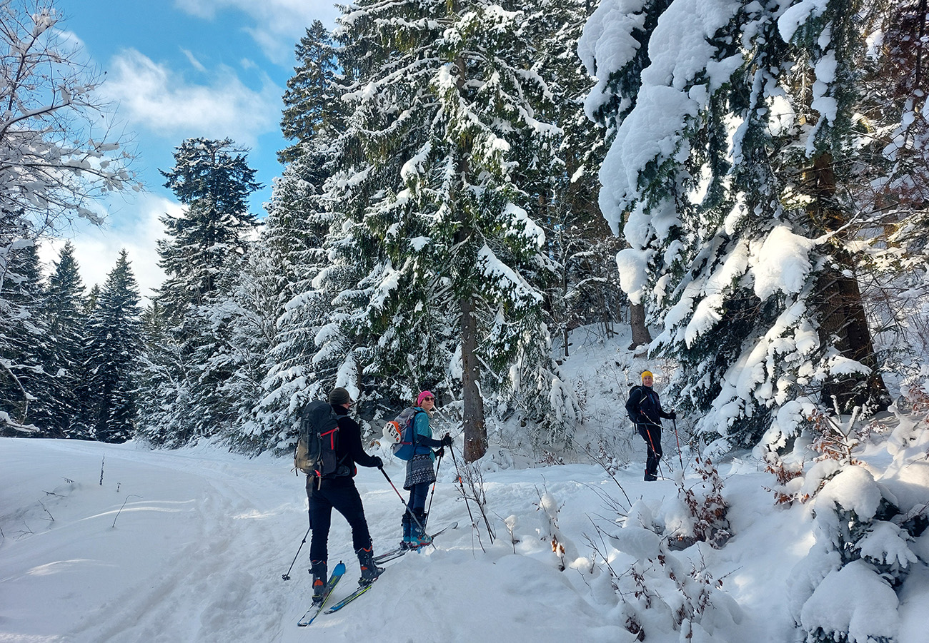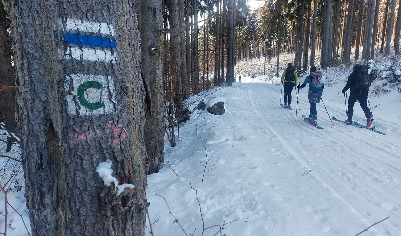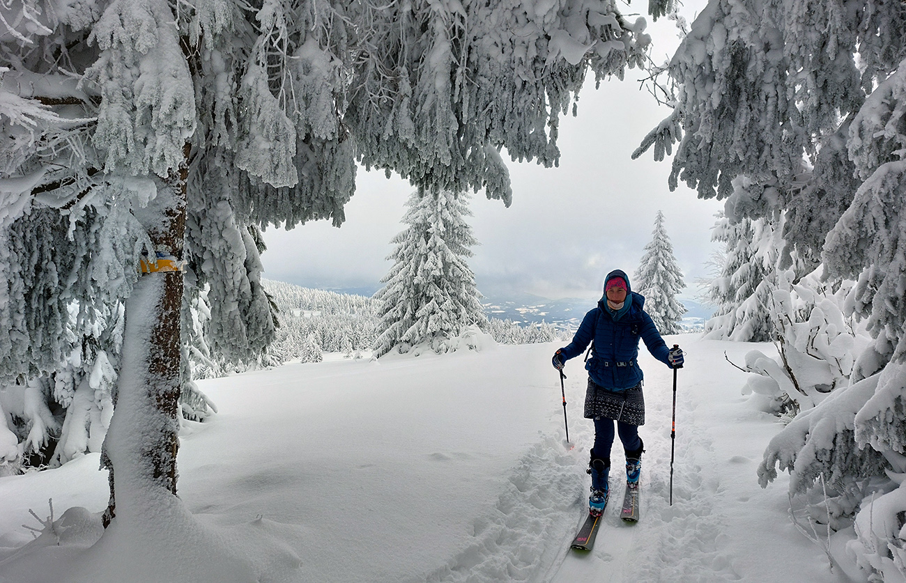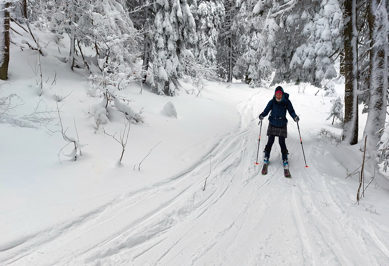 Na Orave padlo bieleho akosi viac ako vo Fatrách, sa zdalo. Tak sme vyrazili do istoty päťeurového parkovného a mali sme šťastie ešte na tom najspodnejšom parkplaci, ktorý sa brutálne rýchlo plnil. Pred deviatou. Potom len kúsok popri vleku a šmyk doľava, na modrú značku. Megakomfortné rozchodenie pre dvoch aj troch vedľa seba. Od silvestrovského sneženia ešte lesy krásne osnežené, ale stopy vyleštené ako koľajnice. Ozaj tak do 30 cm prášku. Lenže paličky škrtali o kamene, základ pražiadny. Do kopca ale super. Len 2,5 km a na výraznej križovatke nás ešte výraznejšie vychodená stopa odbočila prudko doprava z cyklotrasy, no najmä do strmšieho.