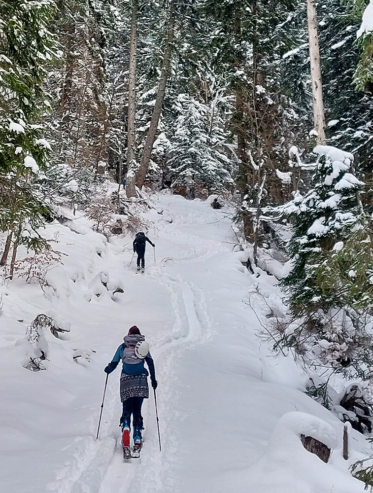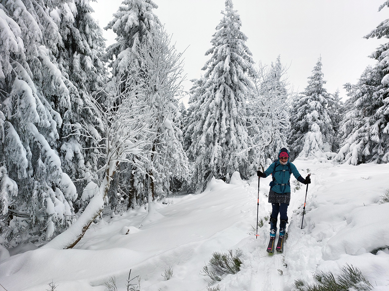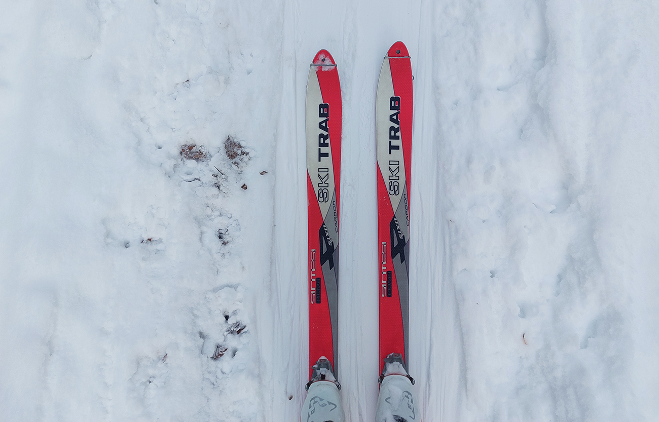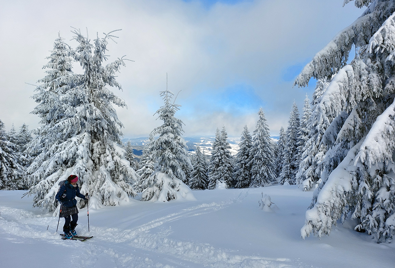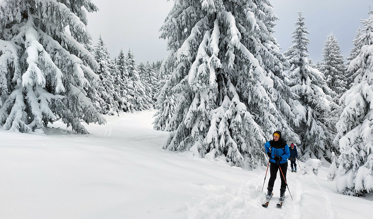 Na Orave padlo bieleho akosi viac ako vo Fatrách, sa zdalo. Tak sme vyrazili do istoty päťeurového parkovného a mali sme šťastie ešte na tom najspodnejšom parkplaci, ktorý sa brutálne rýchlo plnil. Pred deviatou. Potom len kúsok popri vleku a šmyk doľava, na modrú značku. Megakomfortné rozchodenie pre dvoch aj troch vedľa seba. Od silvestrovského sneženia ešte lesy krásne osnežené, ale stopy vyleštené ako koľajnice. Ozaj tak do 30 cm prášku. Lenže paličky škrtali o kamene, základ pražiadny. Do kopca ale super. Len 2,5 km a na výraznej križovatke nás ešte výraznejšie vychodená stopa odbočila prudko doprava z cyklotrasy, no najmä do strmšieho.