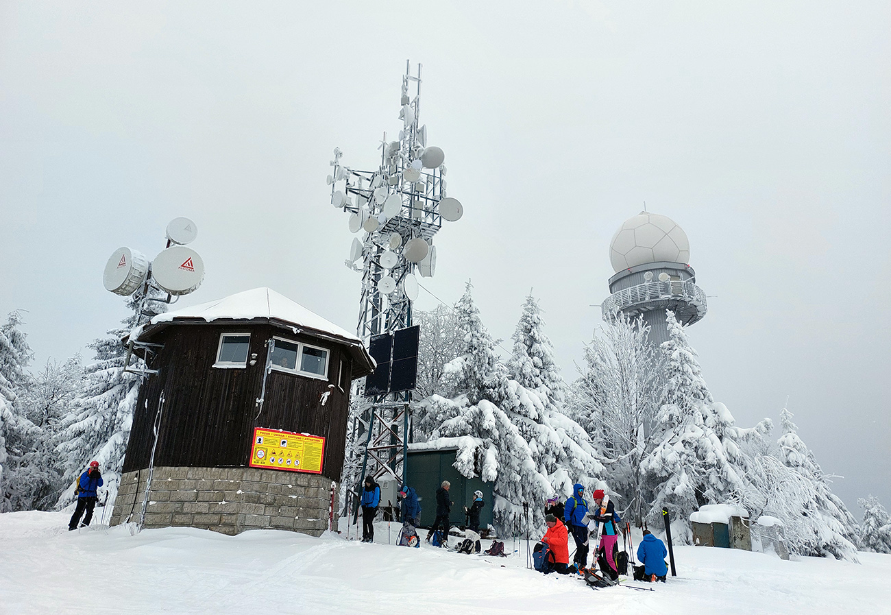 Takže sme sa hore pripojili na červenú značku a pekne od západu dorazili pomedzi jafury na Minčol. V takom pohodlnom, práškovom korýtku. Pri smerovníku sa nás nazbieralo vari šesť, na konci lesa pri útulni davy.