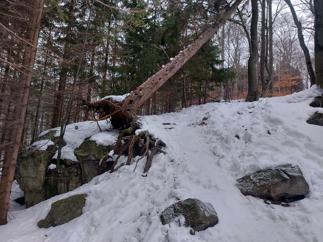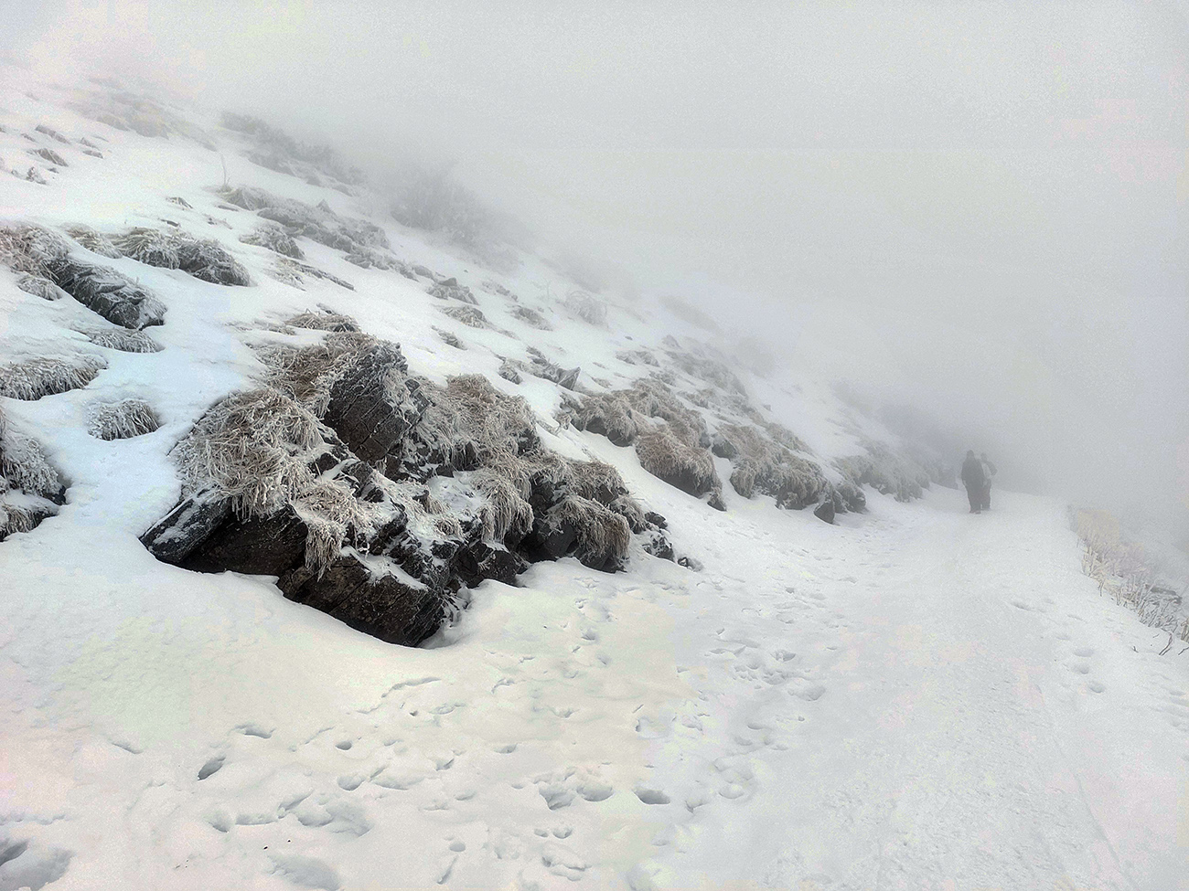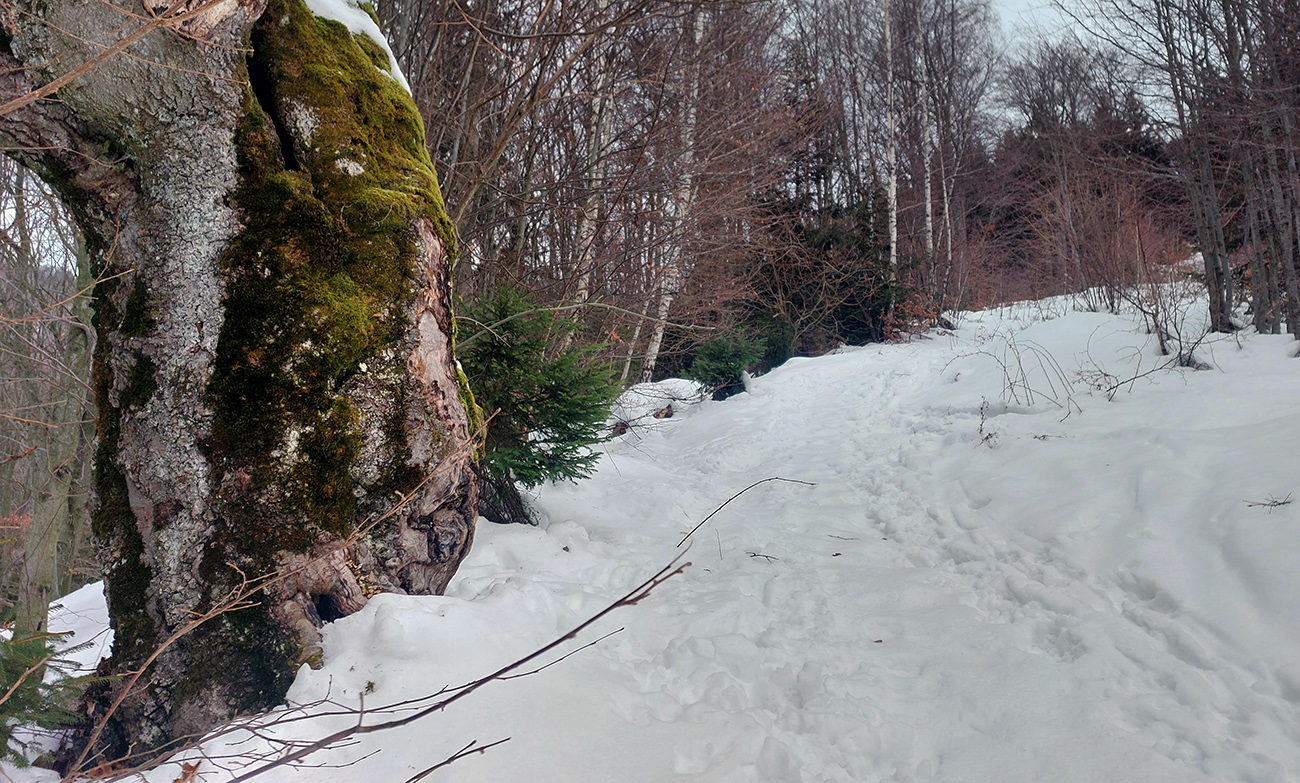 Generál - klasika, rozjazdený a ujazdený, nebol problém, podklad držal a už bol aj suchší. Nad chatou ale začala neviditeľnosť a začalo pofukovať, taký teplý južný. Použiteľná (peši) aj zimná trasa. Sneh ale už suchý, akurát ho po Snilovské sedlo dosť ubudlo a tam hore trávnik. Ako inak.