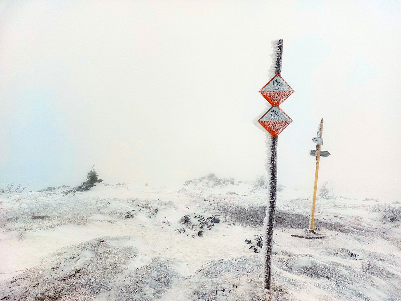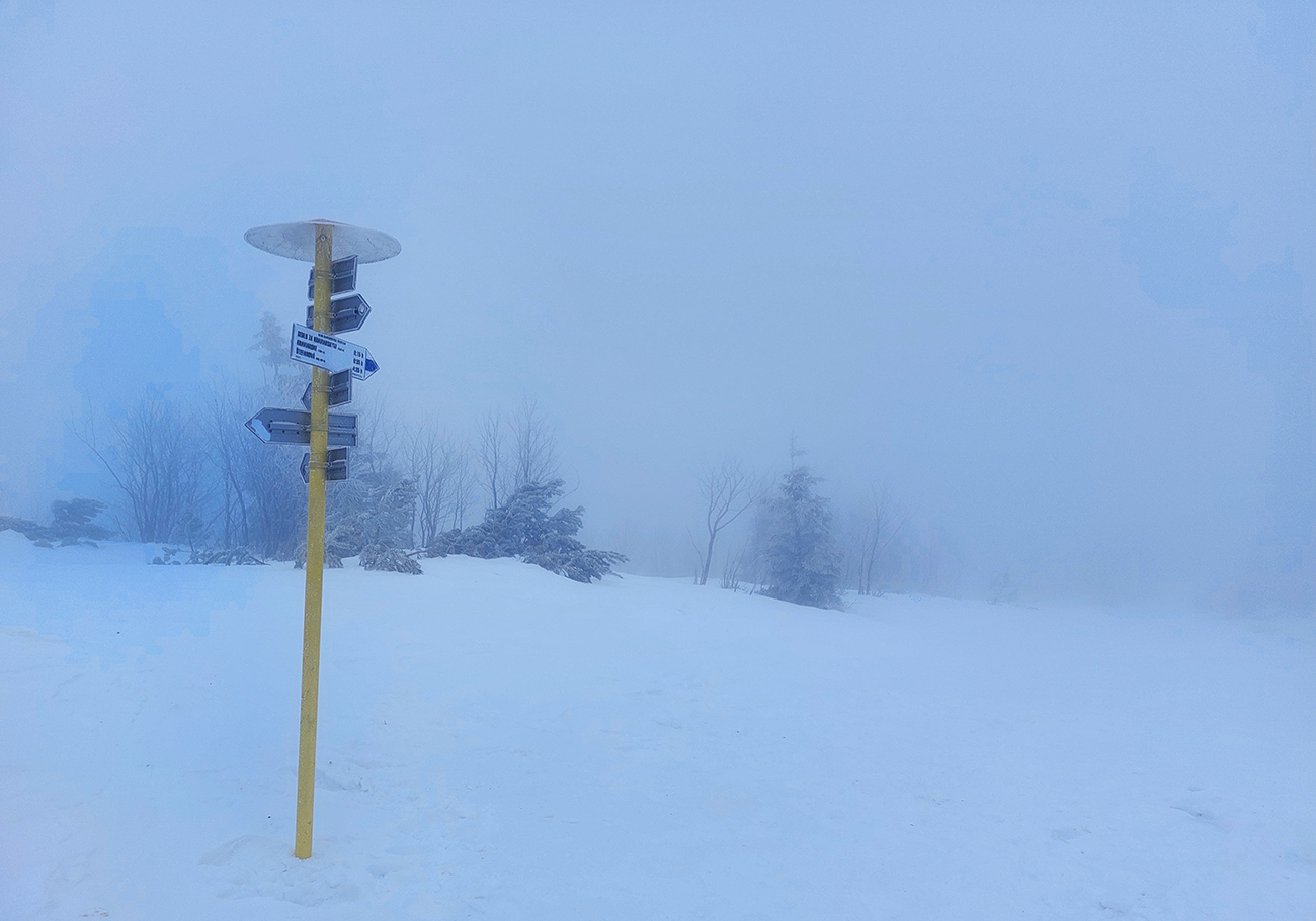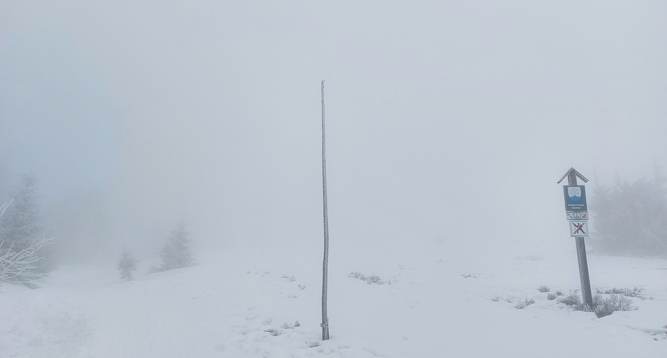 Neviditeľnosť gradovala aj vďaka slzám v očiach, ale dopotkýnal som sa až za Koniarky, do závetria. Opáčiť, či nebude lepšie cez Hole do Bránice zbehnúť. Ale tam chodník nie veľmi prechodený. Červená hrebeňovka tiež zaviata, prepadavá a neviditeľná. Tak nazad do sedla Bublen a davááj dole na Chrapáky, či je priechodný aspoň modrý traverz k lanovke. Samozrejme, že nebol.