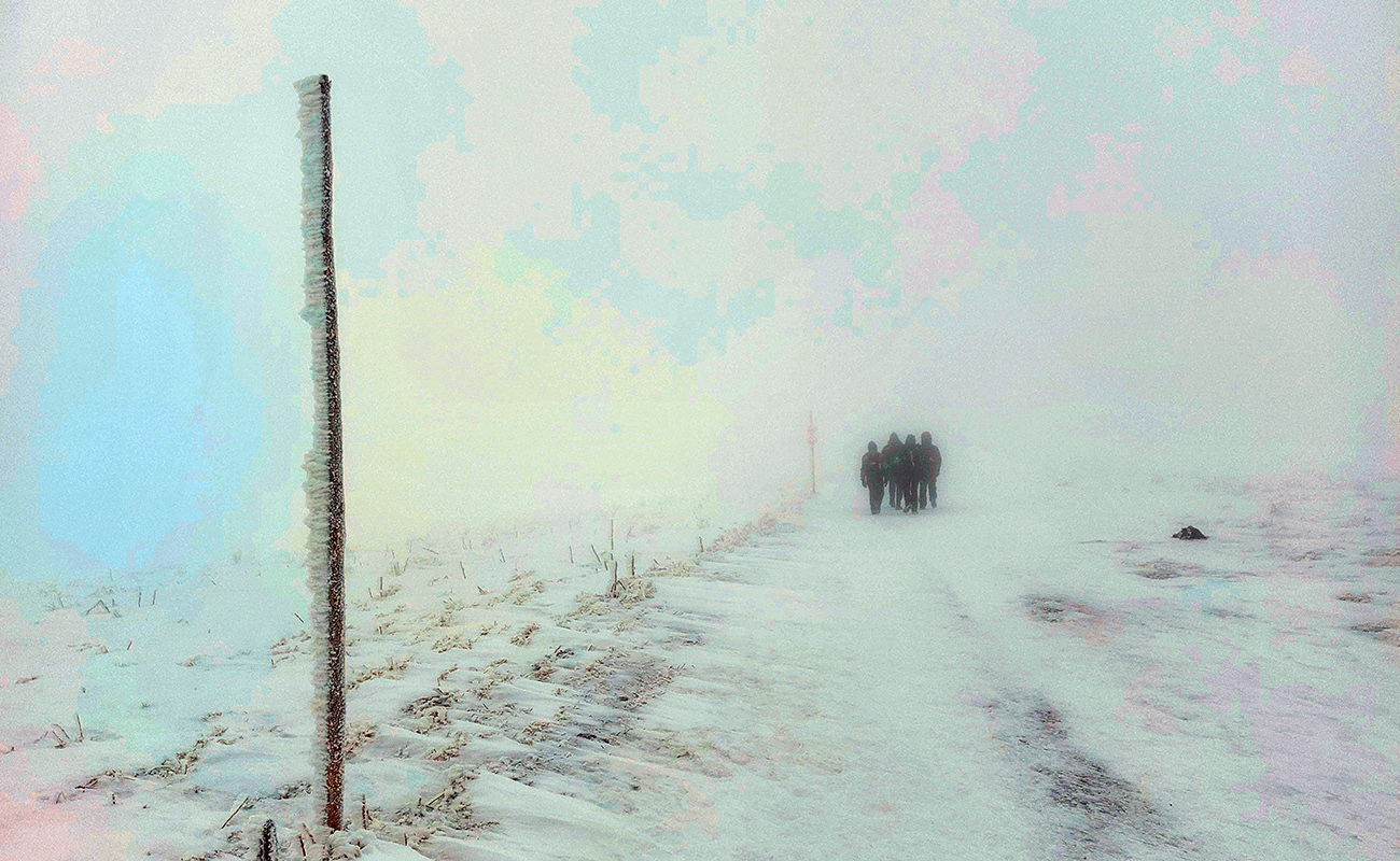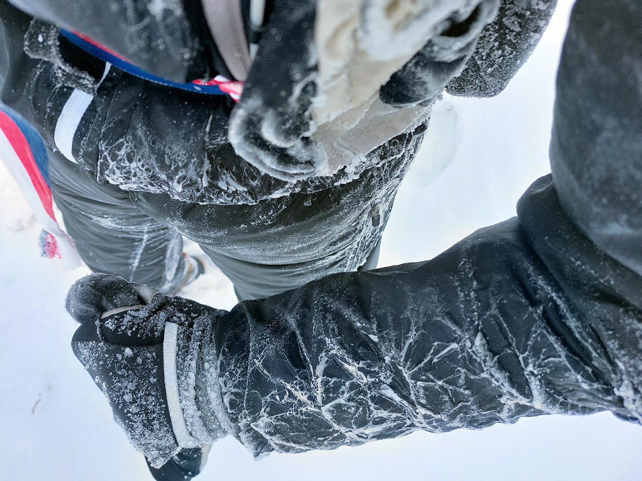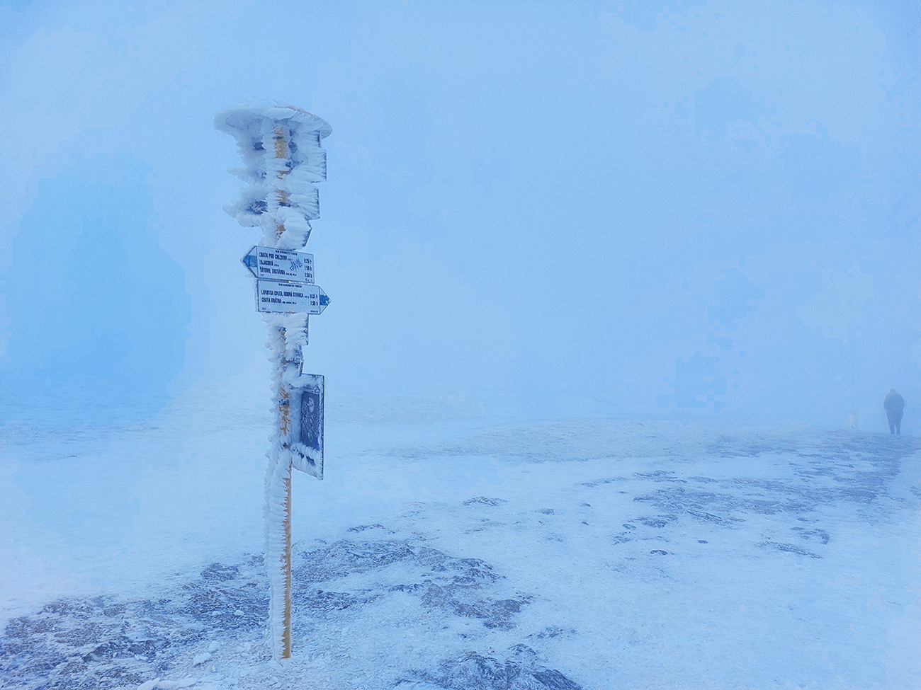 Neviditeľnosť gradovala aj vďaka slzám v očiach, ale dopotkýnal som sa až za Koniarky, do závetria. Opáčiť, či nebude lepšie cez Hole do Bránice zbehnúť. Ale tam chodník nie veľmi prechodený. Červená hrebeňovka tiež zaviata, prepadavá a neviditeľná. Tak nazad do sedla Bublen a davááj dole na Chrapáky, či je priechodný aspoň modrý traverz k lanovke. Samozrejme, že nebol.