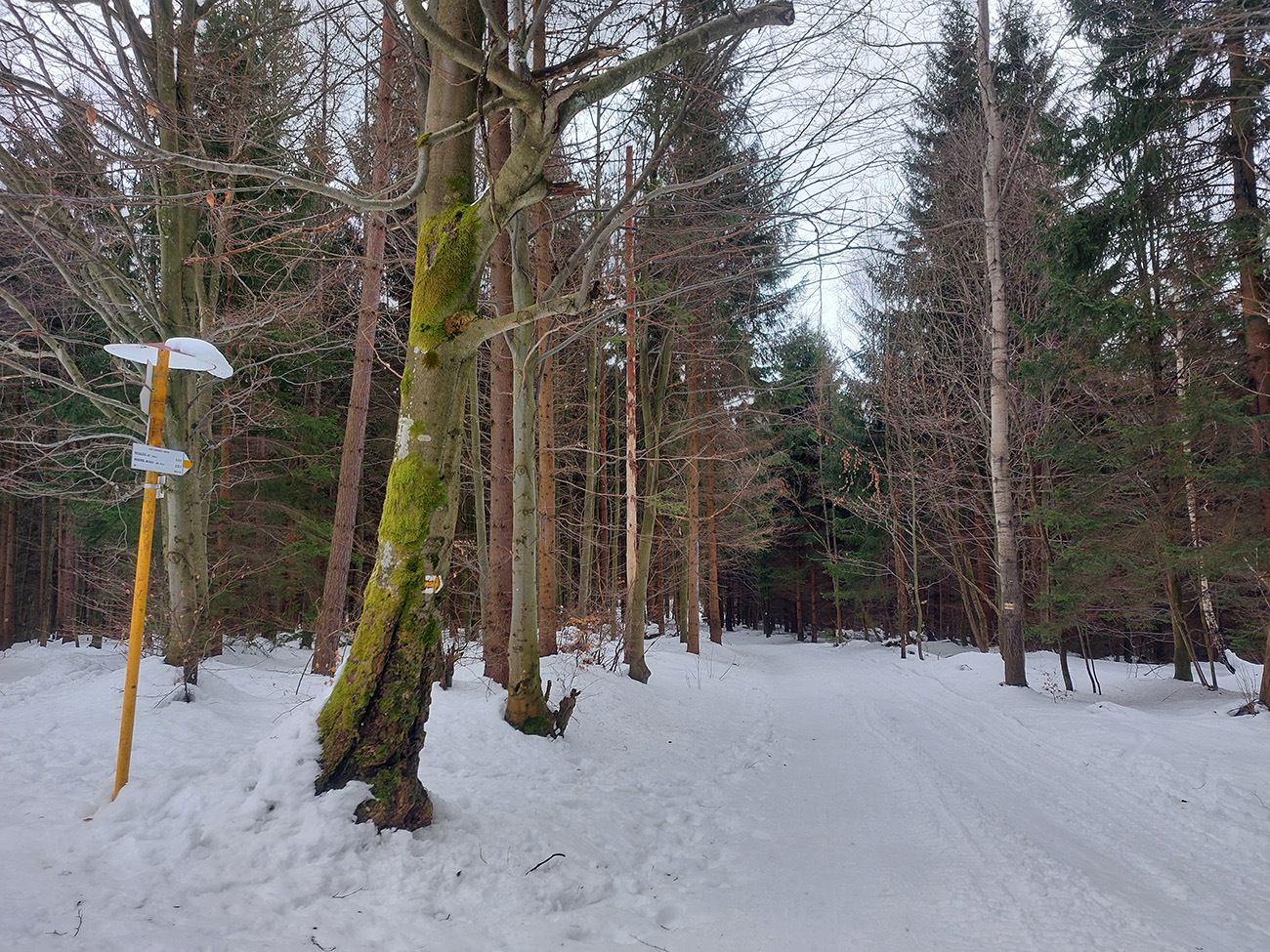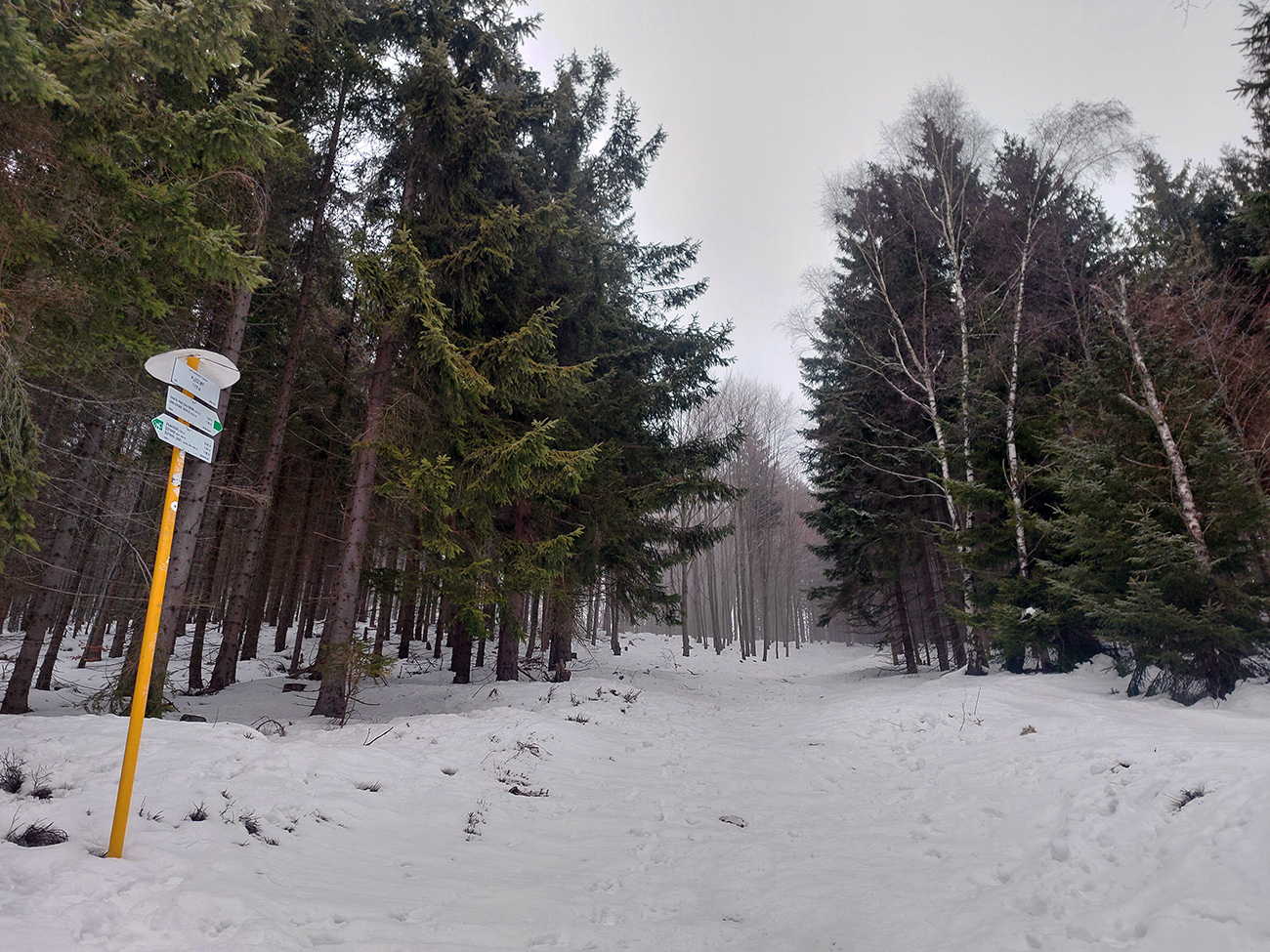 Potom skratka hore na drevosklad - tá už pre lyže nie je, ale ani tá nepodklzovala, proste ten pevný, aj keď navlhnutý podklad fajne držal. Aj smerom dole potom paráda. Rovnako na chodníku cez Ploštiny pod Generál, ktorého spodok bol tak na spodnej hranici mraku.