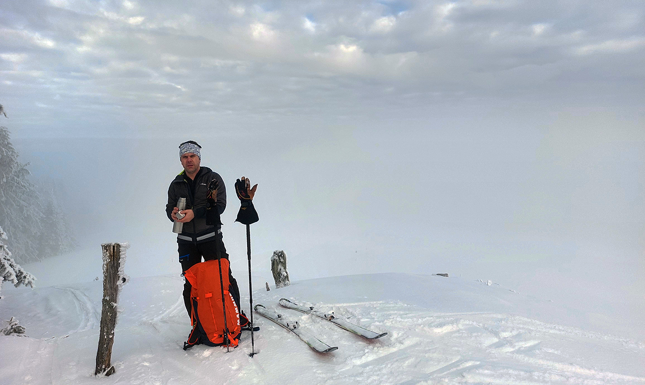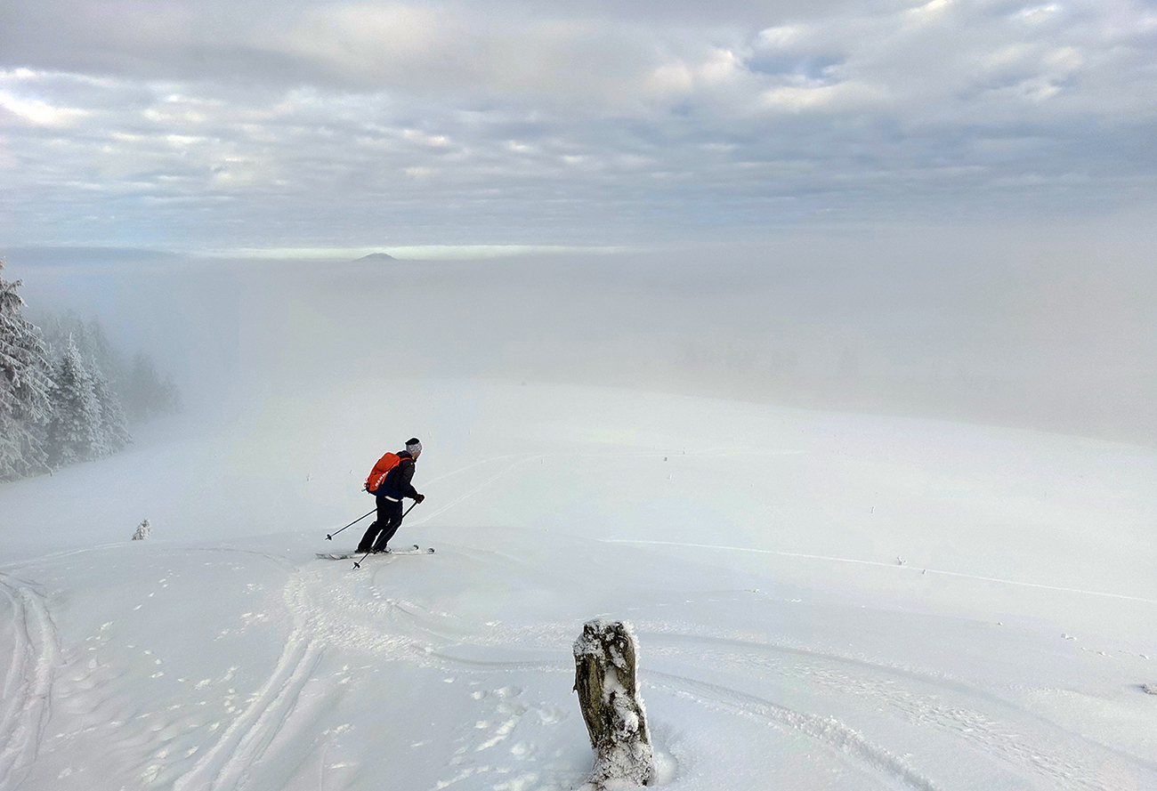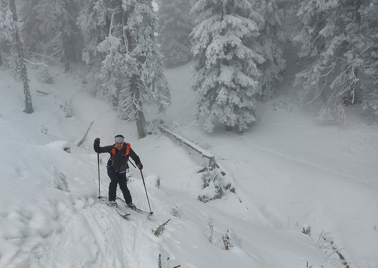 Na „otočke“ sa hmla na chvíľu odporúča, tak rýchlo využívame a skúšame pár oblúkov dole lúkou. Dobré to je na túto biedu – na pevnom a drsnom firne nejaký cenťáčik nového snehu. Síce to škrípe, ale aj drží. Spúšťame až medzi stromy a keď už je úzko a strmo, otáčame nazad hore.