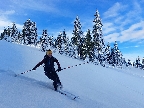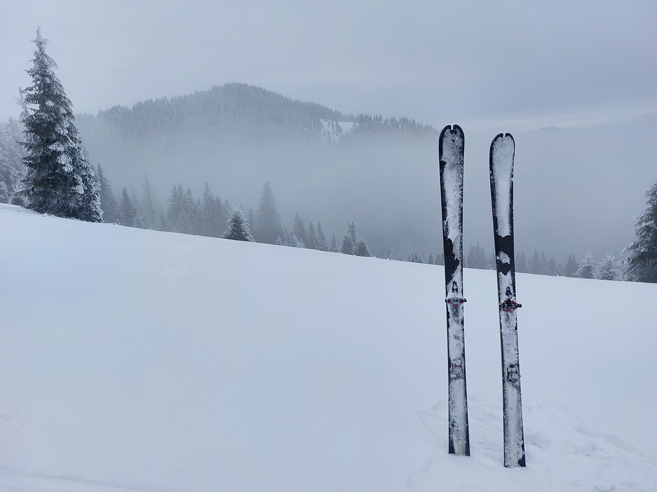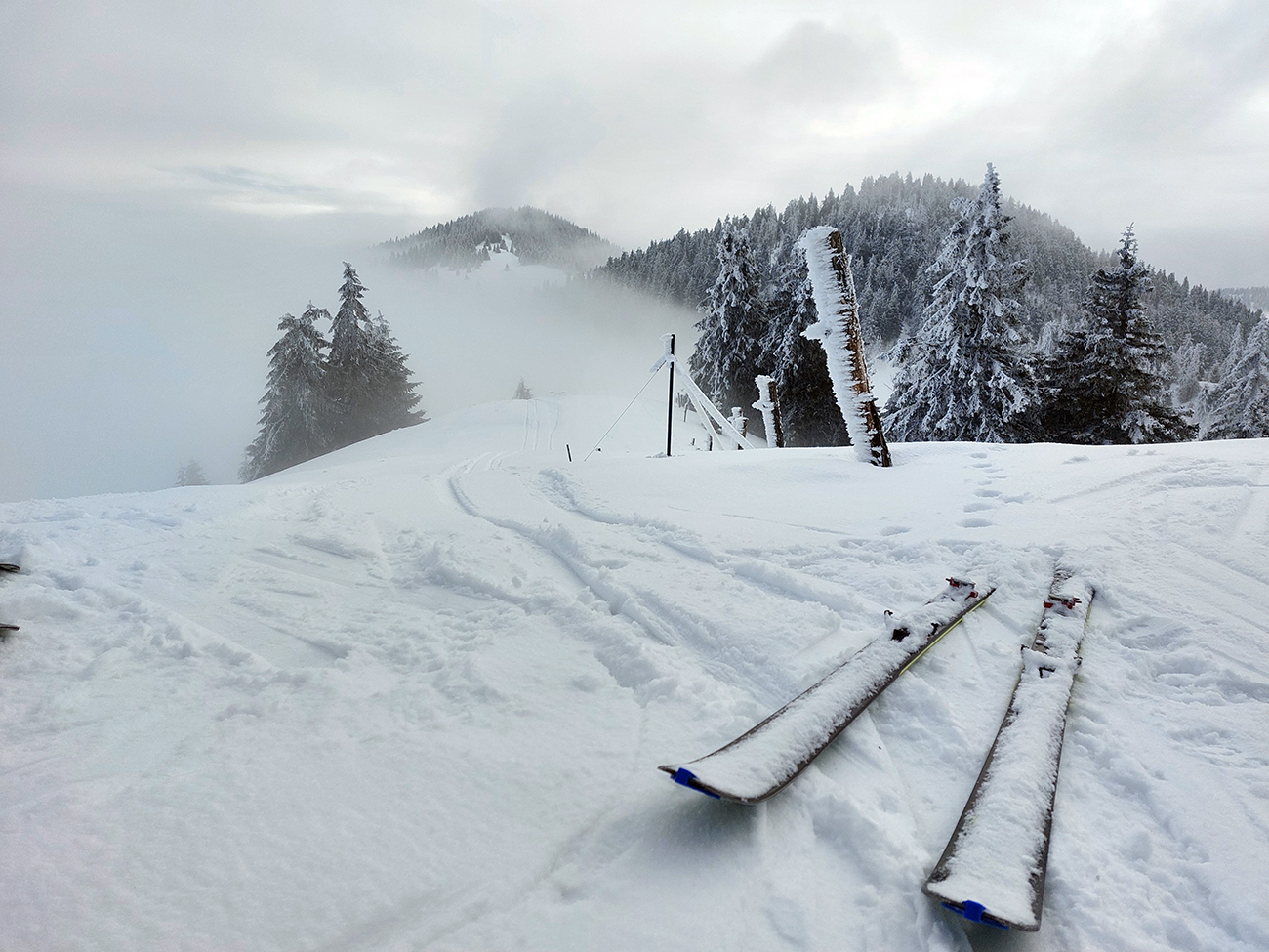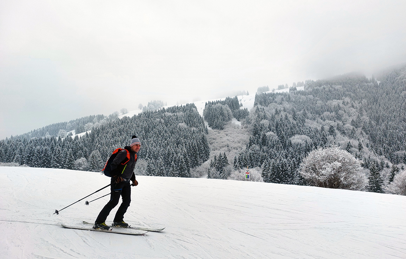Na „otočke“ sa hmla na chvíľu odporúča, tak rýchlo využívame a skúšame pár oblúkov dole lúkou. Dobré to je na túto biedu – na pevnom a drsnom firne nejaký cenťáčik nového snehu. Síce to škrípe, ale aj drží. Spúšťame až medzi stromy a keď už je úzko a strmo, otáčame nazad hore.