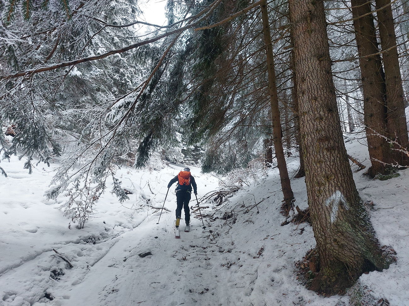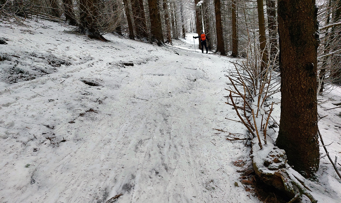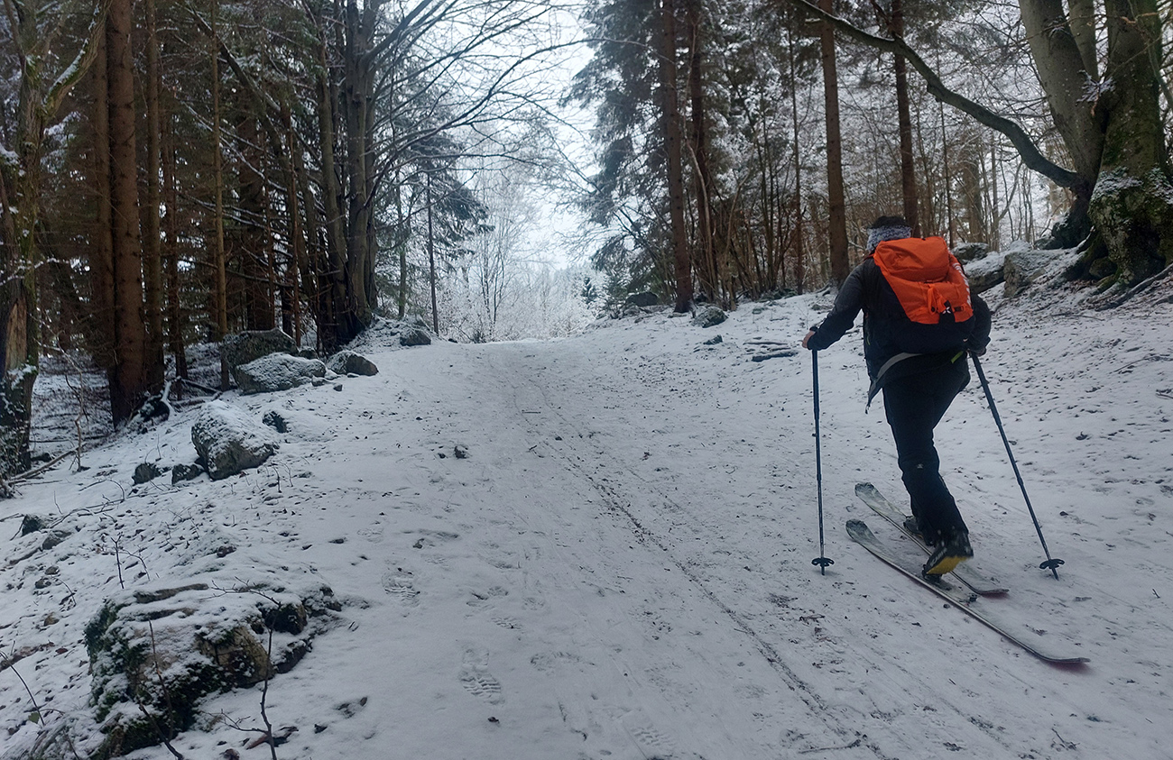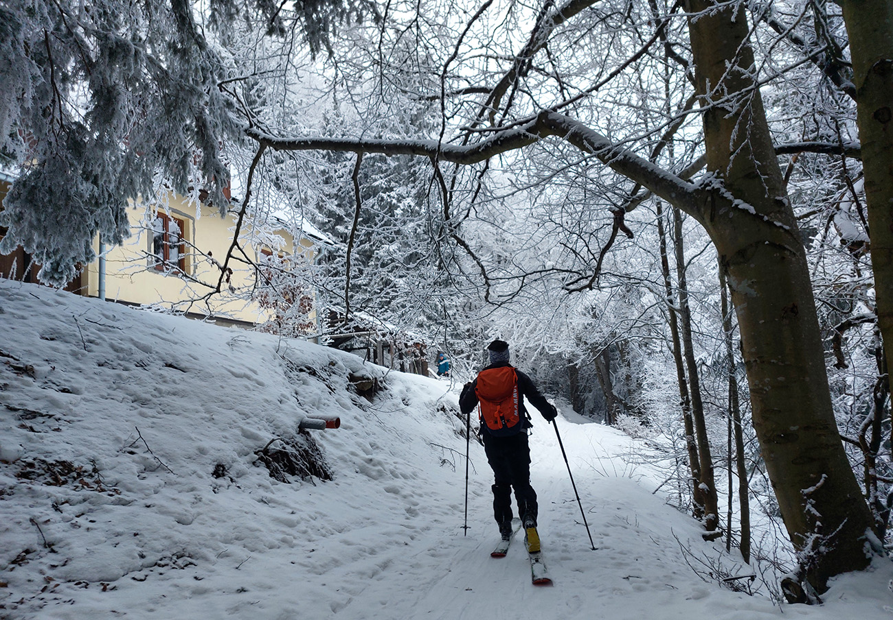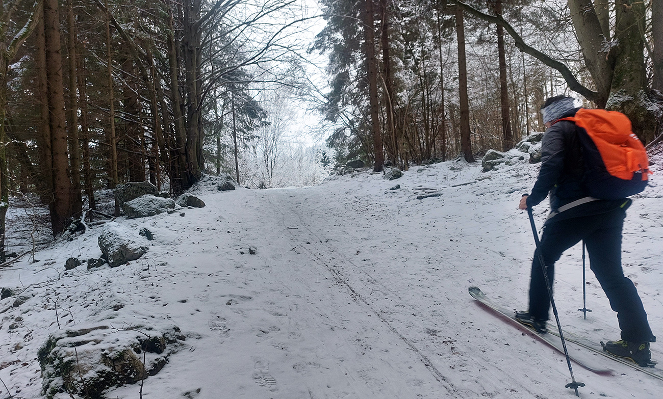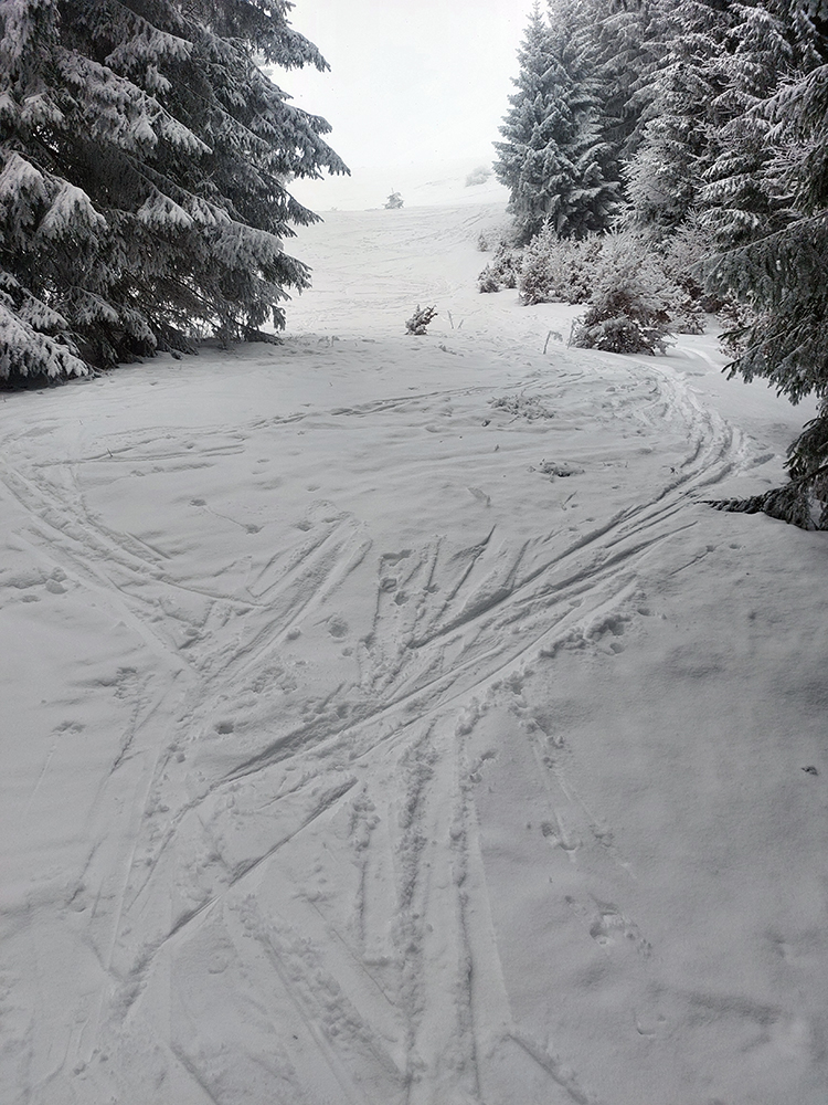 Rozpačitá zima, rozpačité počasie. Aladiny hlásia zamračené, vo vysokých polohách mliečno. V nižších nieto snehu, treba trafiť medzivrstvu! Sever Veľkej Fatry je na to ideálny, ideme ta. Chceli sme síce na Smrekovicu, ale zabudnuté reťaze, tak radšej len do Hrabova a odtiaľ hore. Aj s garanciou pohodlného zlyžovania potom dole. Takže po krátkom pešovaní od „Skialp Parkingu“ naskakujeme do lyží pod lanovkou a po chvíli ťapkania po piste už točíme doľava na Medvediu cestu. Posnežilo asi milimeter, zakrylo medvedie kamienky, ale len tak esteticky, začiatok nie je príjemný. No rýchlo sa to zlepšuje. Ešte krátky a strmší úsek pred východom na Vlkolínske lúky je plný kameňov, ale smerom hore je to ok. Dole už by som tade nešiel.