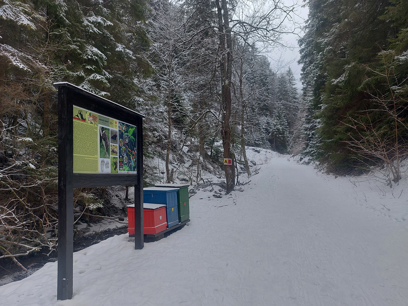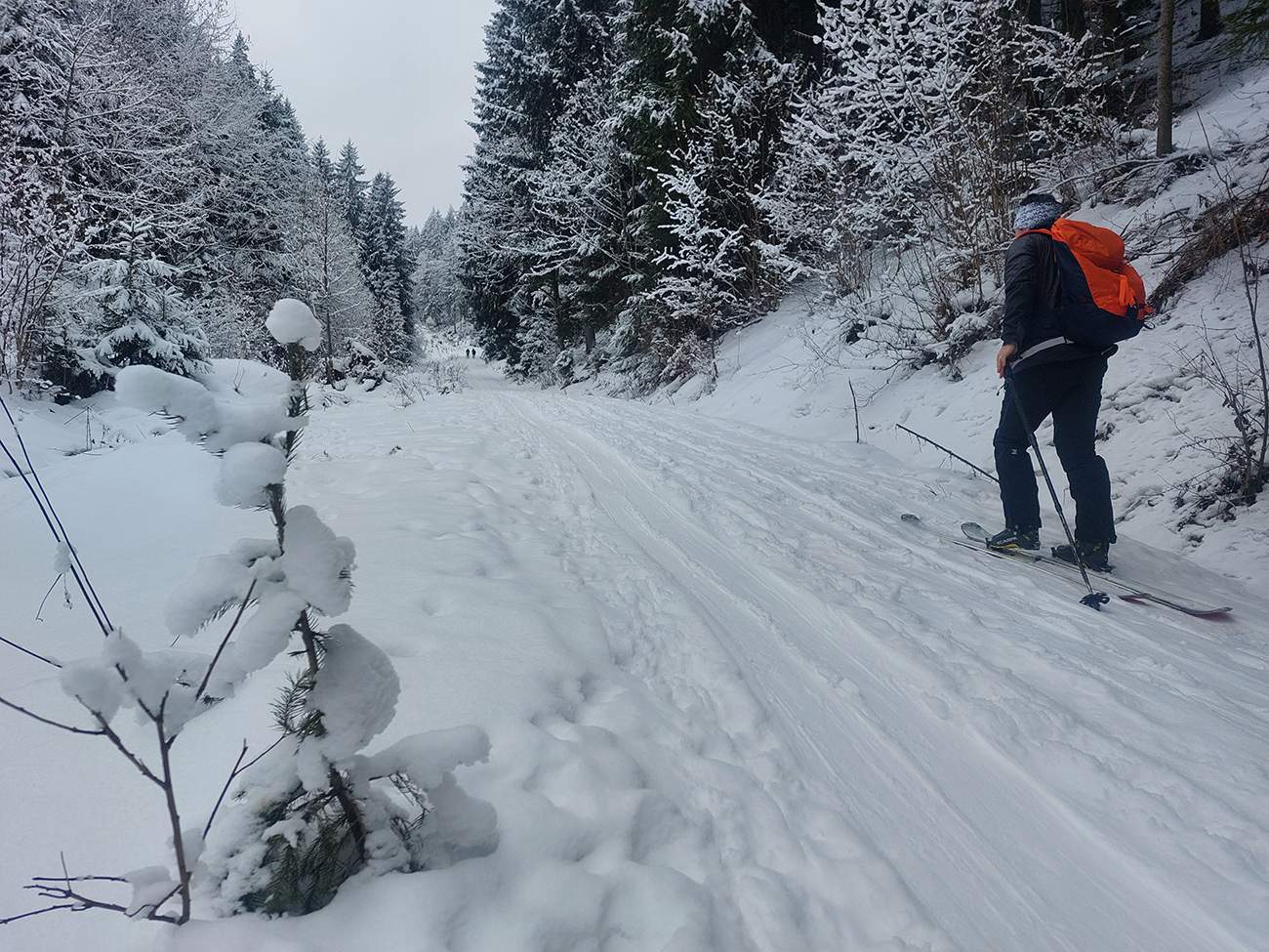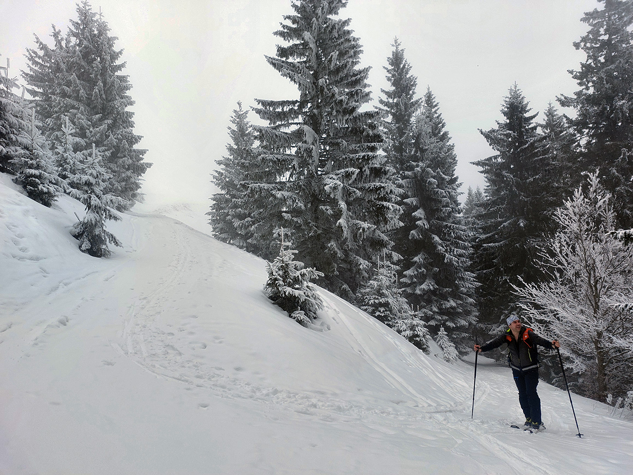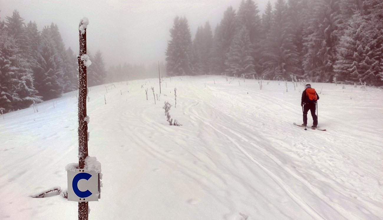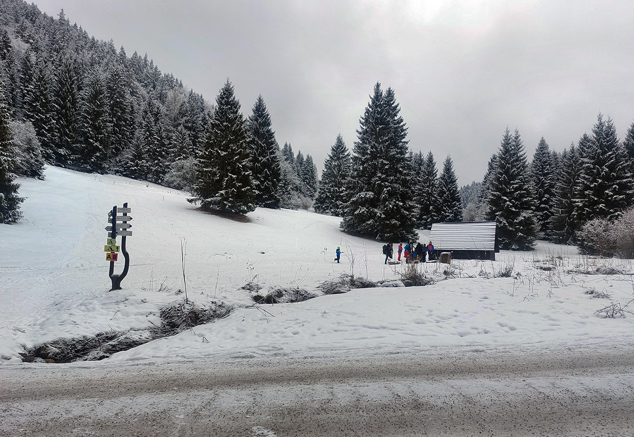 Rozpačitá zima, rozpačité počasie. Aladiny hlásia zamračené, vo vysokých polohách mliečno. V nižších nieto snehu, treba trafiť medzivrstvu! Sever Veľkej Fatry je na to ideálny, ideme ta. Chceli sme síce na Smrekovicu, ale zabudnuté reťaze, tak radšej len do Hrabova a odtiaľ hore. Aj s garanciou pohodlného zlyžovania potom dole. Takže po krátkom pešovaní od „Skialp Parkingu“ naskakujeme do lyží pod lanovkou a po chvíli ťapkania po piste už točíme doľava na Medvediu cestu. Posnežilo asi milimeter, zakrylo medvedie kamienky, ale len tak esteticky, začiatok nie je príjemný. No rýchlo sa to zlepšuje. Ešte krátky a strmší úsek pred východom na Vlkolínske lúky je plný kameňov, ale smerom hore je to ok. Dole už by som tade nešiel.