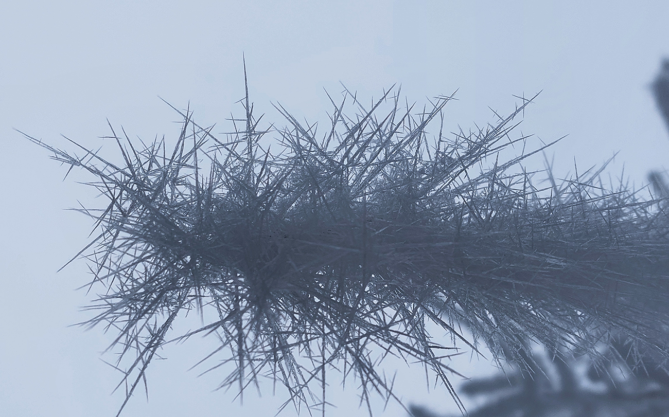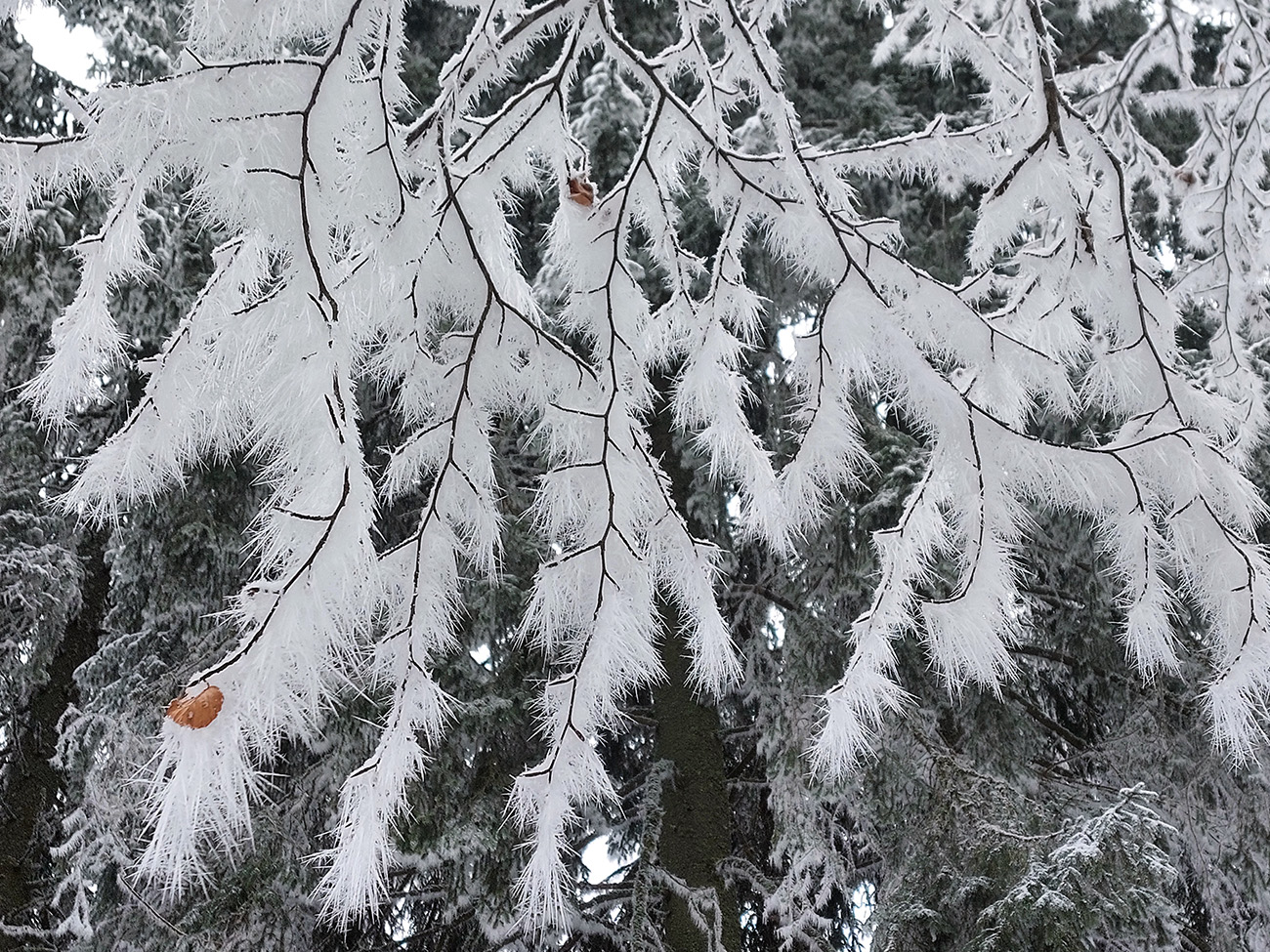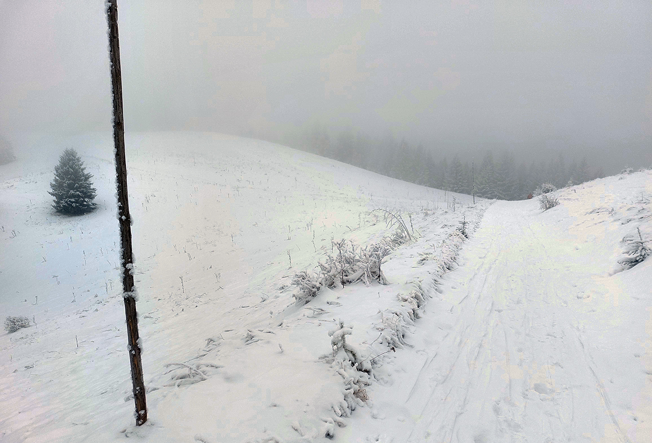 To už sme v mlieku a cestou po cyklotrase pod Šiprúň obzeráme mega dlhé námrazové ihličky na každom konári. Krajina omrznutá ako v rozprávke. Občas sa to niekde so šuchotom zosunie.