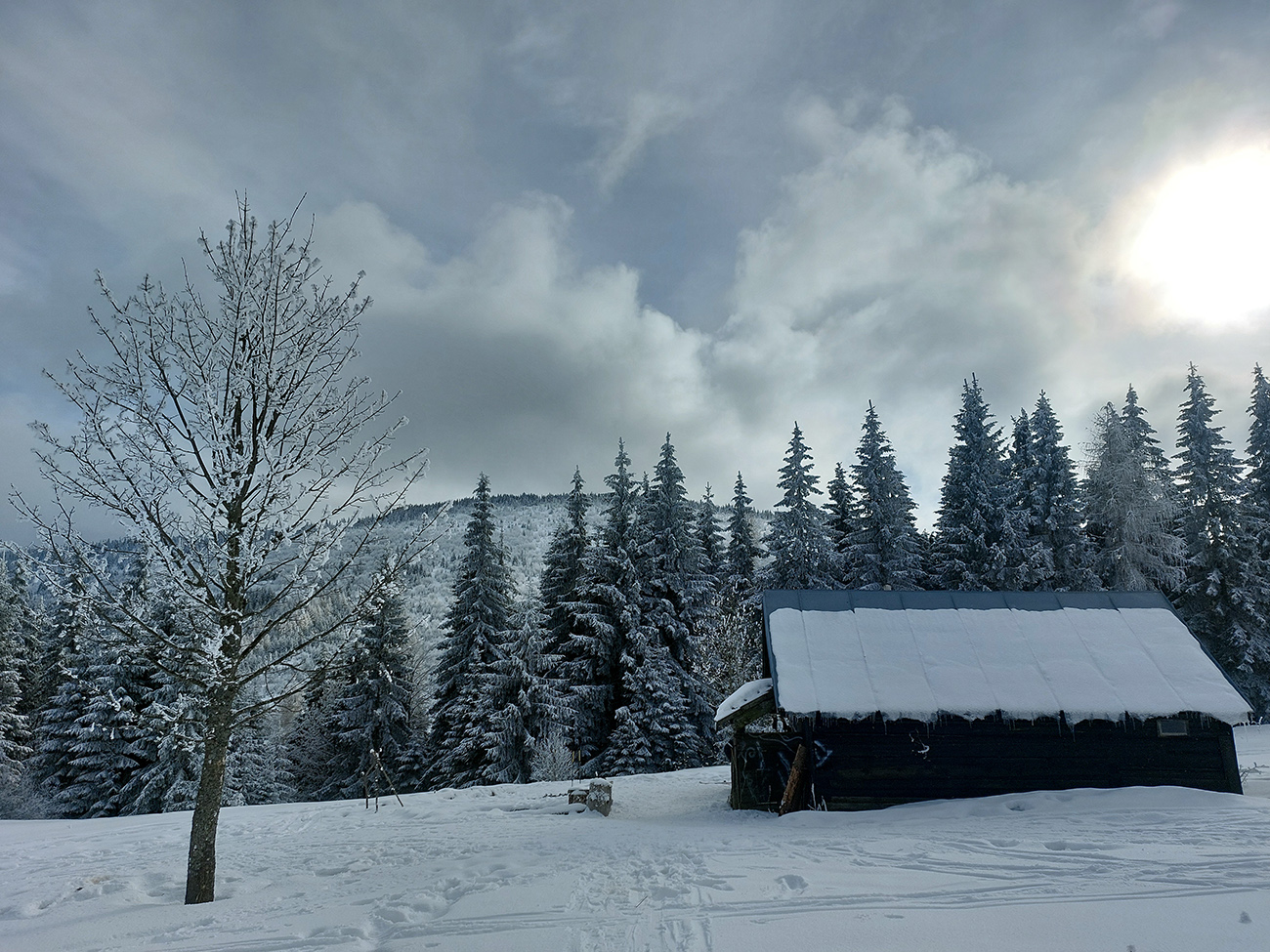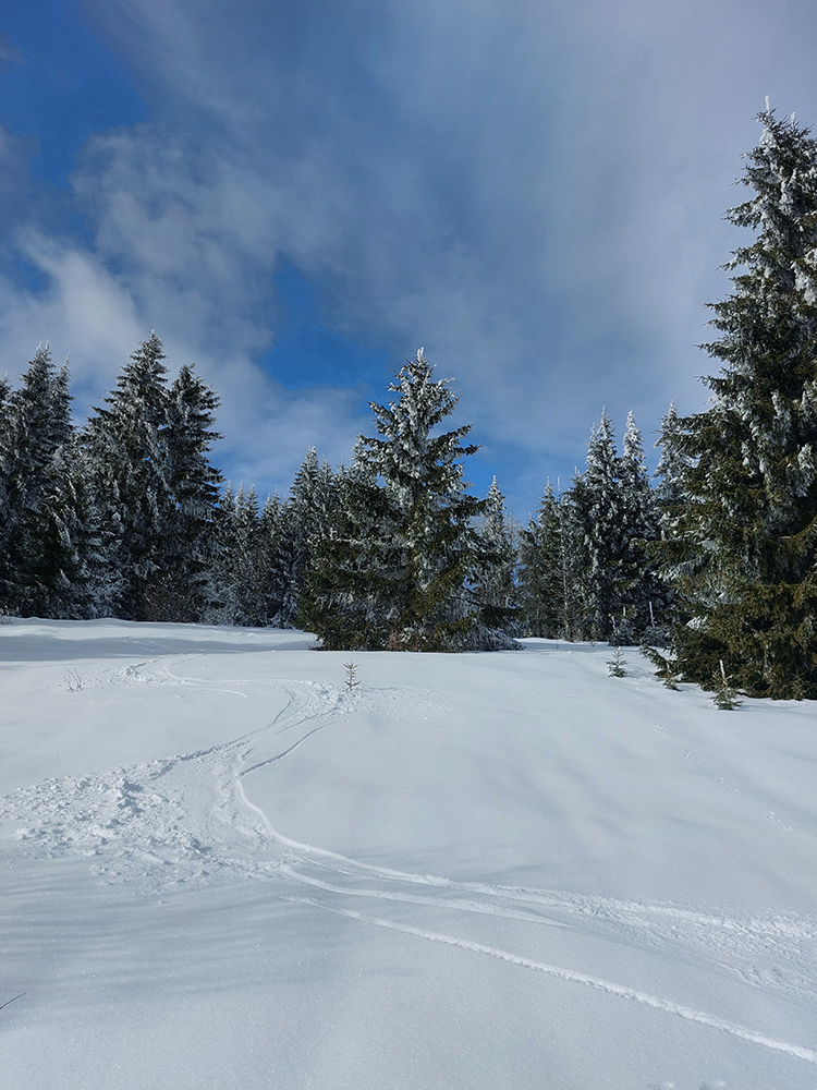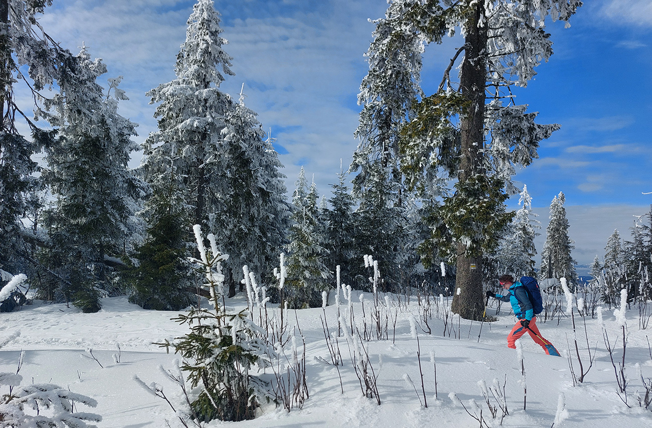 Potom už pohodlná šúchačka, skoro po vrstevnici. Zvyšky lesa obielené, počas takejto zimy to tam vyzerá stokrát lepšie ako v lete.