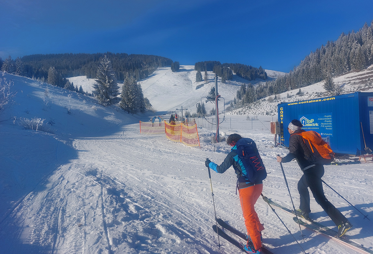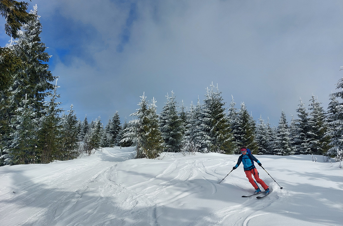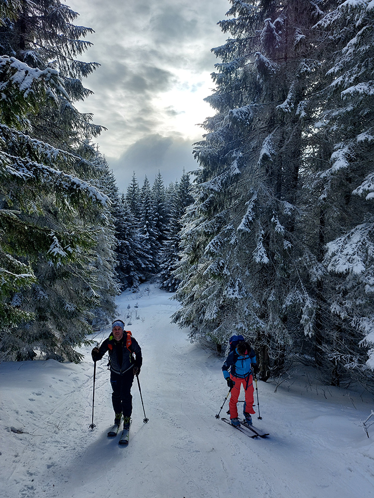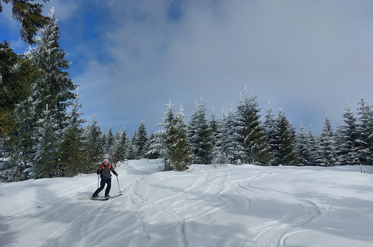A vôbec to po odmäkoch nebolo ľadové, na starom firne ľahký, premrznutý poprašok, pohodlné! Takže super aj neskôr, pri zjazdoch na pásoch – netrpeli chlpy na ľade a ticho bolo. Hore nad lesom pekný spätný výhľad na Tatry, kde sa ozaj na hrebeňoch dáke chuchvalce držali, zdalo sa: