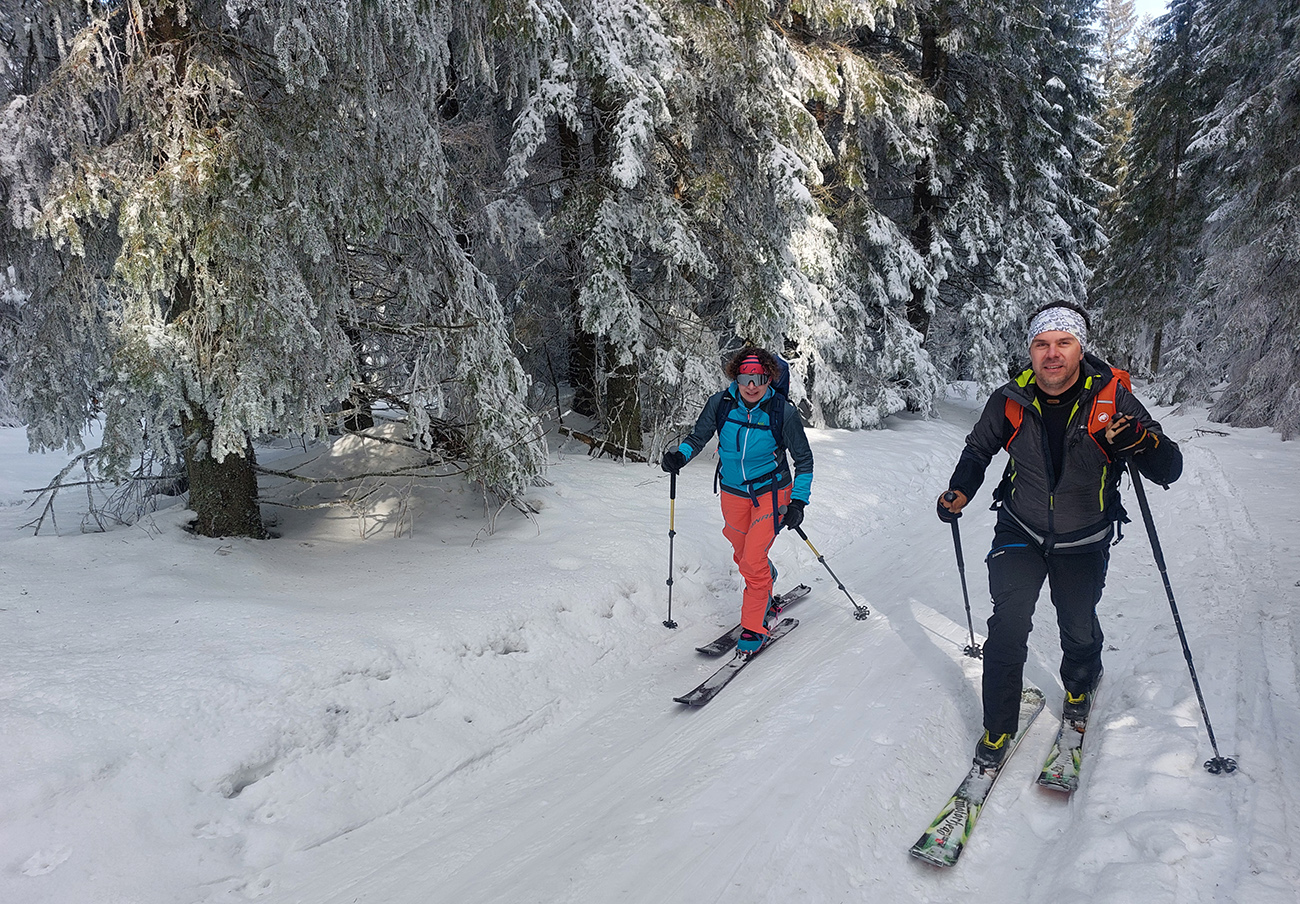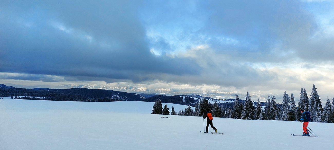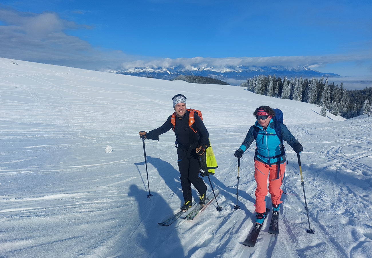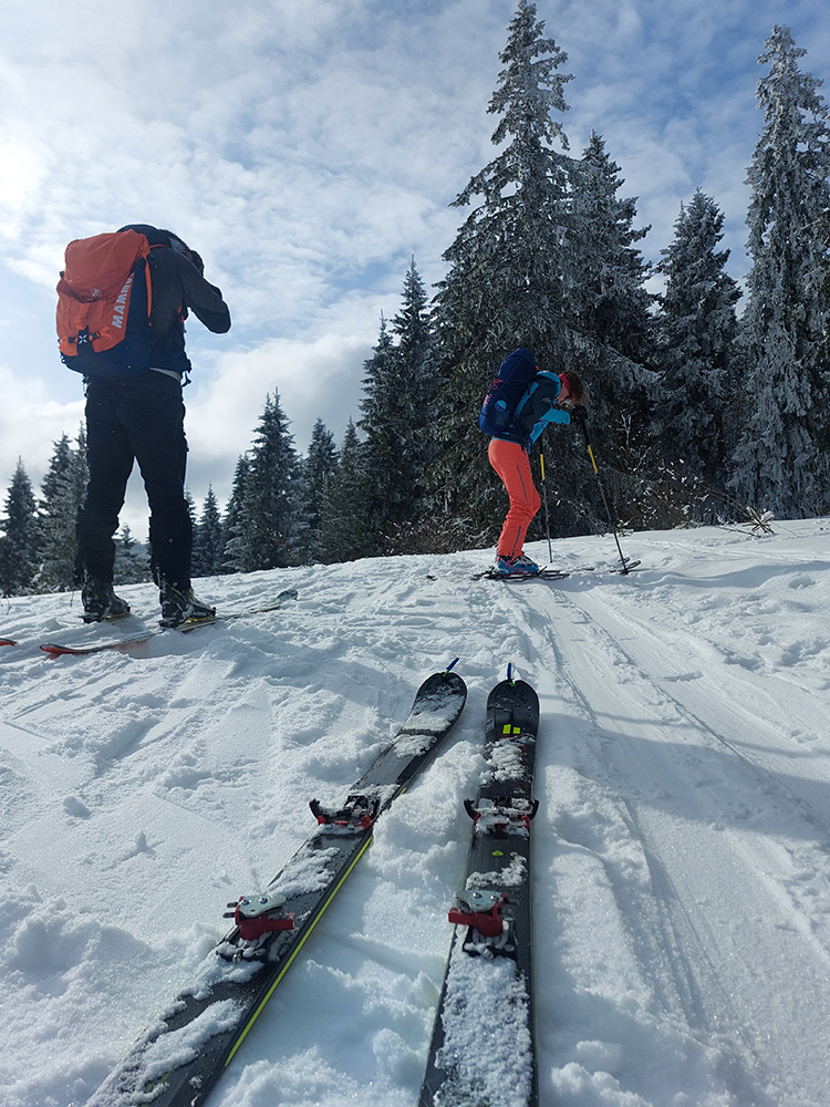 A vôbec to po odmäkoch nebolo ľadové, na starom firne ľahký, premrznutý poprašok, pohodlné! Takže super aj neskôr, pri zjazdoch na pásoch – netrpeli chlpy na ľade a ticho bolo. Hore nad lesom pekný spätný výhľad na Tatry, kde sa ozaj na hrebeňoch dáke chuchvalce držali, zdalo sa: