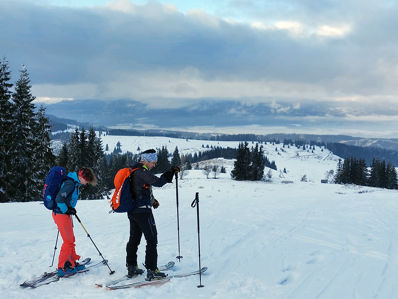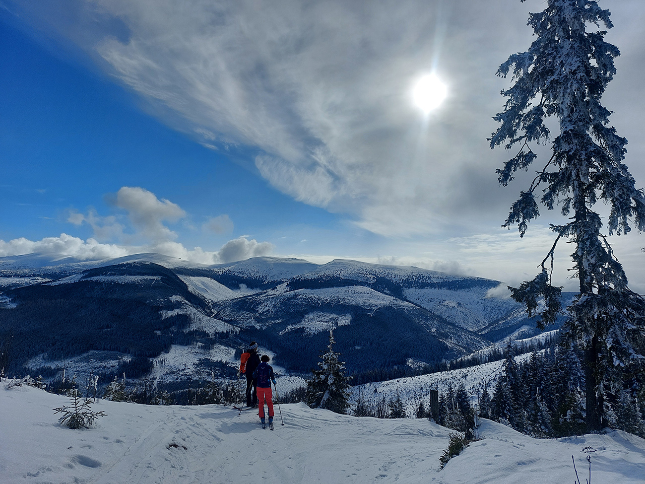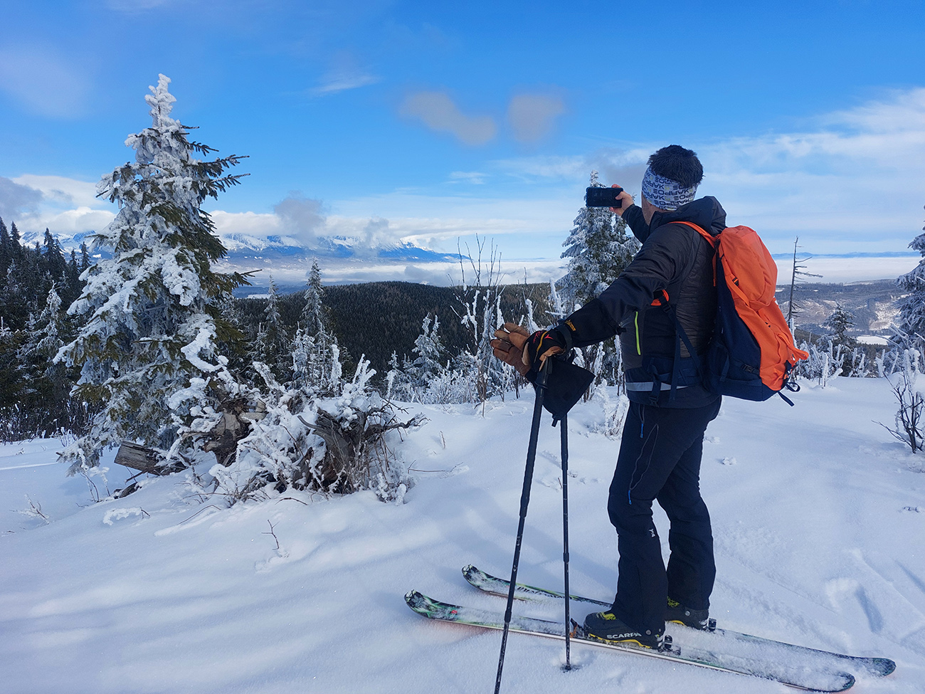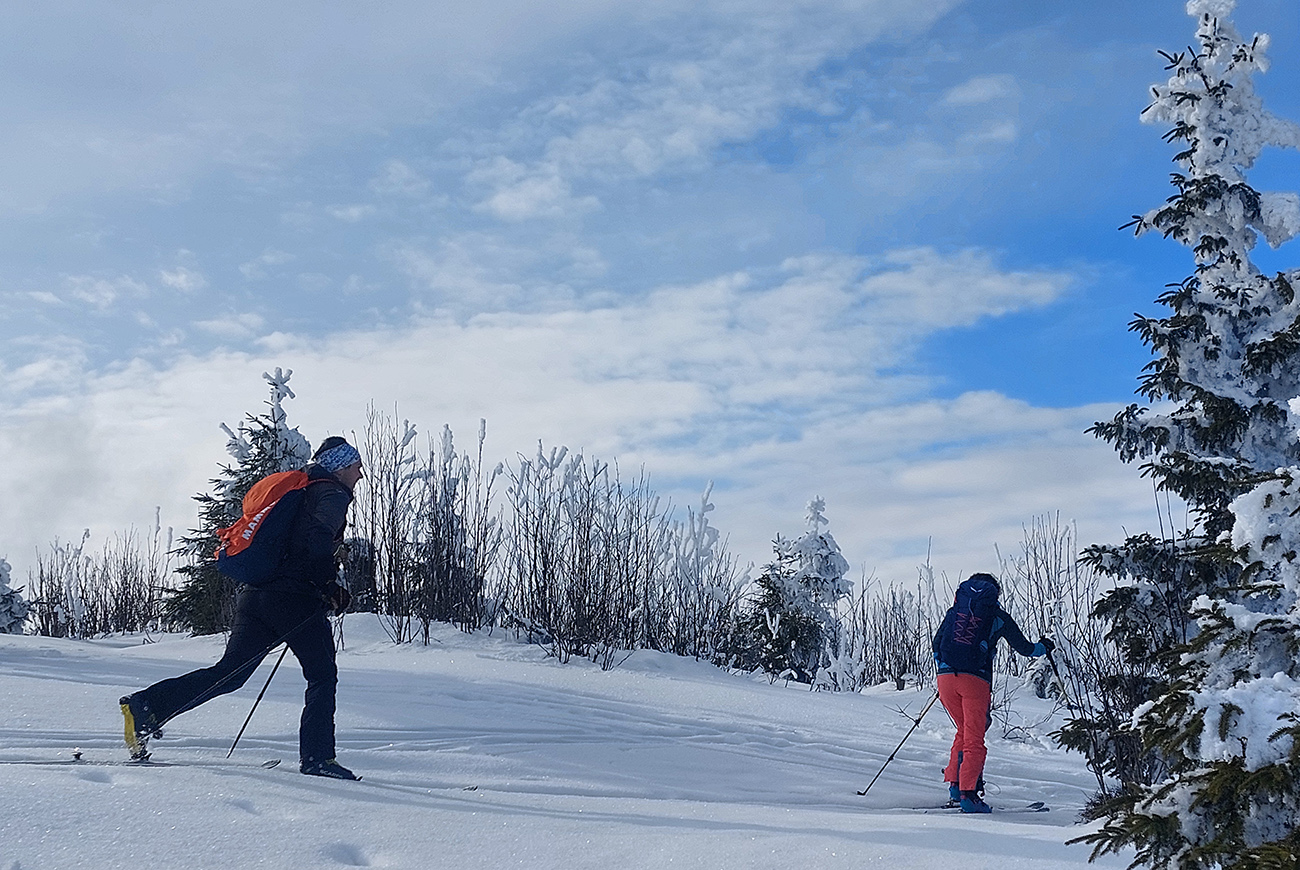 A vôbec to po odmäkoch nebolo ľadové, na starom firne ľahký, premrznutý poprašok, pohodlné! Takže super aj neskôr, pri zjazdoch na pásoch – netrpeli chlpy na ľade a ticho bolo. Hore nad lesom pekný spätný výhľad na Tatry, kde sa ozaj na hrebeňoch dáke chuchvalce držali, zdalo sa: