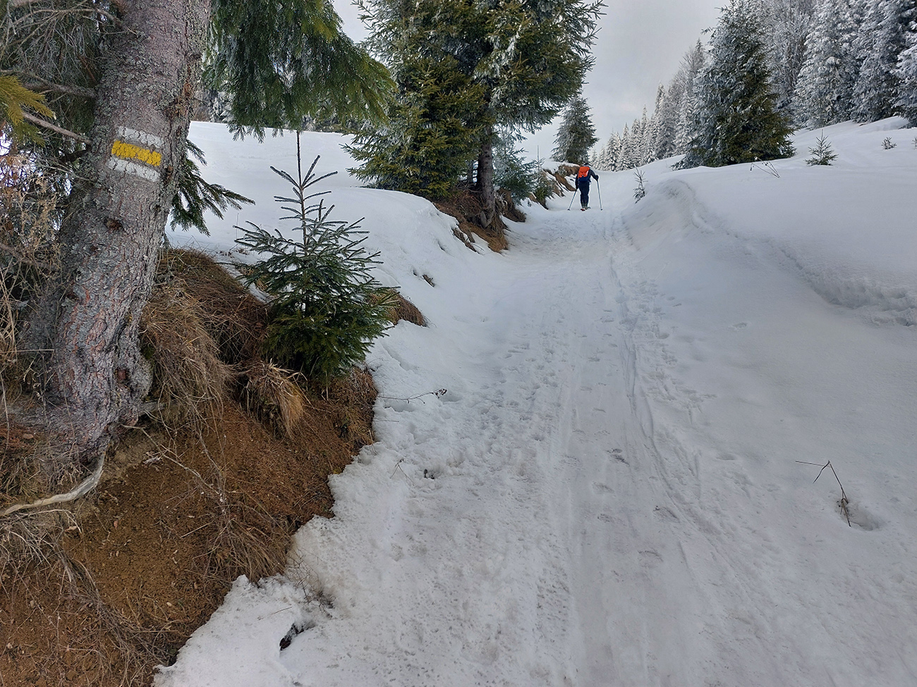 Tak hybaj nazad, a ozaj sme si po chvíli užili aj krátku síce, ale príjemnú lyžovačku popri žltej značke na dno doliny. Stále tvrdo a hladko, na tom pár cenťákov iskrivého, premrznutého páperia.