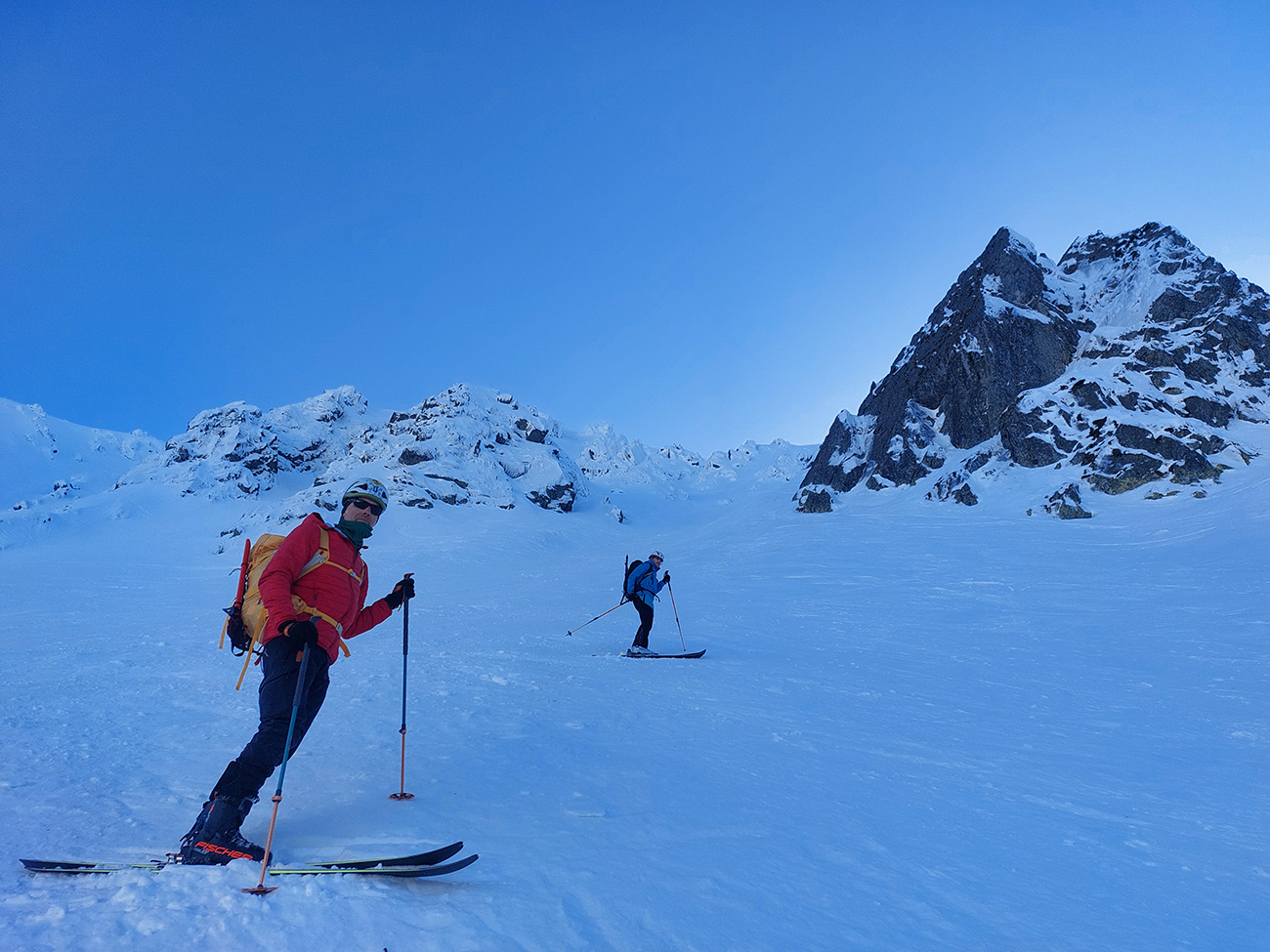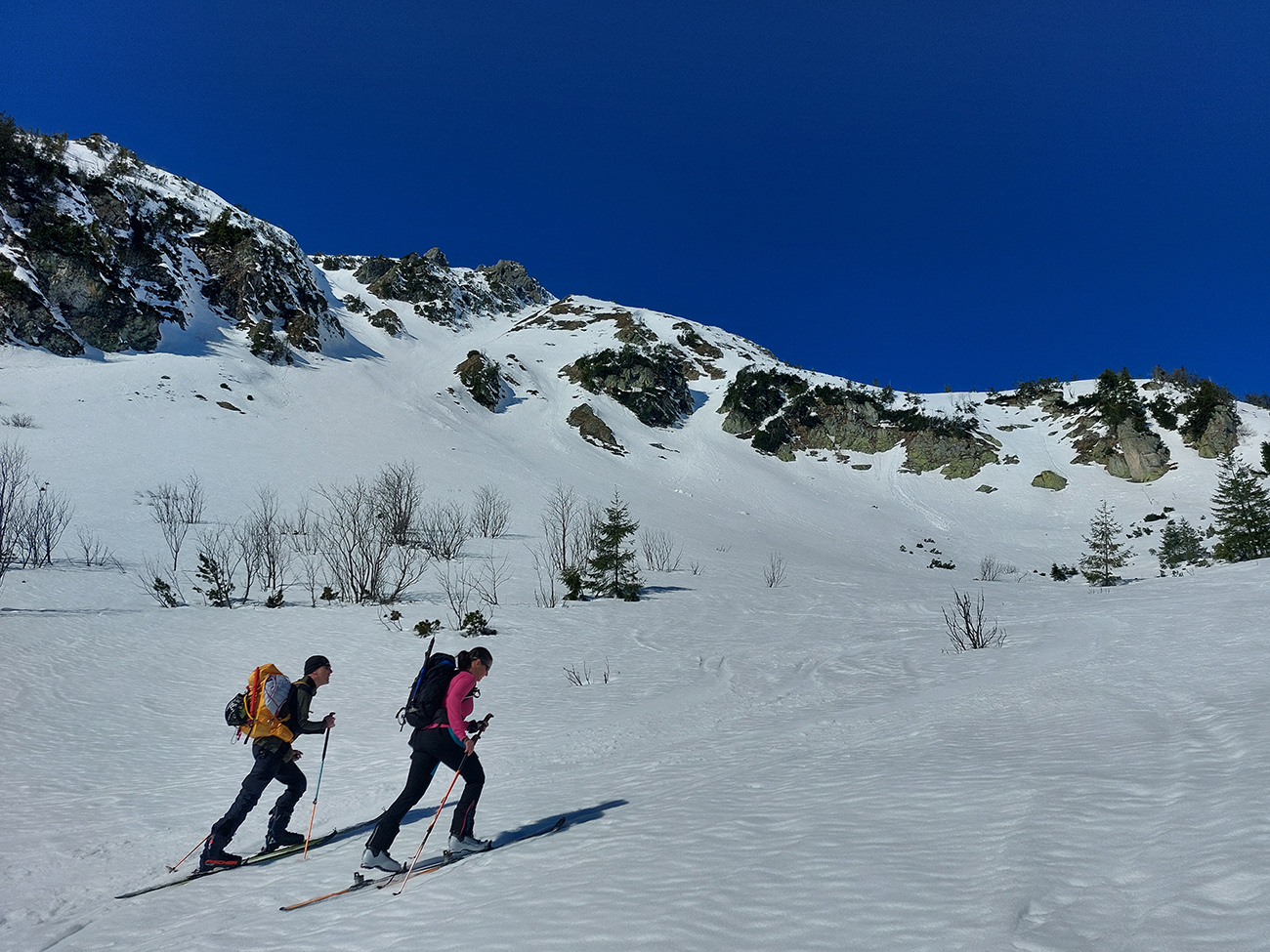Výšľapy boli aj celkom výživné v tom teple, tak teda že mizneme do tieňov a domov. Takže sme sa prepotácali po hrebeni na Dereše a takmer z ich vrcholu sme to rubli kúsok dole po severnom rebre medzi východným a stredným kotlom – aby sme zatočili doprava, do hlbokej modrej polotmy vari hneď druhého žľabu.
